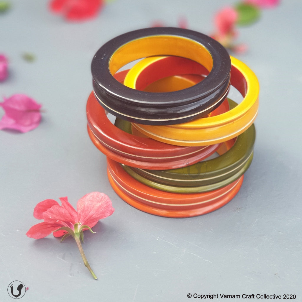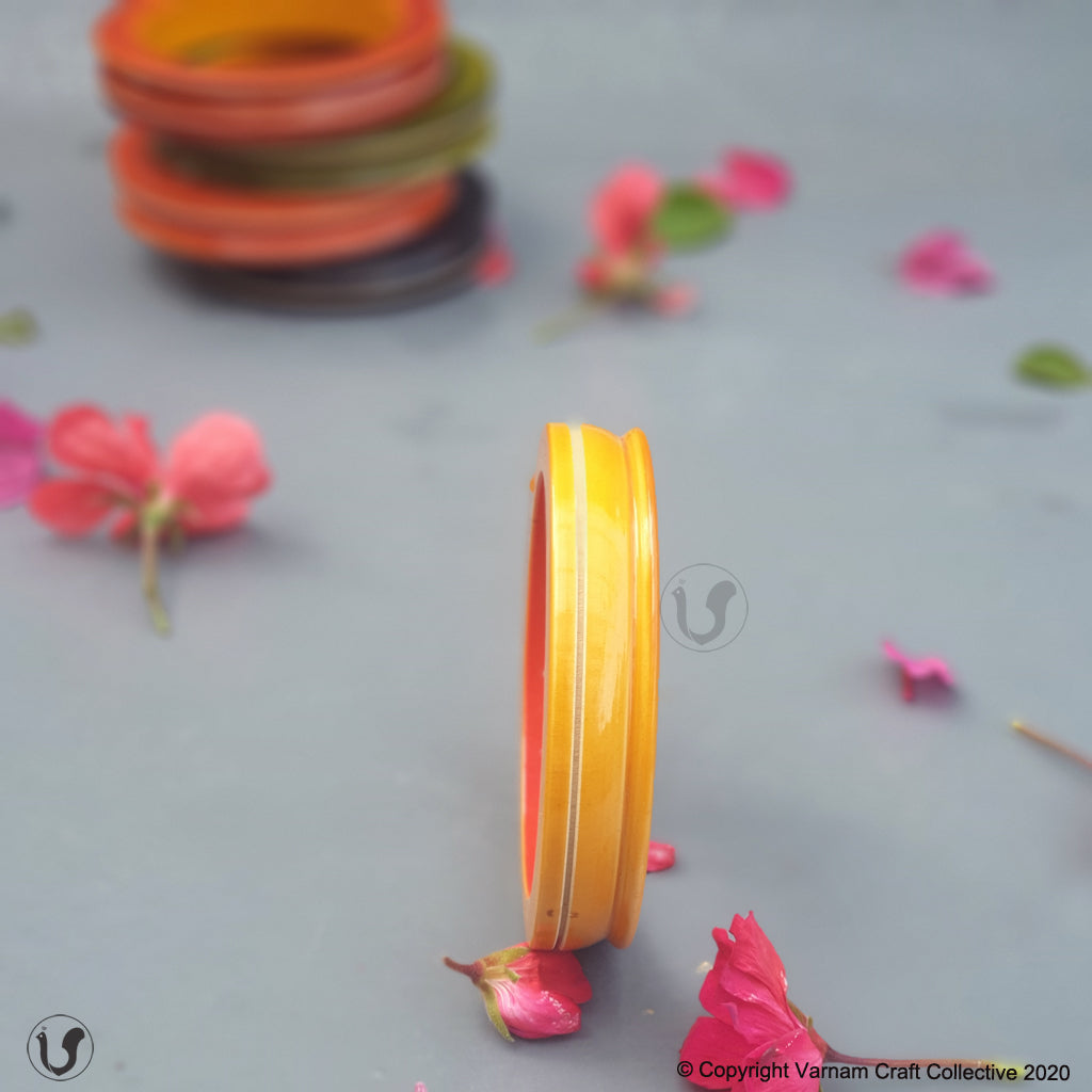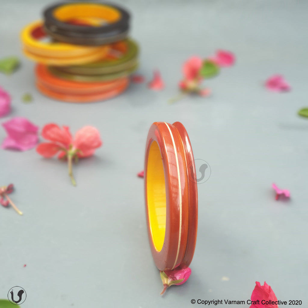A unique one-of-a-kind style statement from the 'INBAM" series of wooden jewelry by Varnam. This piece has been handcrafted by artisans from Channapatna using the 200 year old toy craft of lac turnery. This is an eco-friendly craft. The colours used are natural dyes and non-toxic. The wood used , 'wrightia tinctoira' or ‘aale-maraa’ is extremely safe. Known for its medicinal properties, the wood is extremely lightweight. Please note that the colour may vary a bit from the one in the pic.