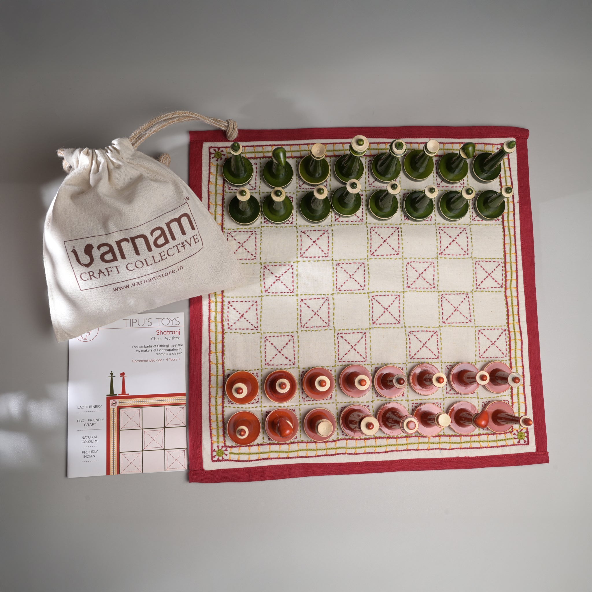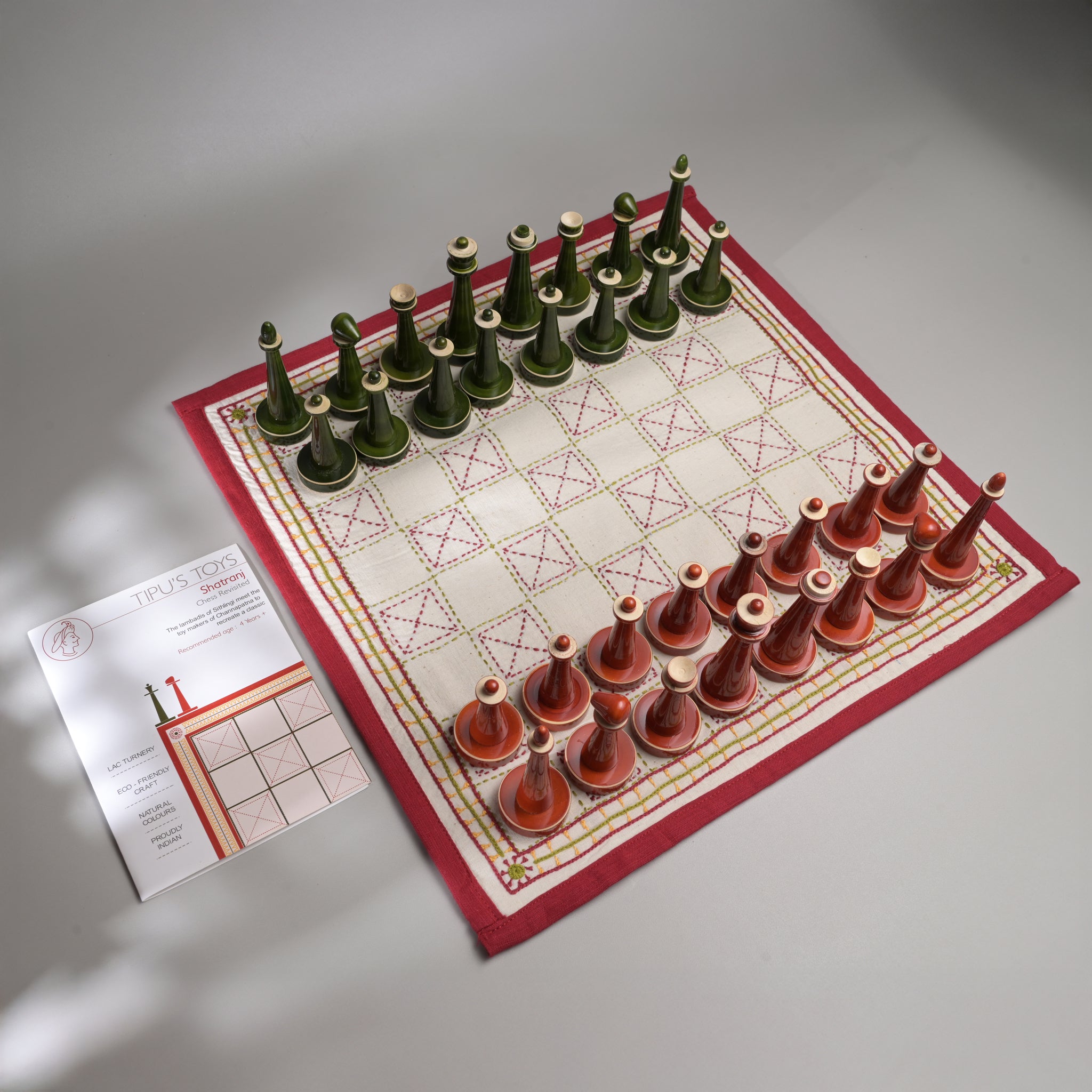 This product is a result of the ME to WE project, an initiative by A Hundred Hands, an NGO that encourages craftspeople across crafts, media and geographies to collaborate on design and innovation. The popular chess game is thus a fusion of two crafts, the lightweight, wooden pawns handcrafted by our artisans from channapatna and the beautiful mats, custom-embroidered by Porgai, a producer group of Lambadi women from Sitlingi, Tamil Nadu. This games comes with a lovely custom-made handblock-printed potli (a cloth bag), the embroidered mat and 32 wooden pawns.