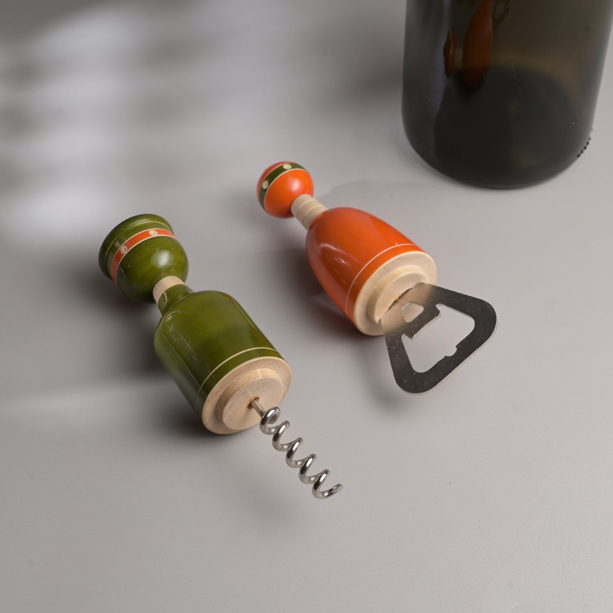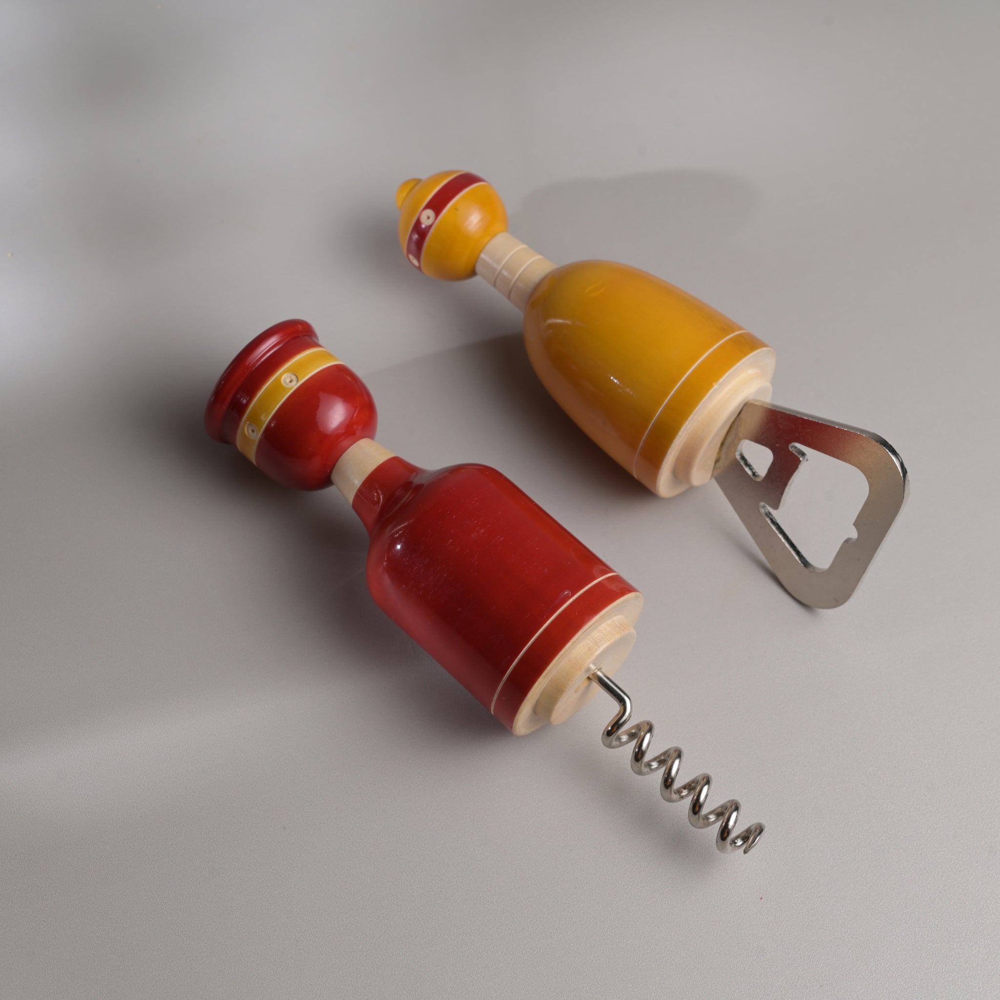 The CHANNAPATNAIKS are a family of loonies that are here to keep a lid on your high spirits. A pair of wooden bottle and cork opener , each has been hand-crafted by an artisan from Channapatna using the traditional craft of lac-turnery. The colours used are 100% natural. These colourful vibrant bar accessories make great gifts.