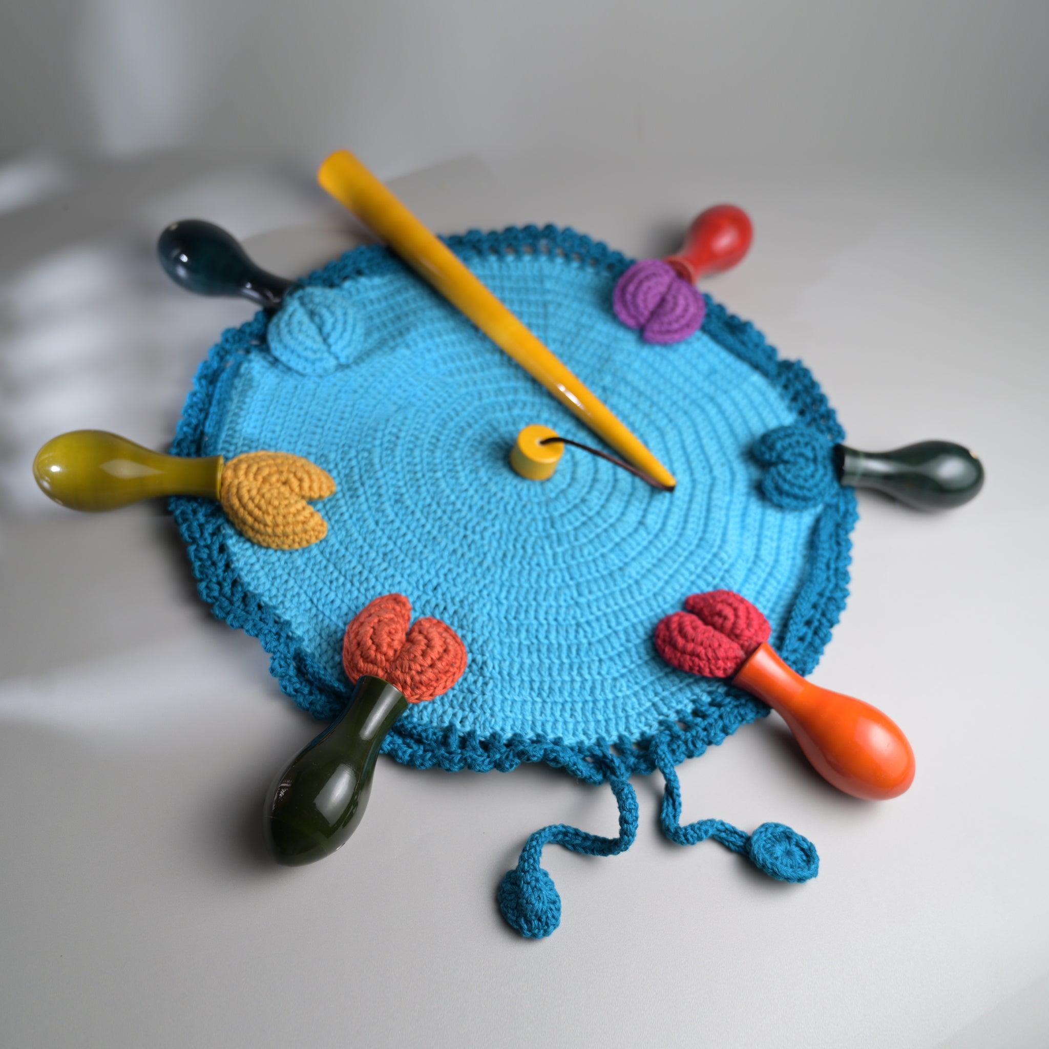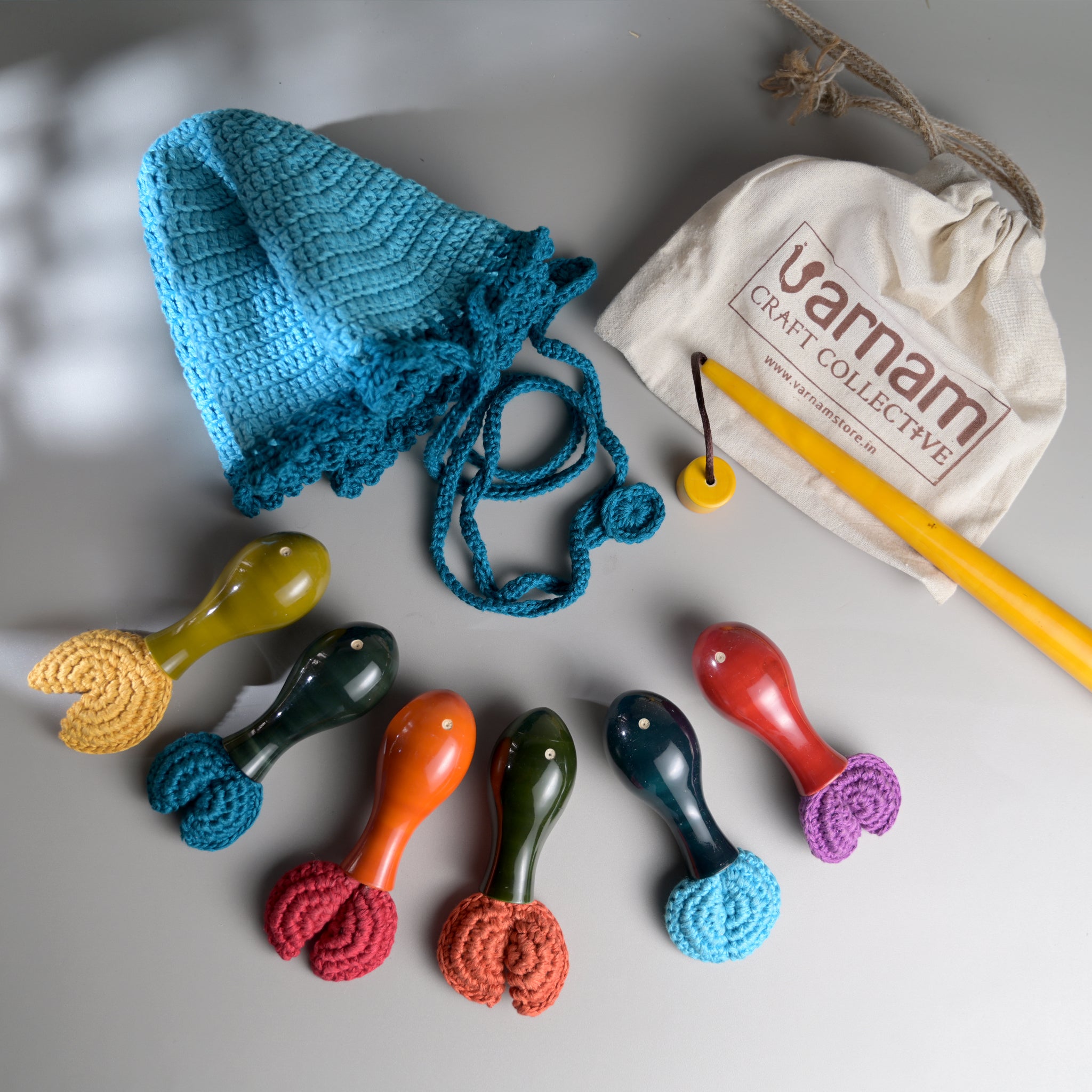 Mon Ami Foundation and Varnam Craft Collective bring in a new range of handmade designs that push the crafts forward. These designs are a playful symphony of two colourful and distinct crafts, Crochet and Channapatna Lac-turnery.
