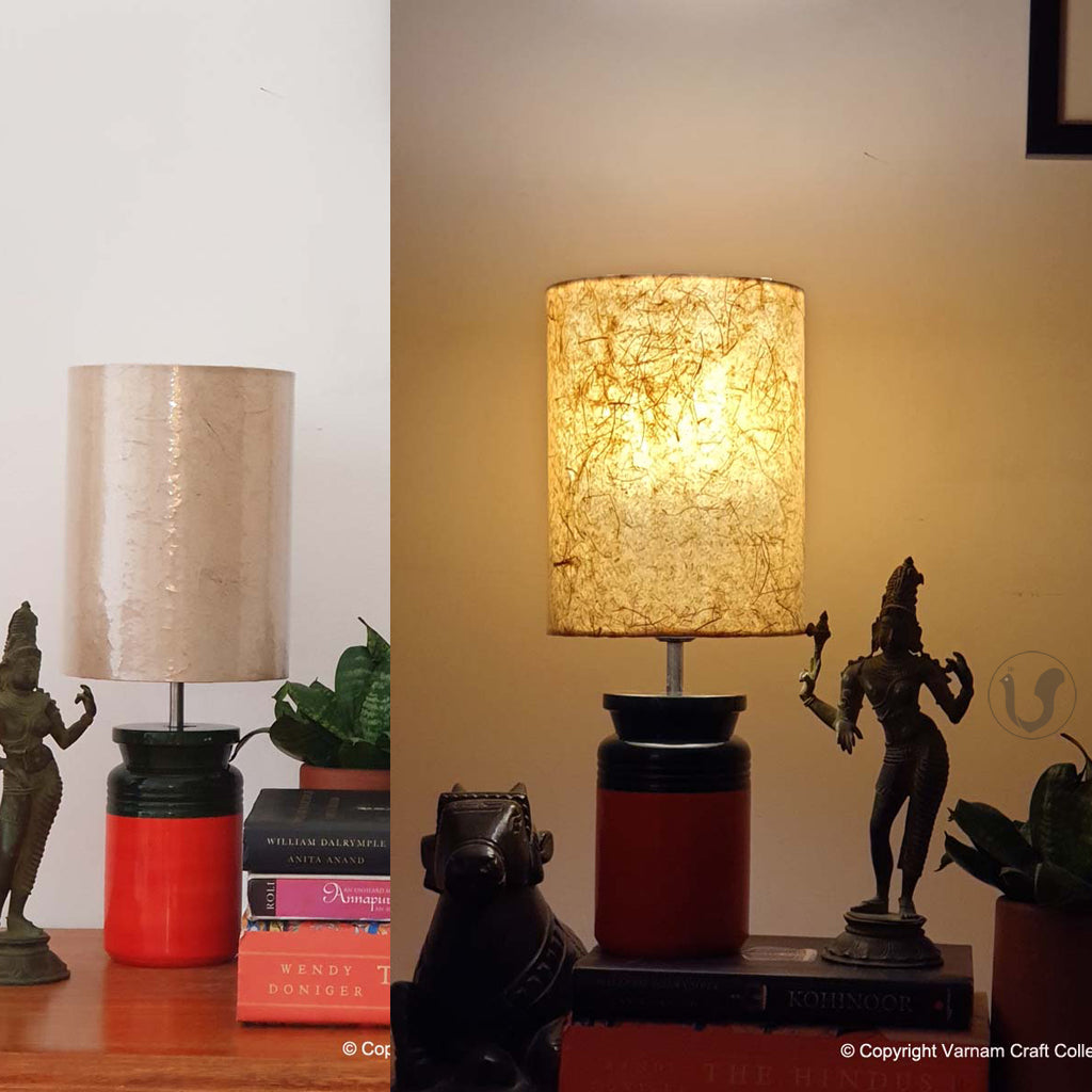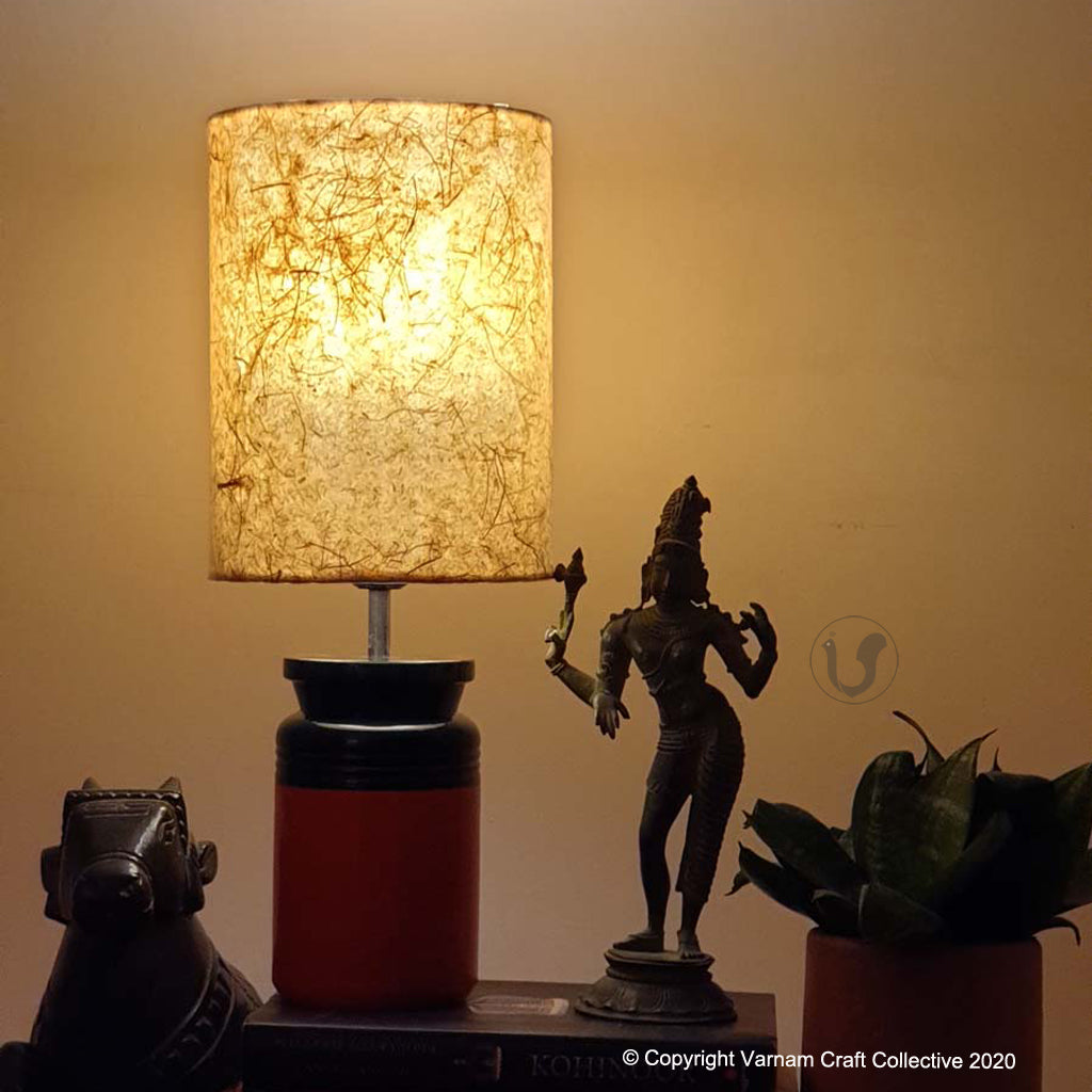 Our attempt to reinterpret the traditional toy craft of Channapatna translates to these one-of-a-kind statement lighting. This compact lamp is perfect to create some much needed mood lighting in the corners of your room. They also make great bedside table lamps especially in pairs.  The fittings are of export quality. The cylindrical drum shade is made of handmade paper that emits light beautifully.