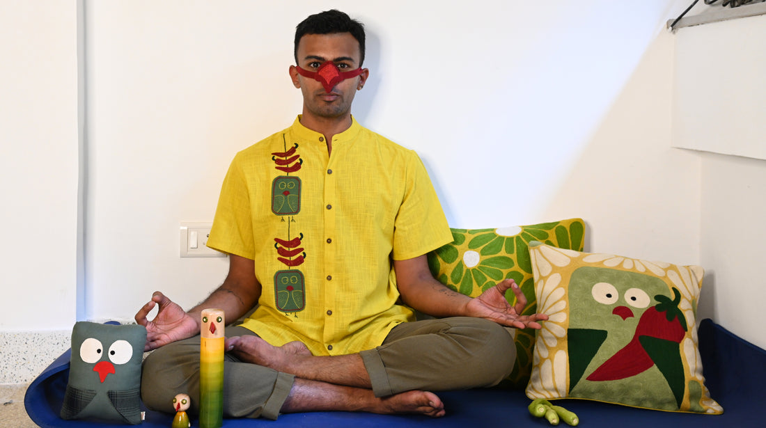 You will almost always find him meditating beside a string of green chillis and lemon, his little superstition against the evil eye. A fiery green chilli is his constant companion—he nibbles at it through the day, finding both comfort and calm in its spice.