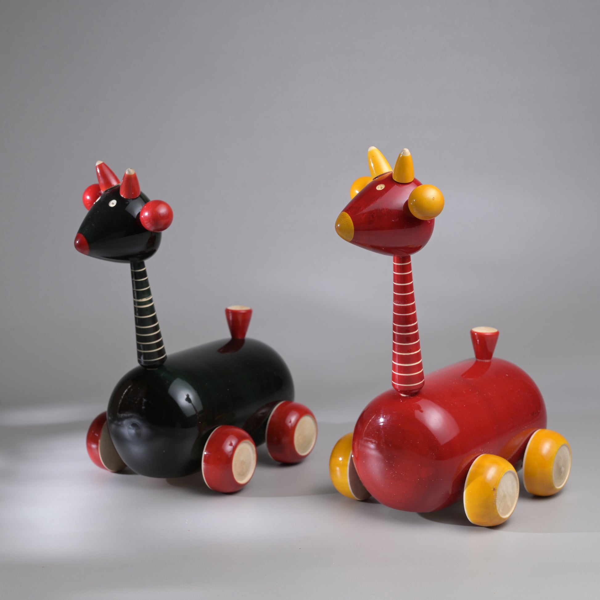 The giraffe family is here to add that extra charm to your child's nursery. Made from wrightia-tinctoria using the 200year old toy-craft of lac-turnery from Channapatna, the wood is extremely safe and known for its medicinal properties. The colours used are natural dyes and non-toxic. Please note that the price indicated is for one toy only.