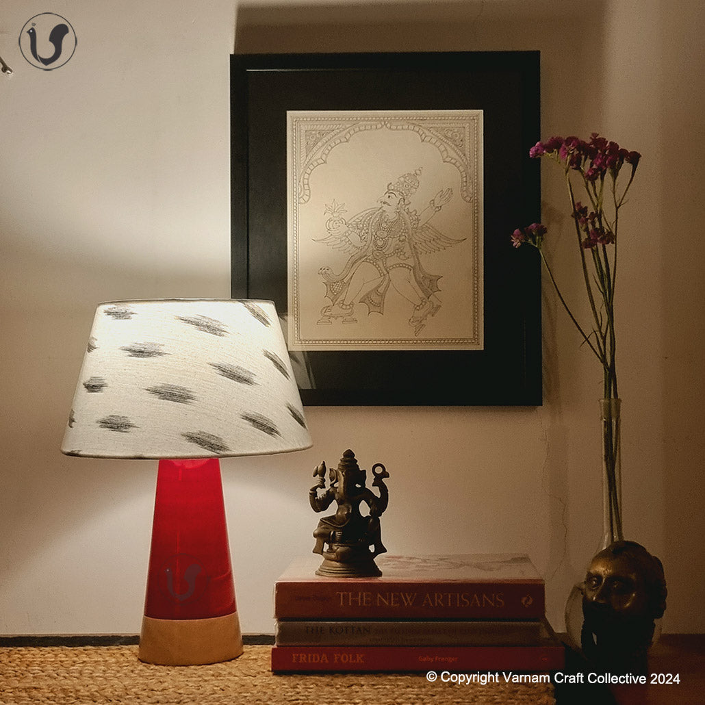 The shade is made of premium handwoven ikat from the Koyyalagudem village in Andhra Pradesh. The wooden base is a scandinavian inspired sleek and contemporary design, made of Wrightia tinctoria, a medicinal plant and handturned in Channapatna, Karnataka. This product is thus a fusion of two beautiful crafts from South India.