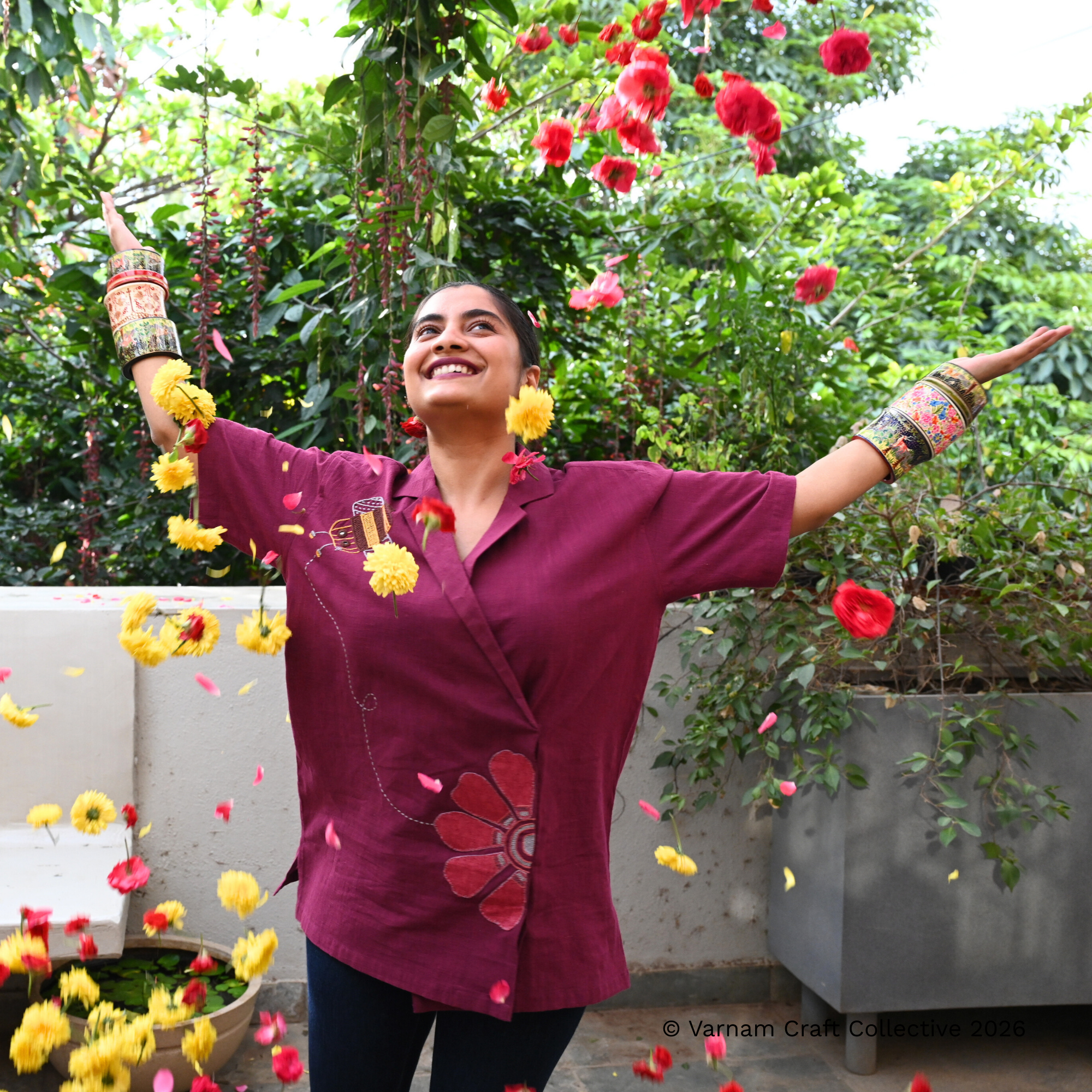 This gender-neutral side buttoned cuban shirt is made from Kanchi cotton fabric with detailed hand embroidery by the Lambadi women of Sitlingi, Tamil Nadu.