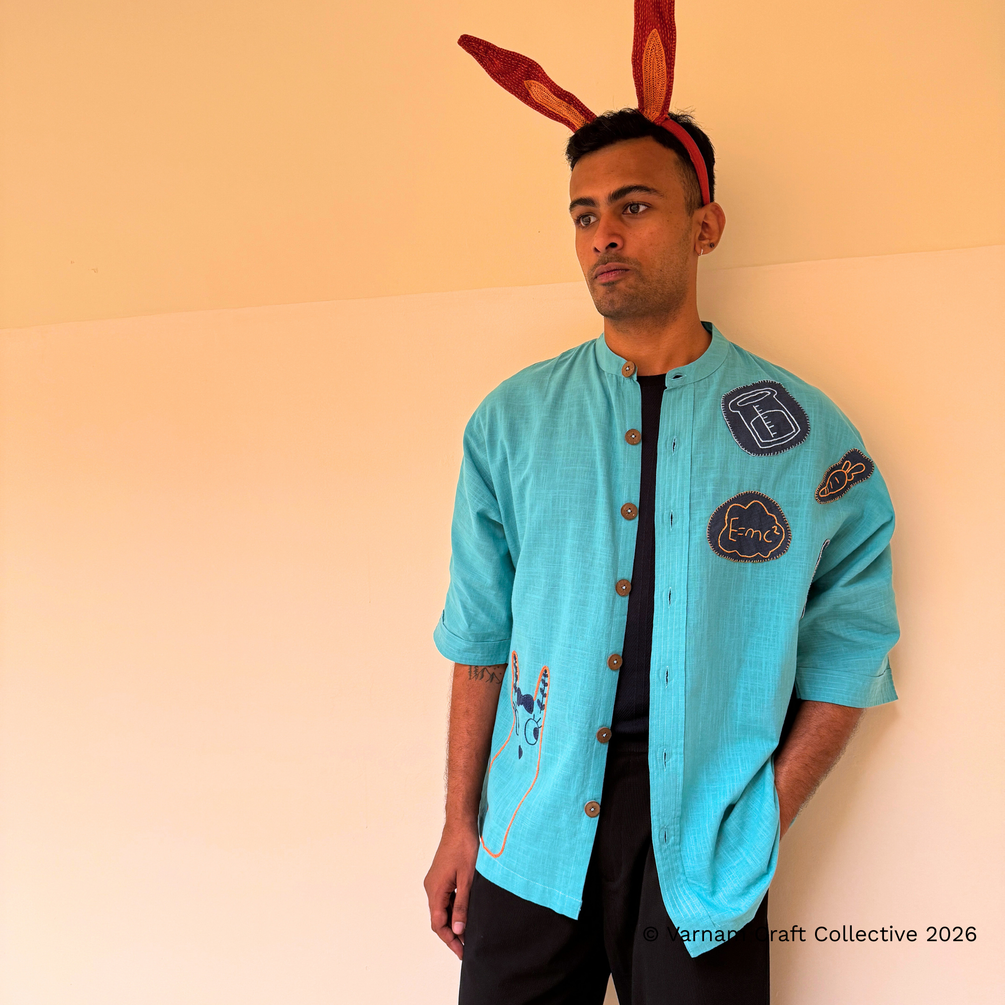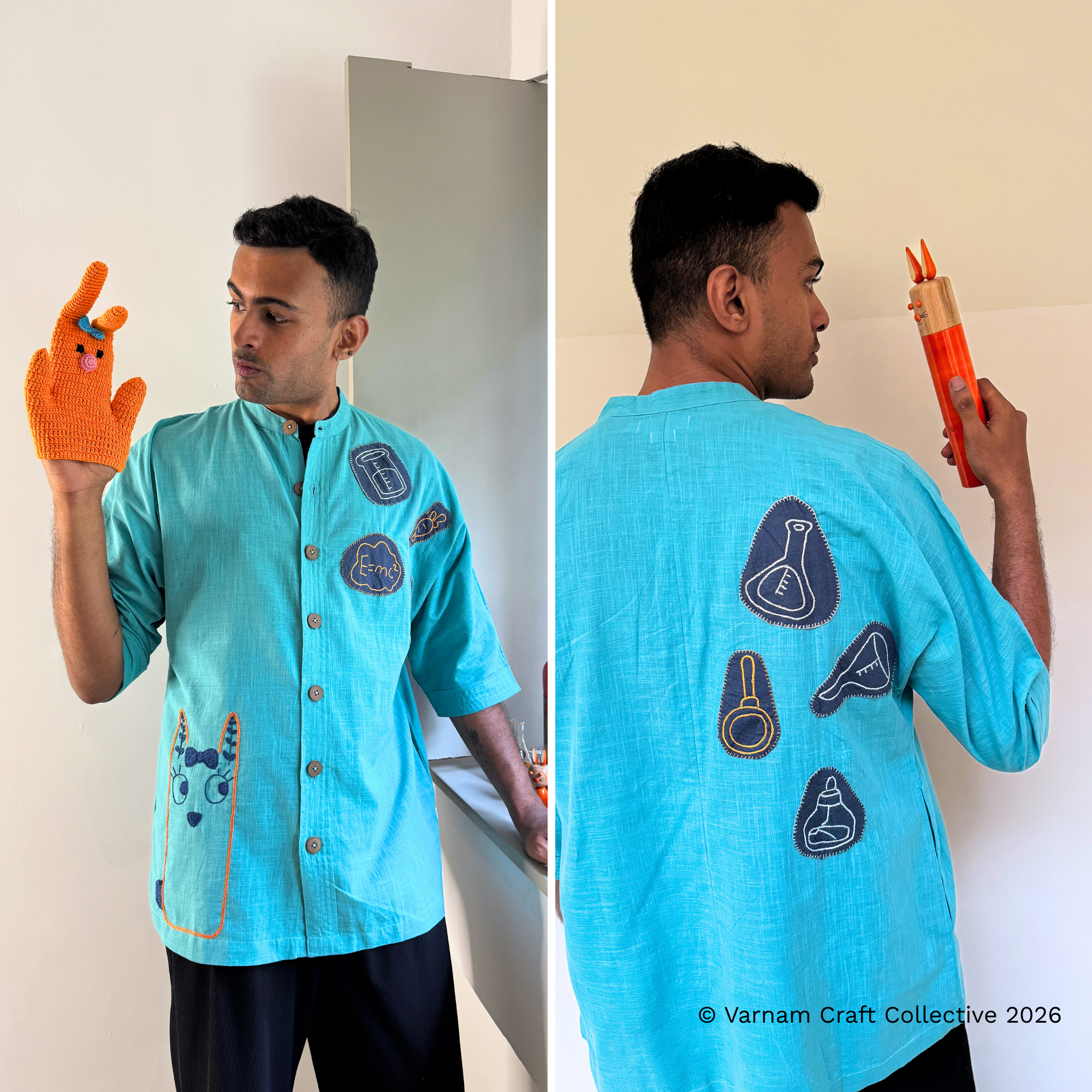 This gender-neutral side Kimono style long shirt is made from Kanchi cotton fabric with detailed hand embroidery by the Lambadi women of Sitlingi, Tamil Nadu.