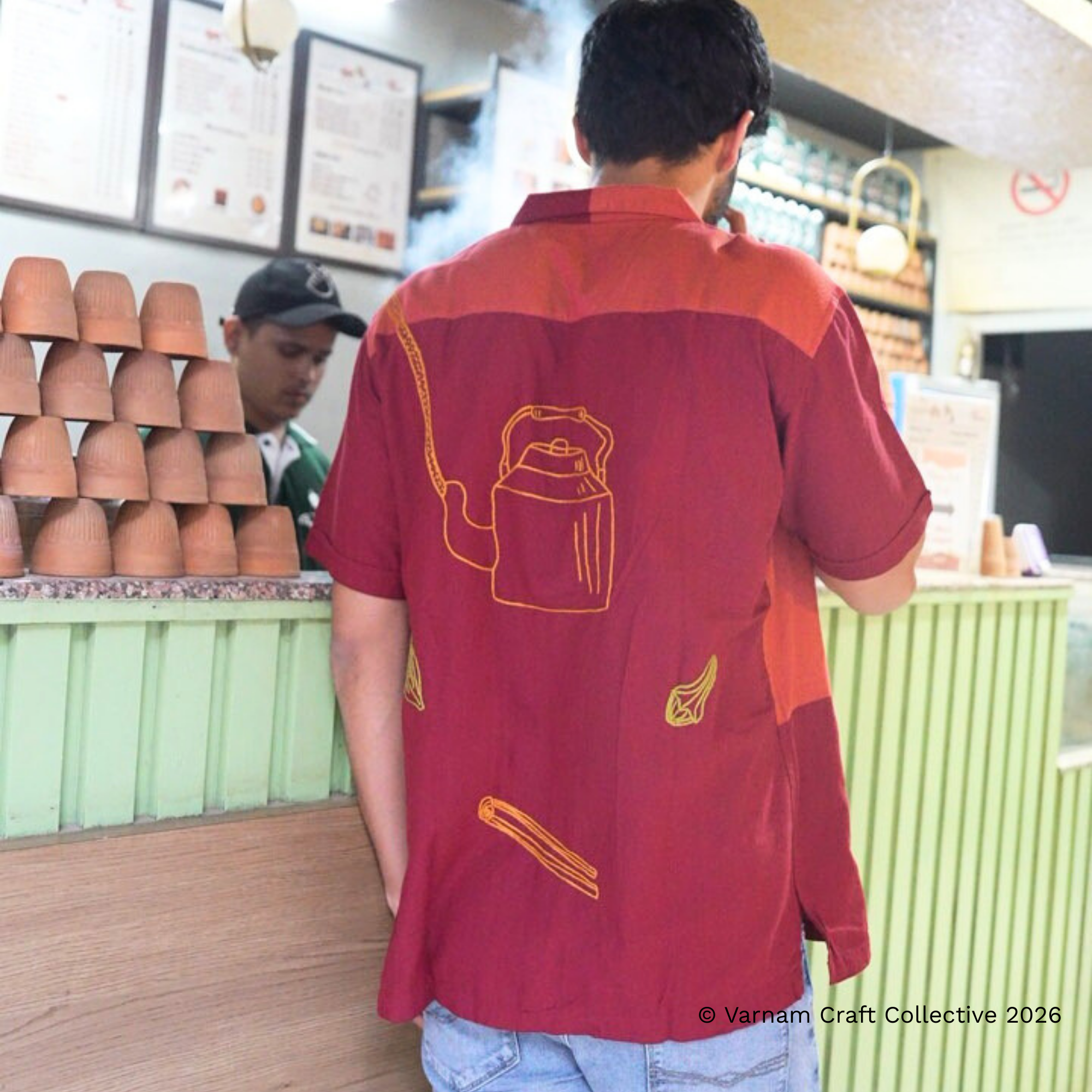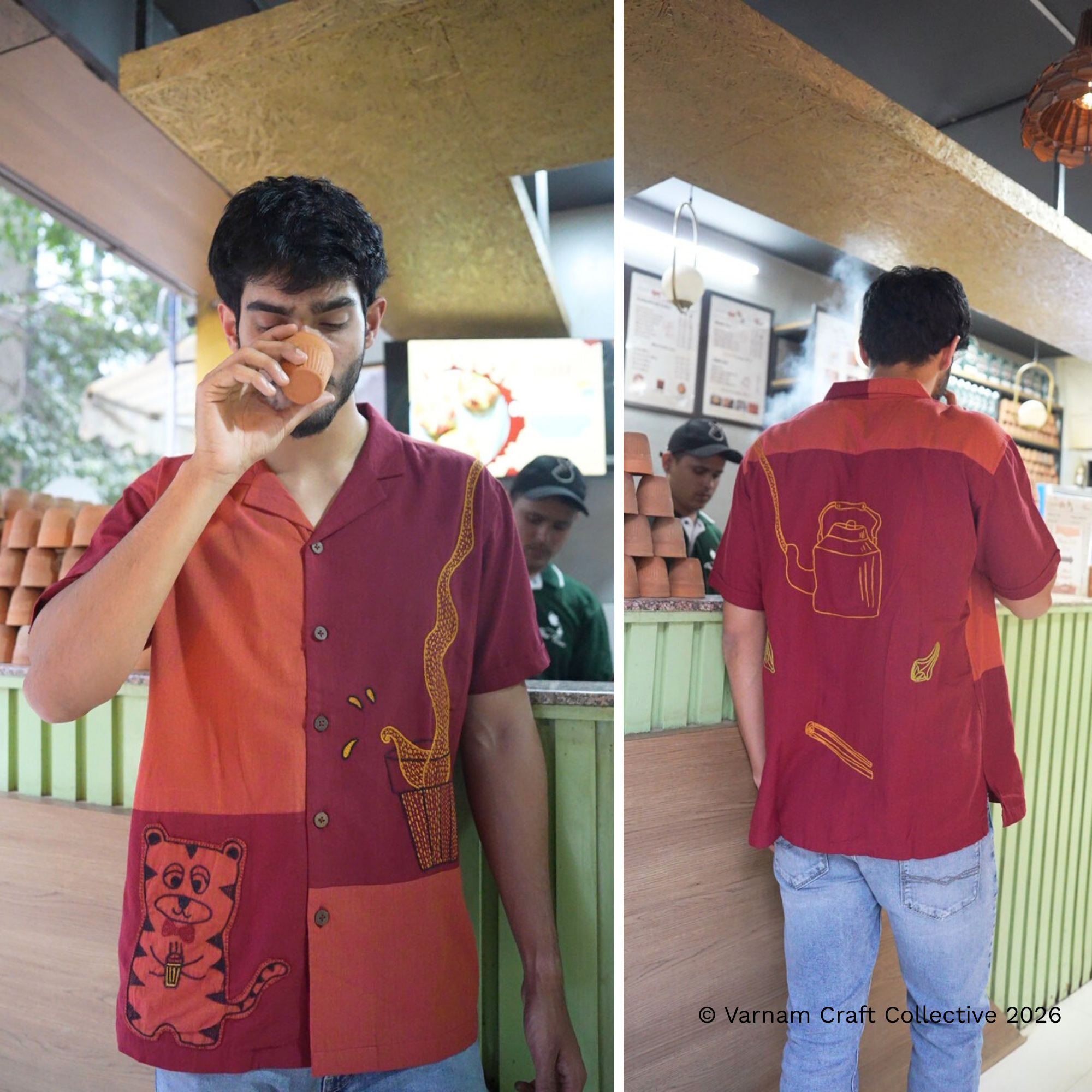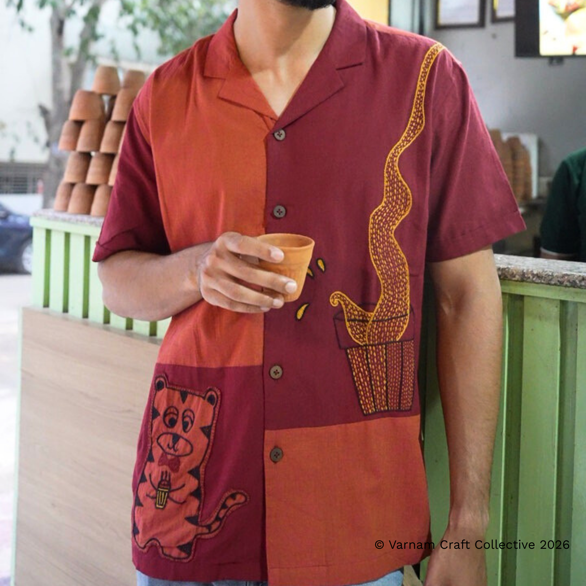 This gender-neutral side cuban shirt is made from Kanchi cotton fabric with detailed hand embroidery by the Lambadi women of Sitlingi, Tamil Nadu.