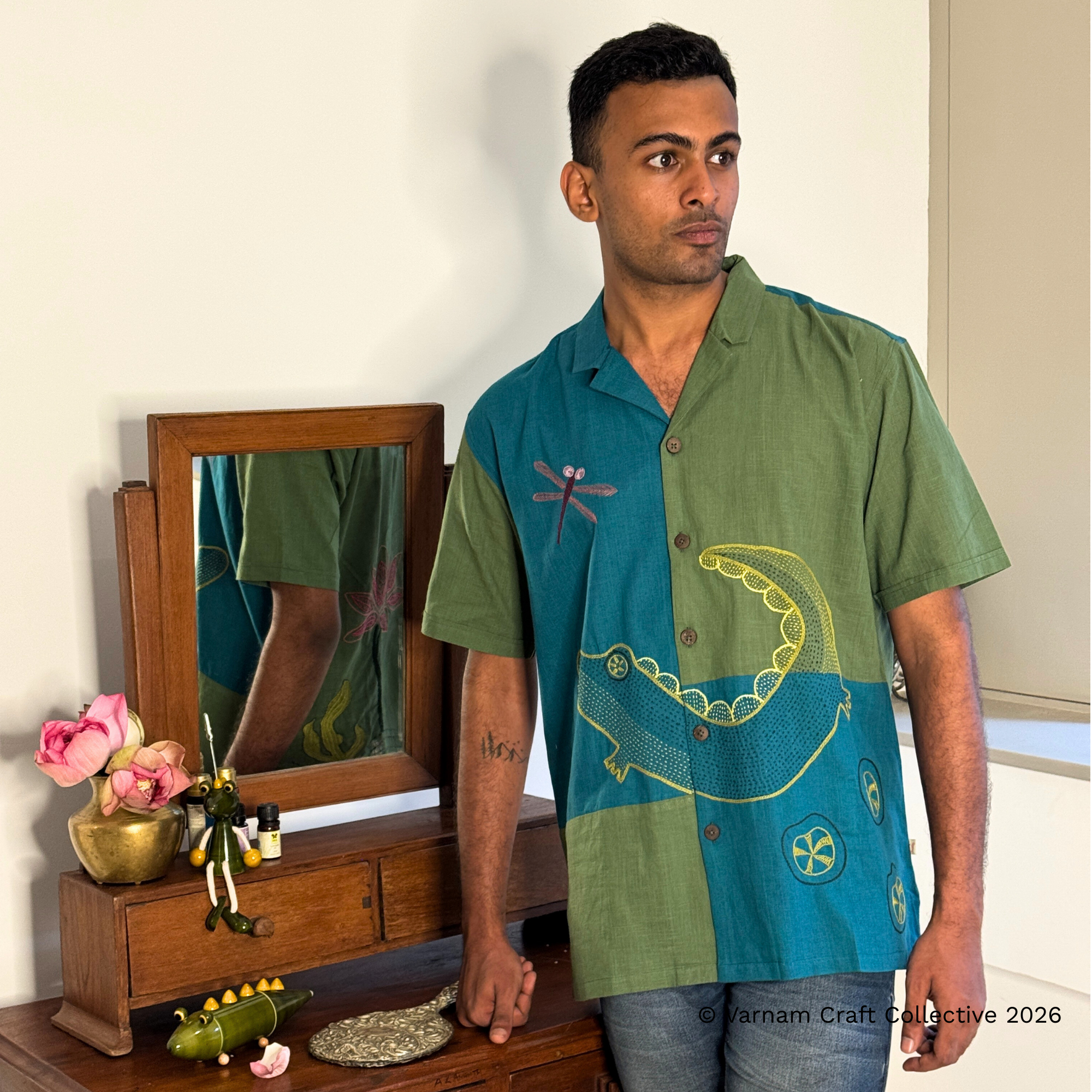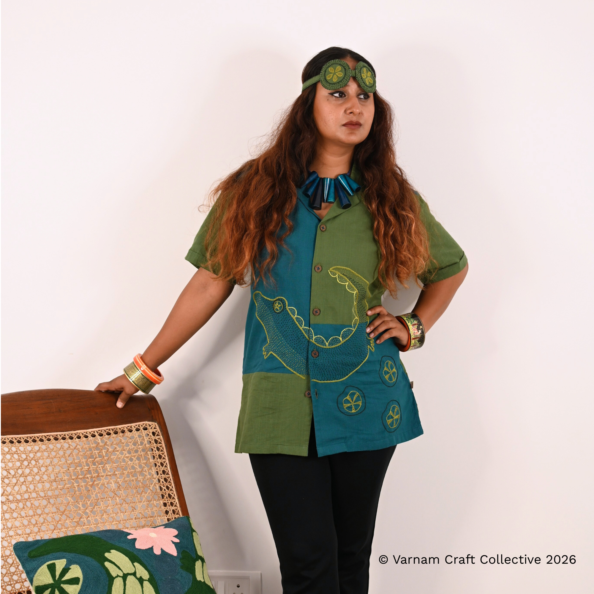 This gender-neutral side cuban shirt is made from Kanchi cotton fabric with detailed hand embroidery by the Lambadi women of Sitlingi, Tamil Nadu.