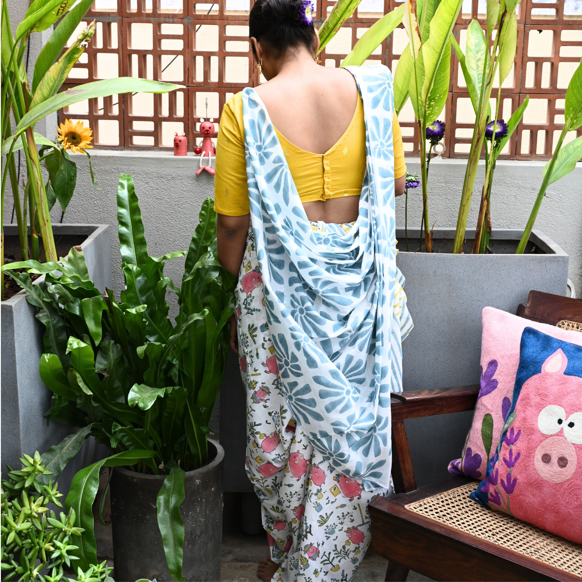 This uber soft cotton mulmul saree is a contemporary take on the traditional hand block printing craft of Mughal Block printing, Amer. These handblock prints have been custom made using azo-free dyes.