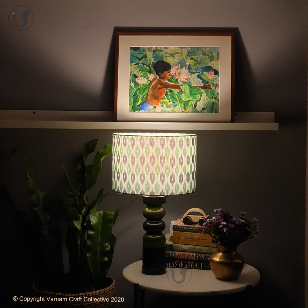 Our fittings are of export quality. The cylindrical shade is made of premium handwoven ikat from the Koyyalagudem village in Andhra Pradesh. The wooden base is made of Wrightia tinctoria, a medicinal plant and handturned in Channapatna, Karnataka. This product is thus a fusion of two beautiful crafts from South India.