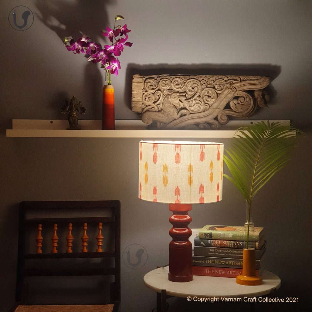 Our fittings are of export quality. The cylindrical shade is made of premium handwoven ikat from the Koyyalagudem village in Andhra Pradesh. The wooden base is made of Wrightia tinctoria, a medicinal plant and handturned in Channapatna, Karnataka. This product is thus a fusion of two beautiful crafts from South India.