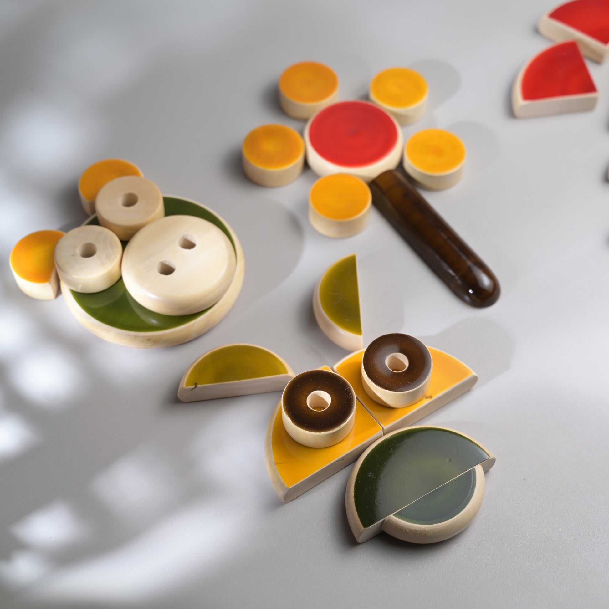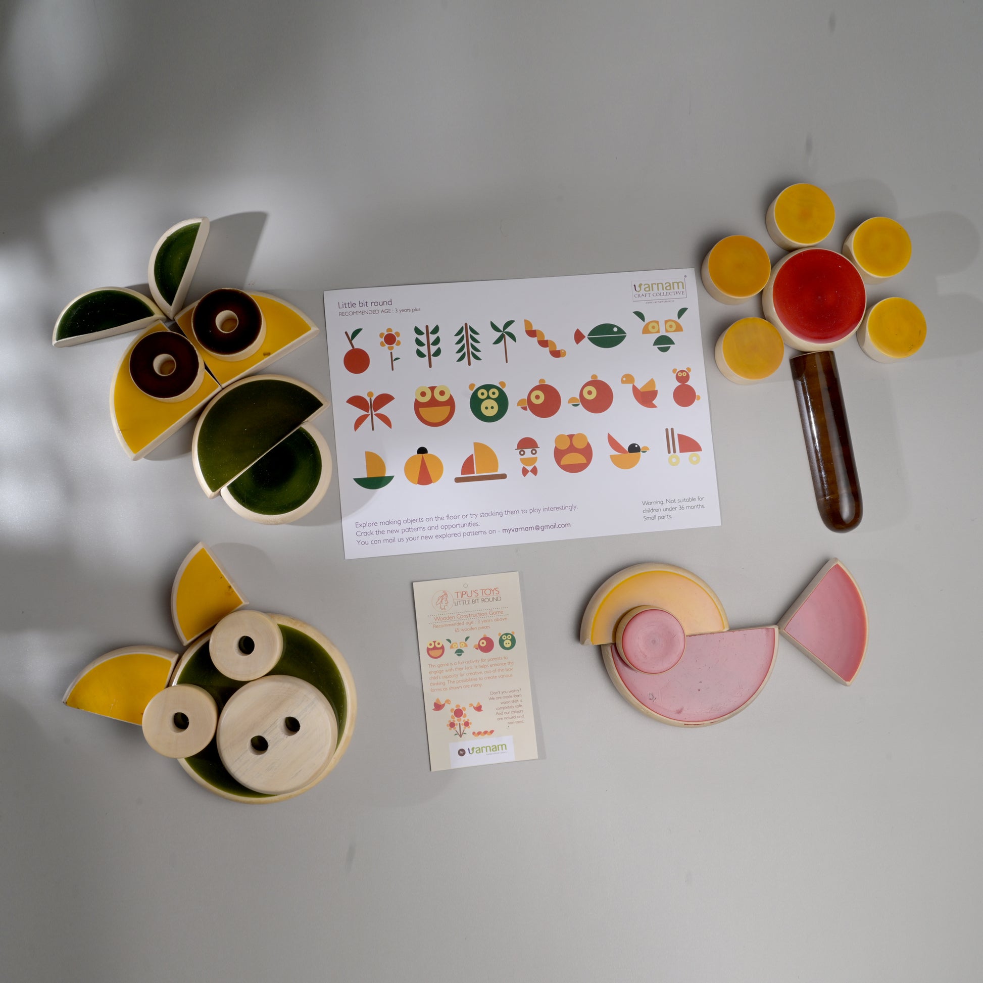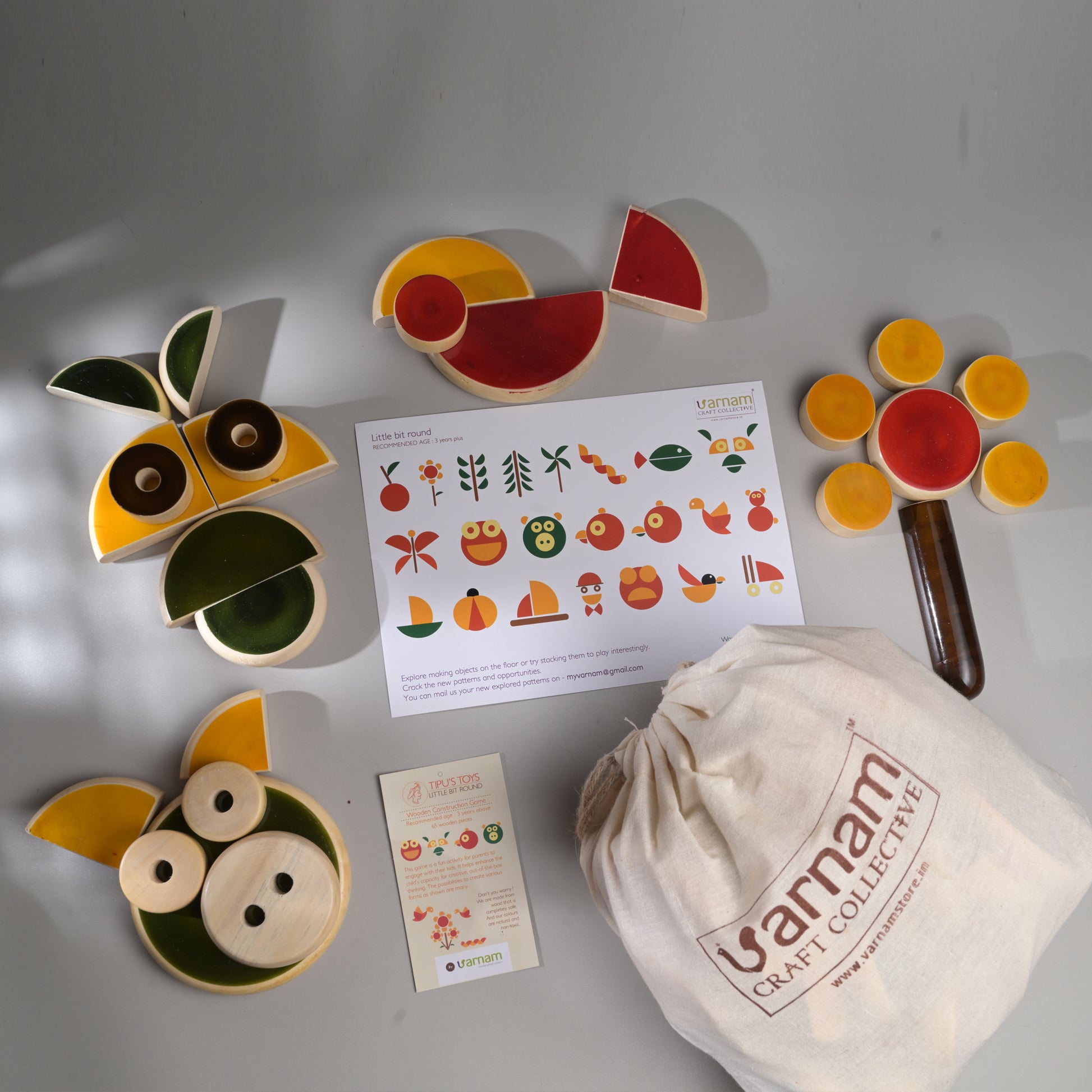 The game contains over 65 wooden pieces of different colours and shapes. One can use a floor or any clean surface like a table to play this game.It is suggested that the adult first recreate any of the given illustrated forms/patterns to show the child how to play the game. Next encourage the child to create patterns of his/her own by referring to the leaflet. As time progresses the child will stop referring to the leaflet and create patterns of his/her own. You will be amazed to see the kind of patterns/forms they come up with.