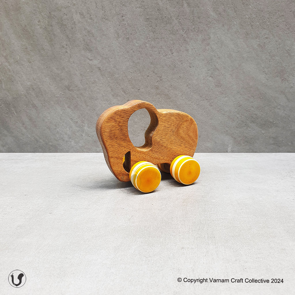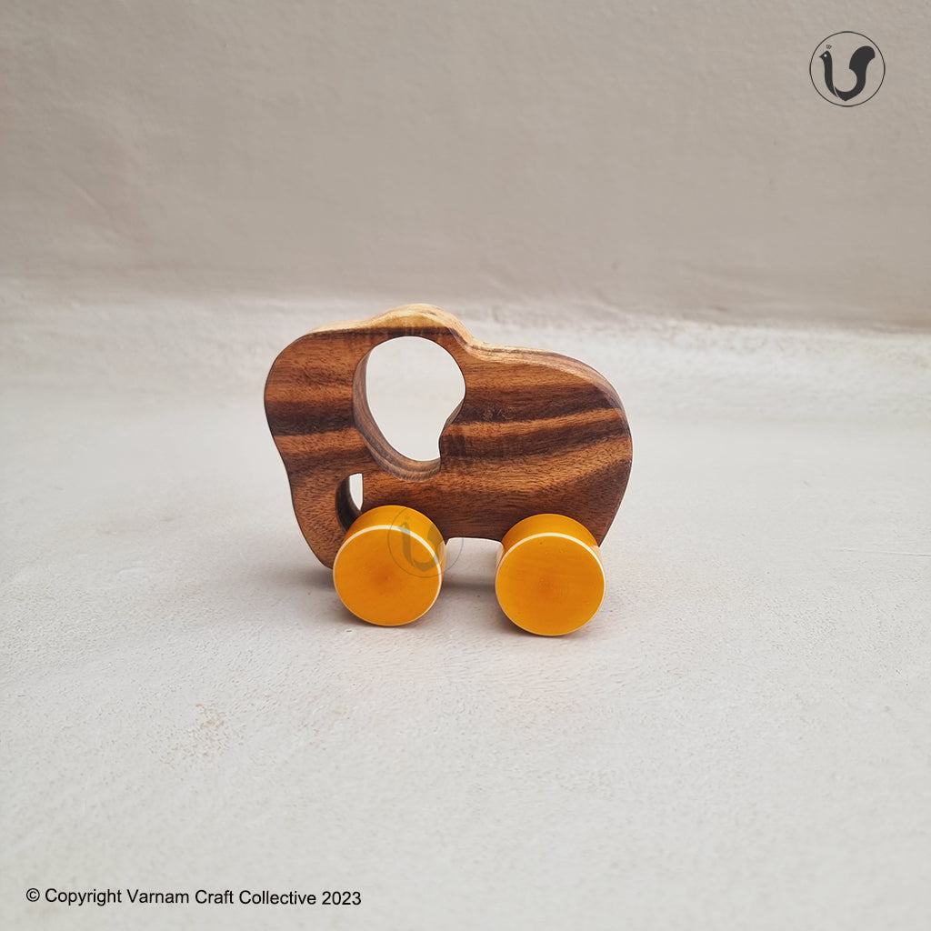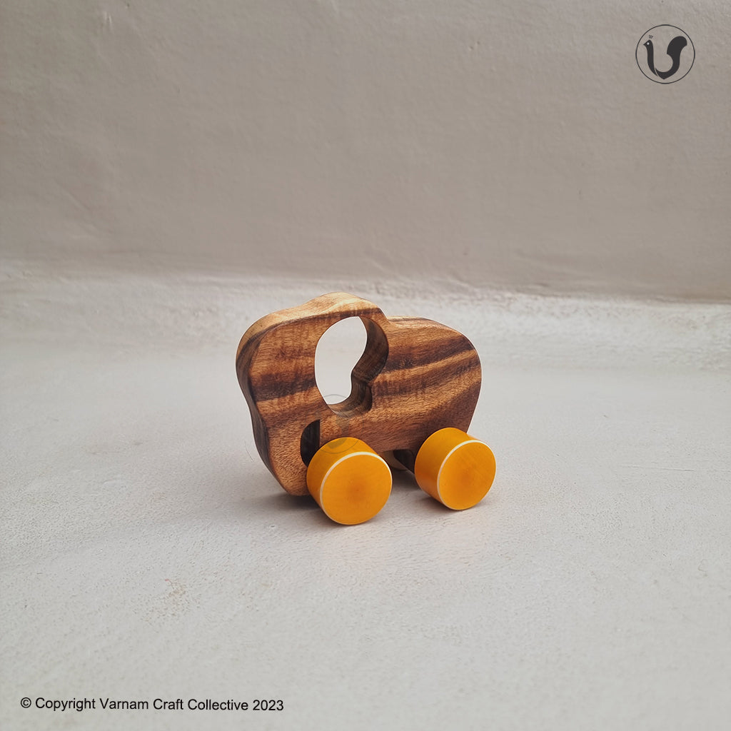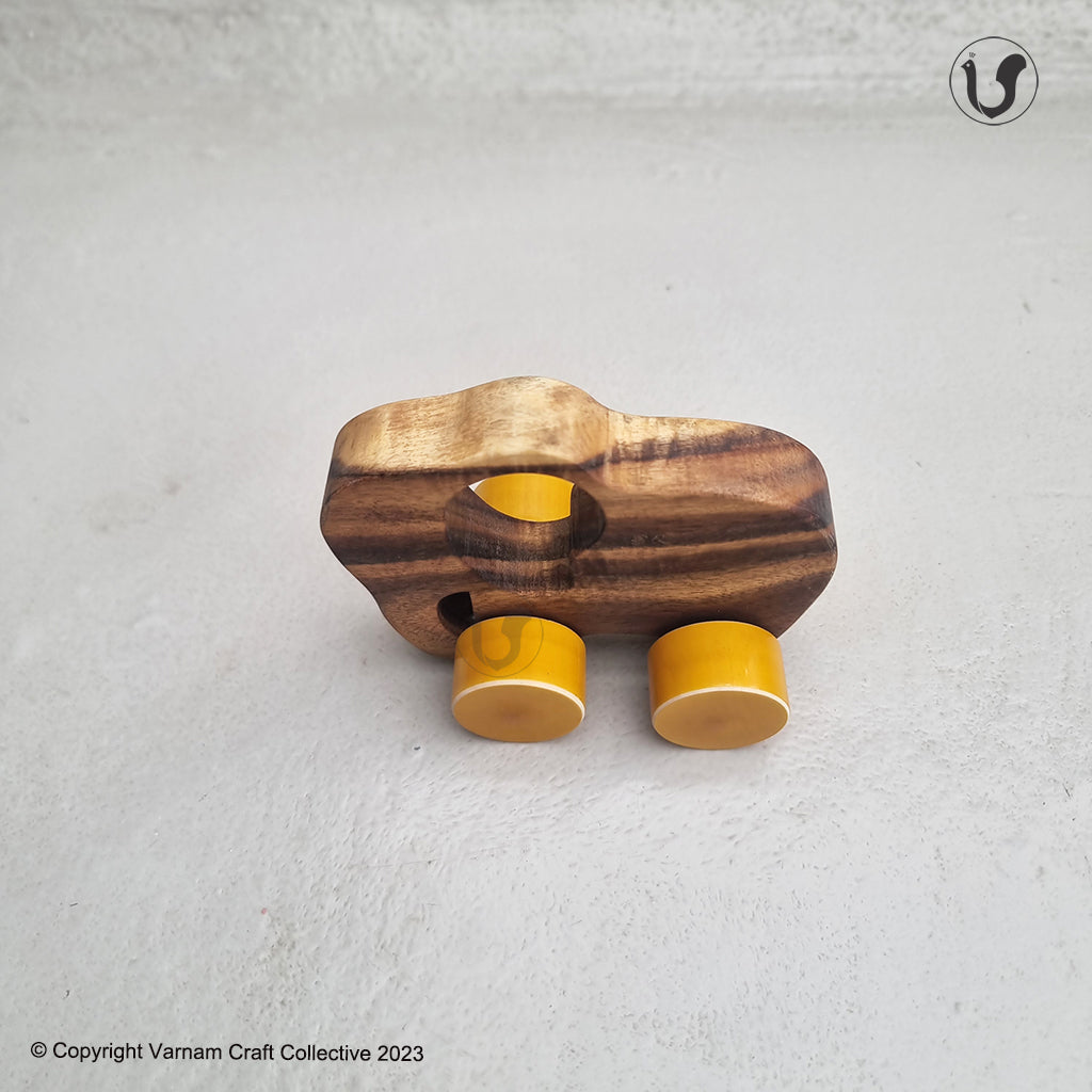 The wooden toys are handcrafted from natural Acacia wood and treated with non-toxic natural Tung oil. The toys are child safe. The colorful wheels are handmade by our Artisans in Channapatna, Karnataka using the traditional lacquer ware turning technique. The wood used for all channapatna lac-ware products is completely safe and is 100% eco-friendly. Any irregularities on the wood are part of its natural beauty.