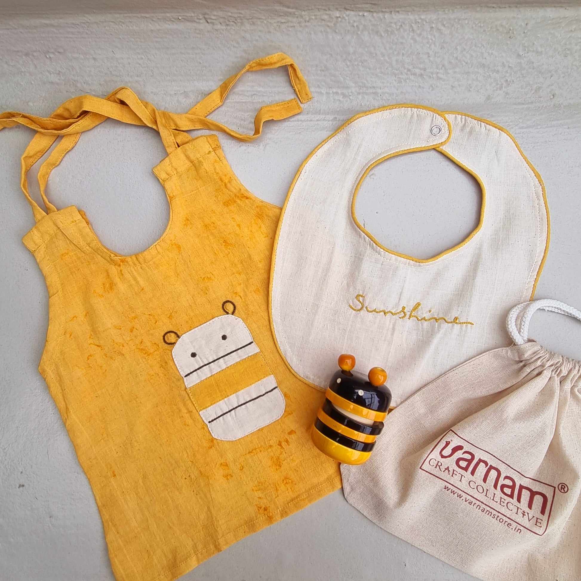 This baby set is a creative collaboration with Sankalpa Art Village. The beautiful handloom Kora cotton is hand dyed with utmost care. They are hand dyed naturally with dyes like manjistha, harada, katta and more plant based dyes. What makes this special is the applique work, inspired from the cute toys designed by the women of Varnam Craft Collective.