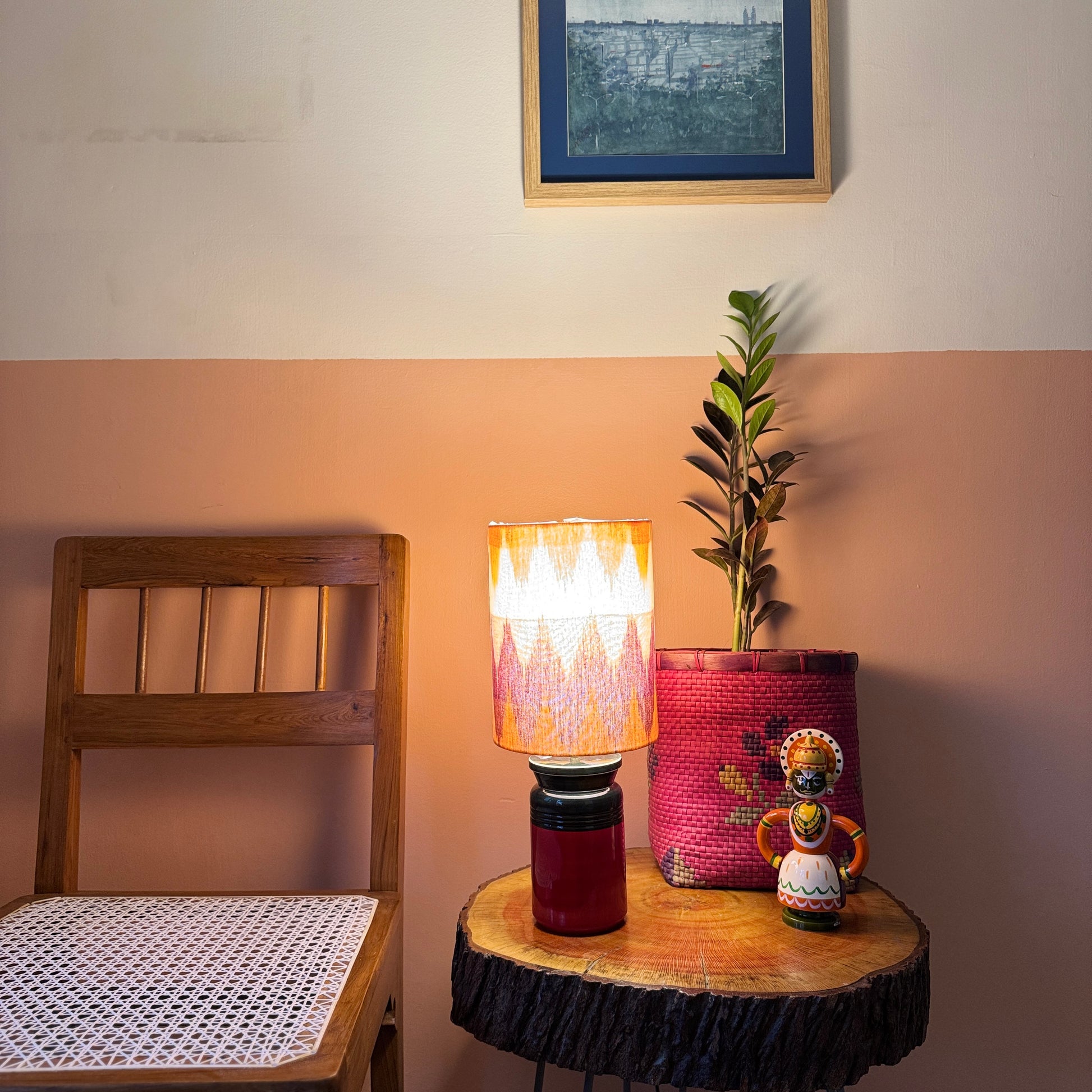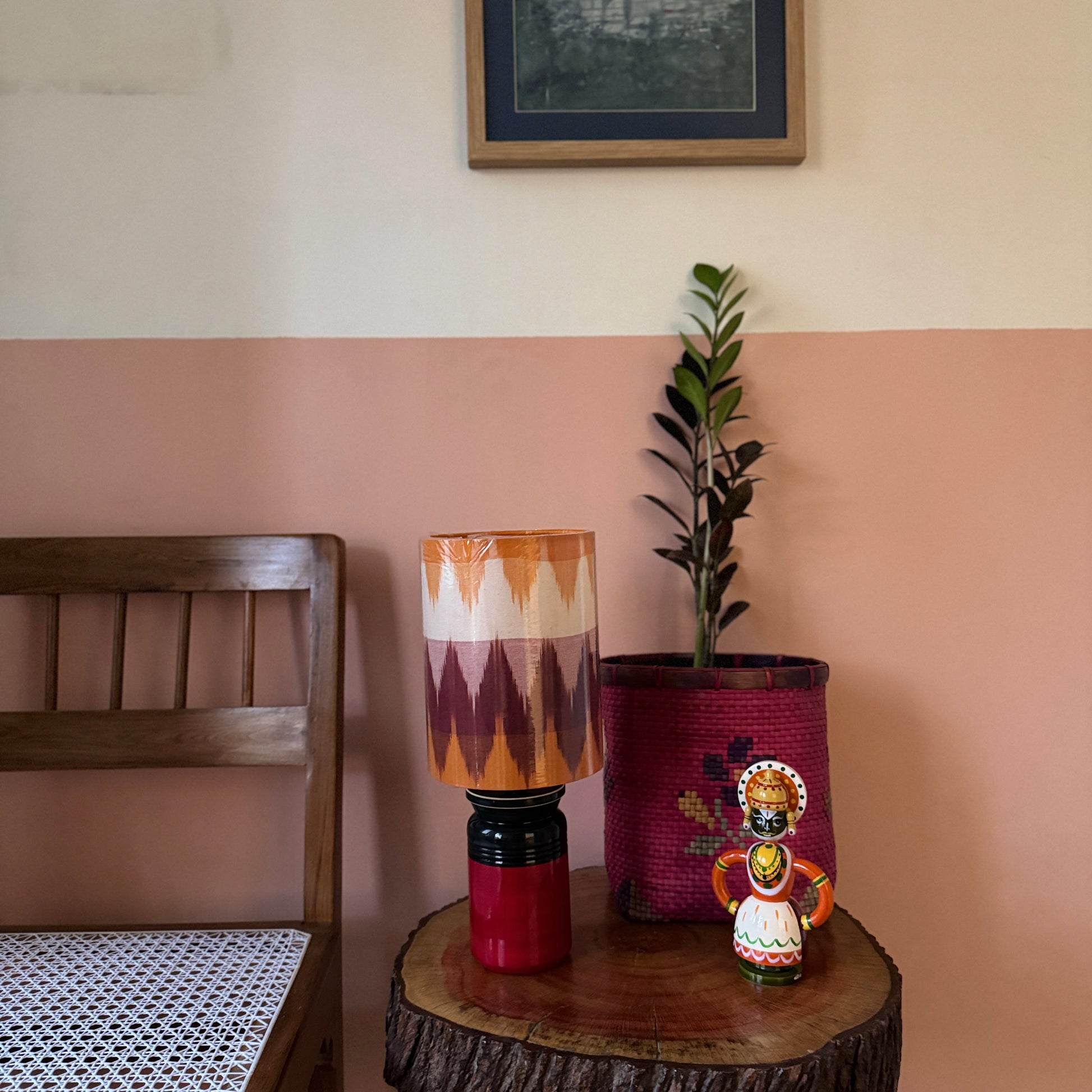Our attempt to reinterpret the traditional toy craft of Channapatna translates to these one-of-a-kind statement lighting. This compact lamp is perfect to create some much needed mood lighting in the corners of your room. They also make great bedside table lamps especially in pairs. The fittings are of export quality. The cylindrical drum shade is made of premium handwoven ikat from the Koyyalagudem village in Andhra Pradesh.