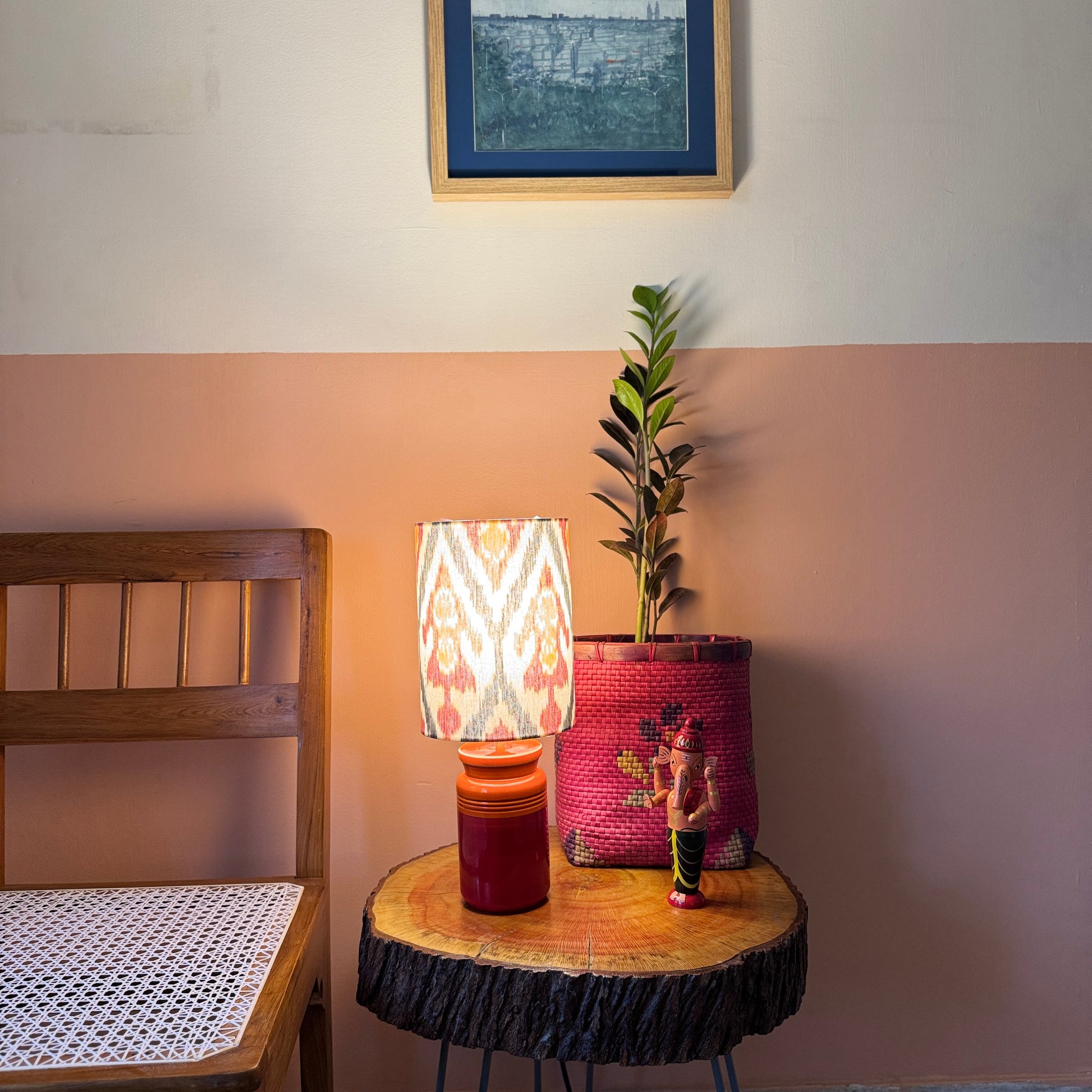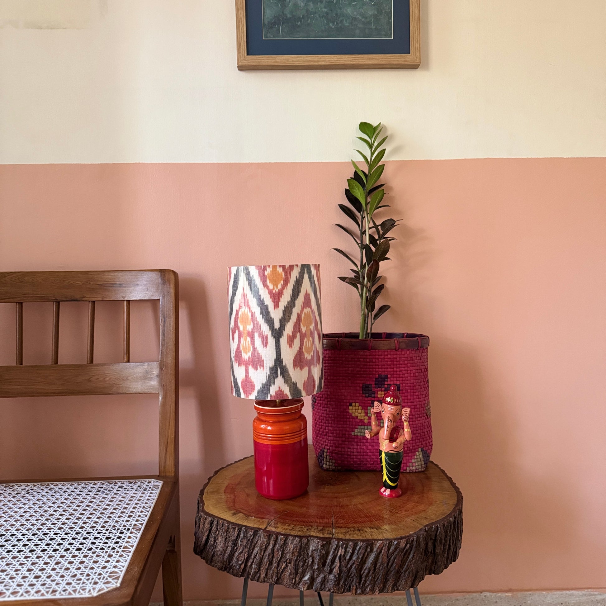 Our attempt to reinterpret the traditional toy craft of Channapatna translates to these one-of-a-kind statement lighting. This compact lamp is perfect to create some much needed mood lighting in the corners of your room. They also make great bedside table lamps especially in pairs. The fittings are of export quality. The cylindrical drum shade is made of premium handwoven ikat from the Koyyalagudem village in Andhra Pradesh.