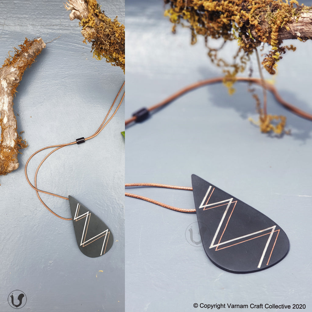 These statement pieces are handcrafted in Bidar, North Karnataka. This piece is an ode to the waves of the sea. The metal used is a blackened alloy of zinc and copper inlaid with thin sheets of pure silver, brass and copper. Any imperfections on it are part of the handmade process involved in creating it.