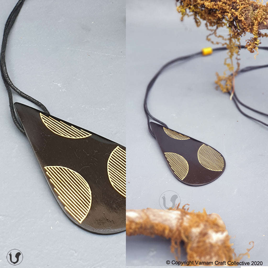The metal used is a blackened alloy of zinc and copper inlaid with thin sheets of brass that enchances the shine of this piece. Any imperfections on it are part of the handmade process involved in creating it.