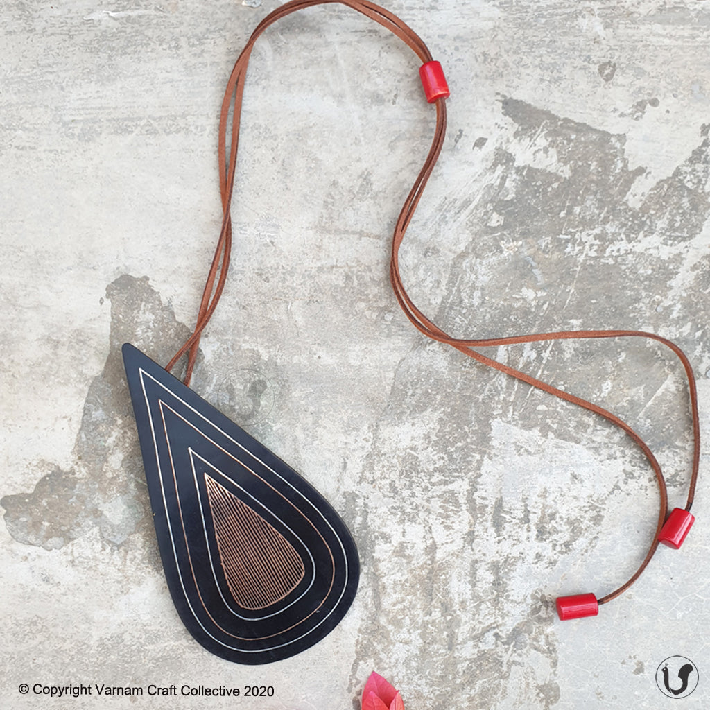 These statement pieces are handcrafted in Bidar, North Karnataka. This piece is an ode to the waves of the sea. The metal used is a blackened alloy of zinc and copper inlaid with thin sheets of pure silver, brass and copper. Any imperfections on it are part of the handmade process involved in creating it.