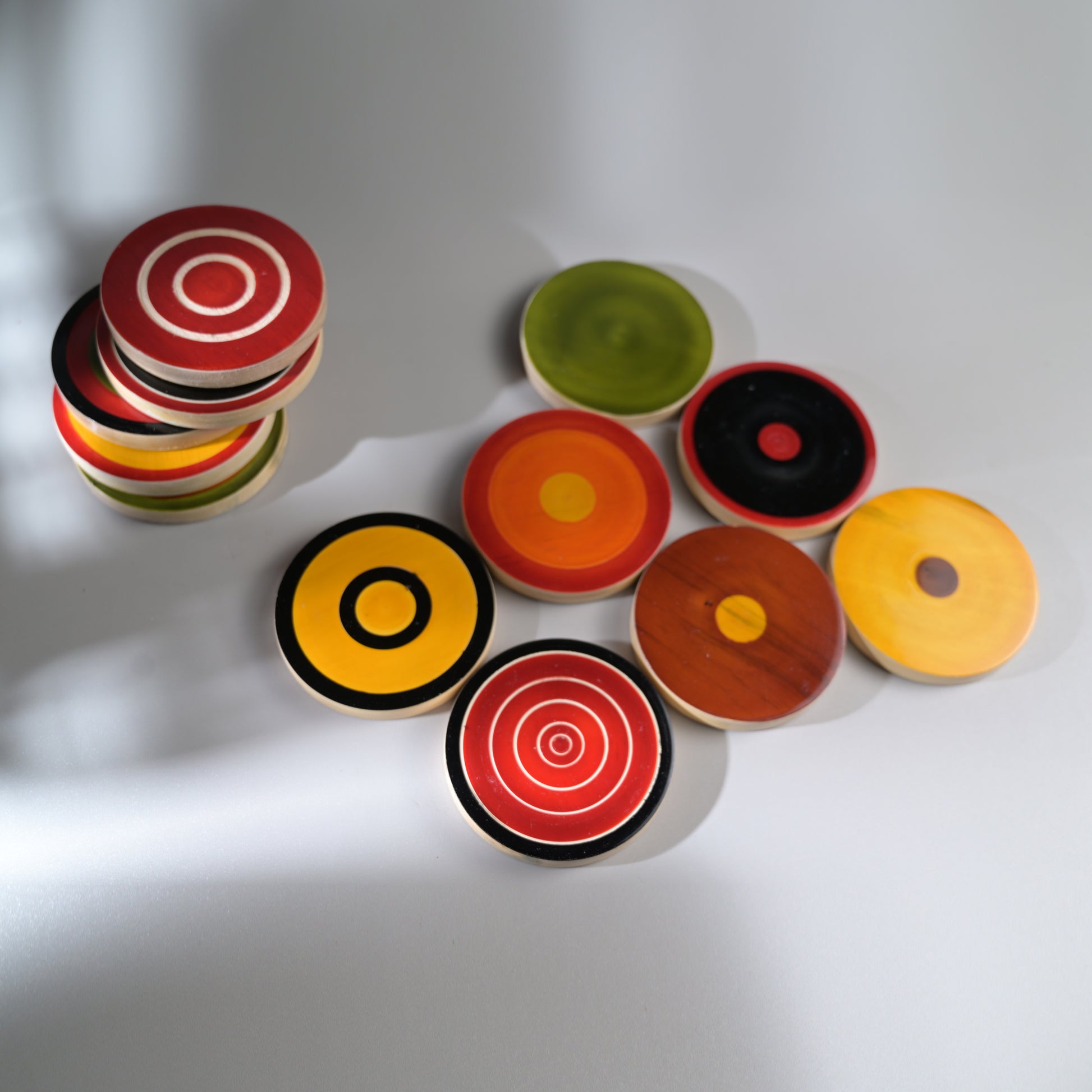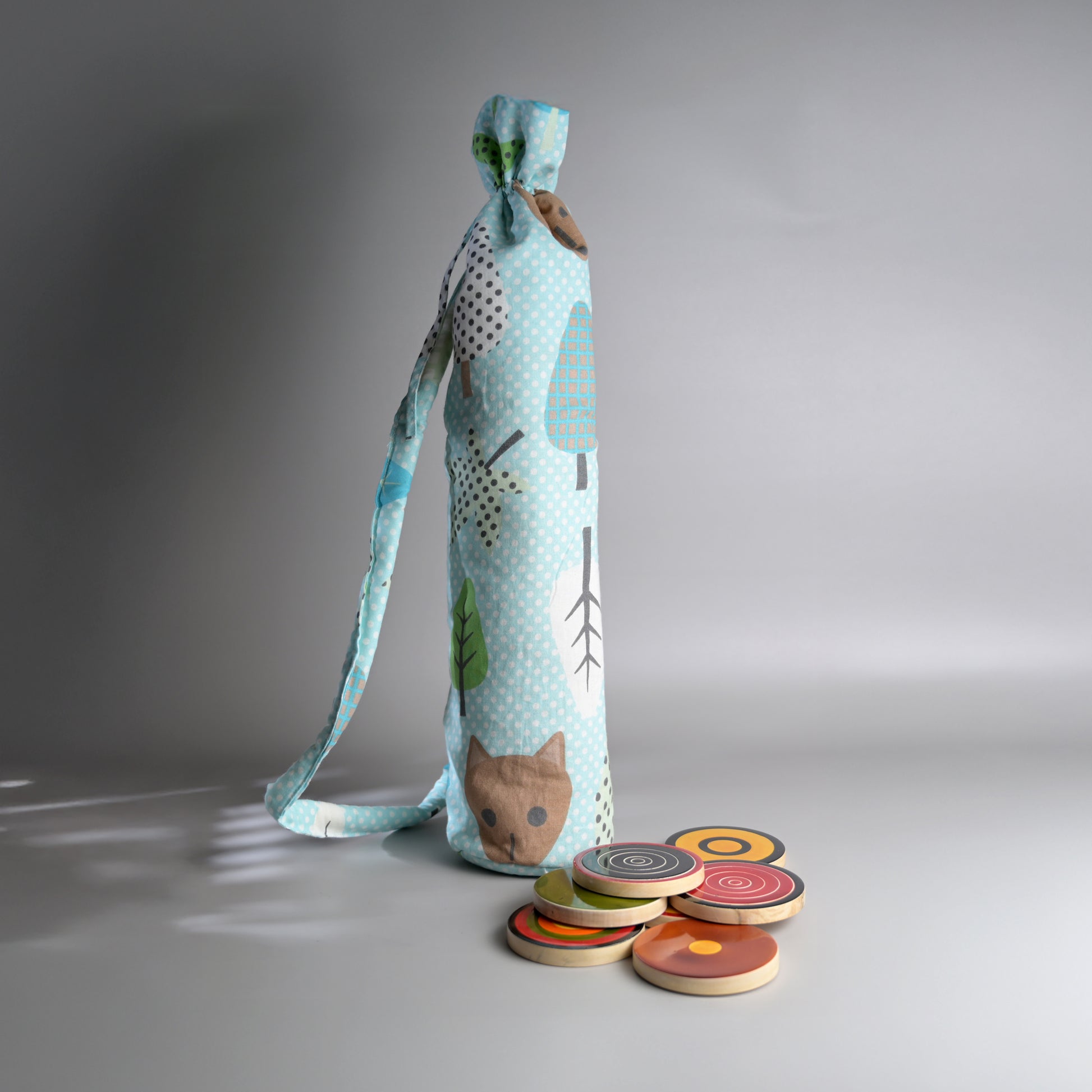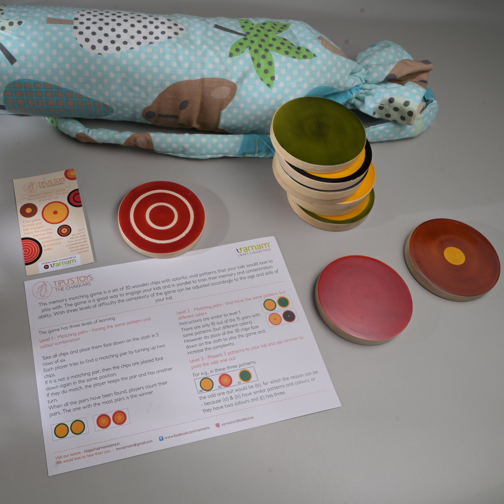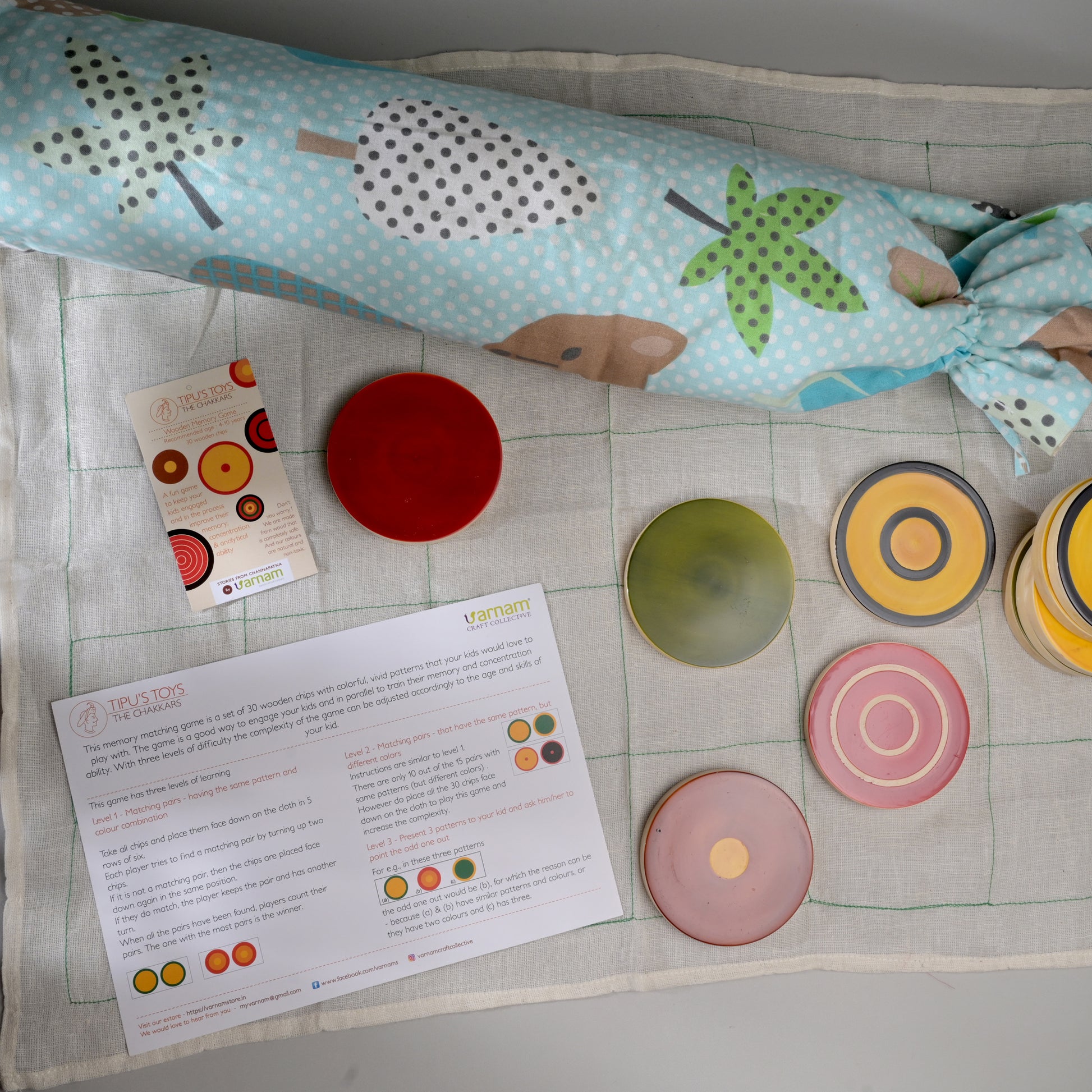 Recommended Age - 4-10 years . This game while being fun also helps your child to increase his/her concentration and memory power. The game is a set of 30 wooden chips with colourful, vivid patterns. The colours used are safe and natural. The game also comes with a hand-stitched 'yoga-bag' to hold the chips within and carry around conveniently. Please note that the fabric used for the outside bag and the mat will vary from the one shown in the pic depending on its availability.