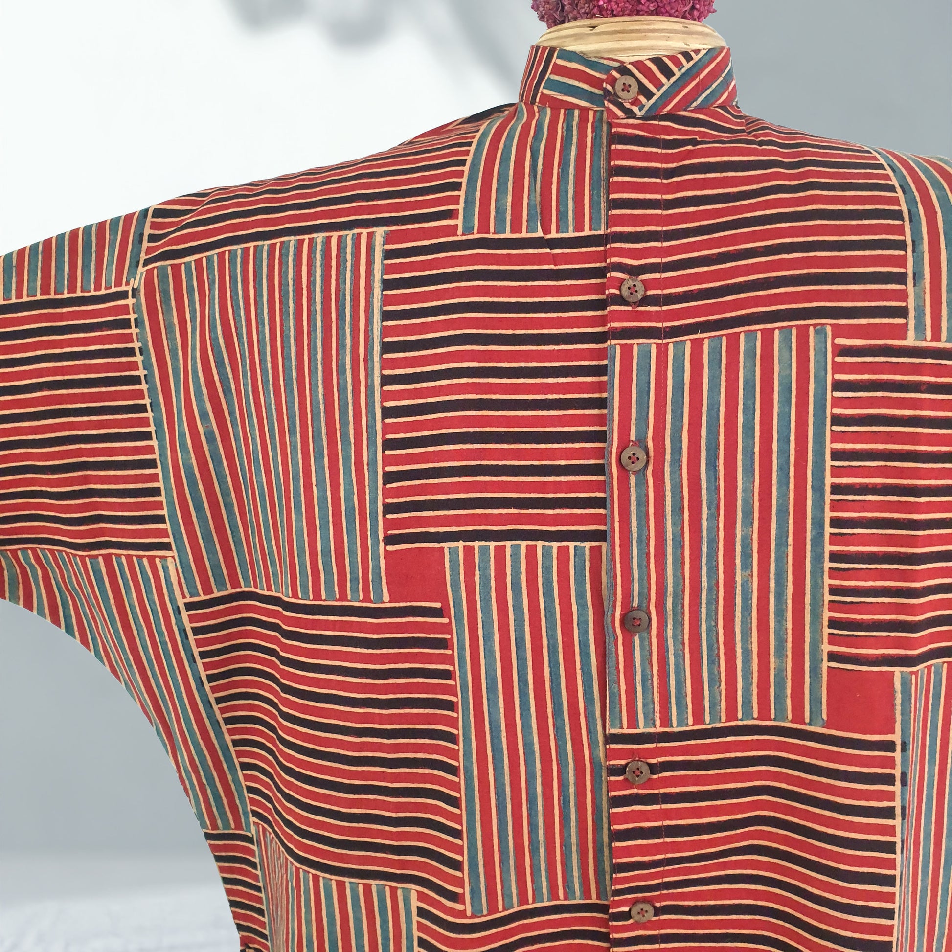 This uber soft, mulmul cotton shirt is a contemporary take on the traditional hand block printing craft of Ajrakh, Gujarat. The prints have been custom made using natural dyes.