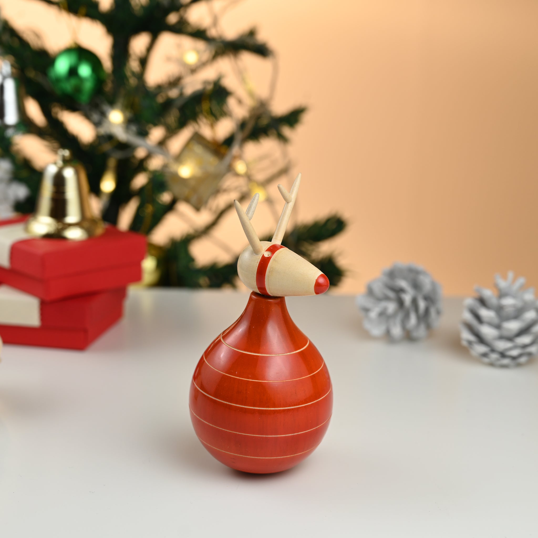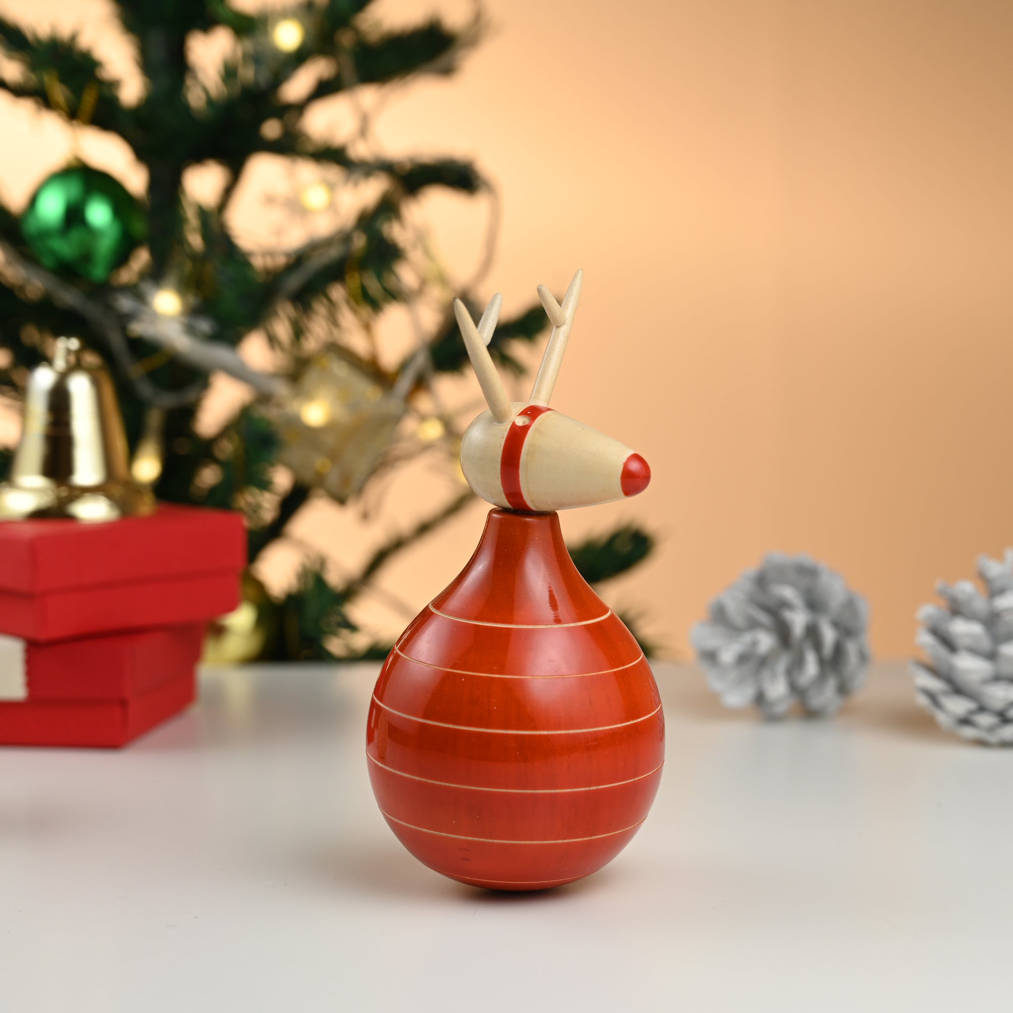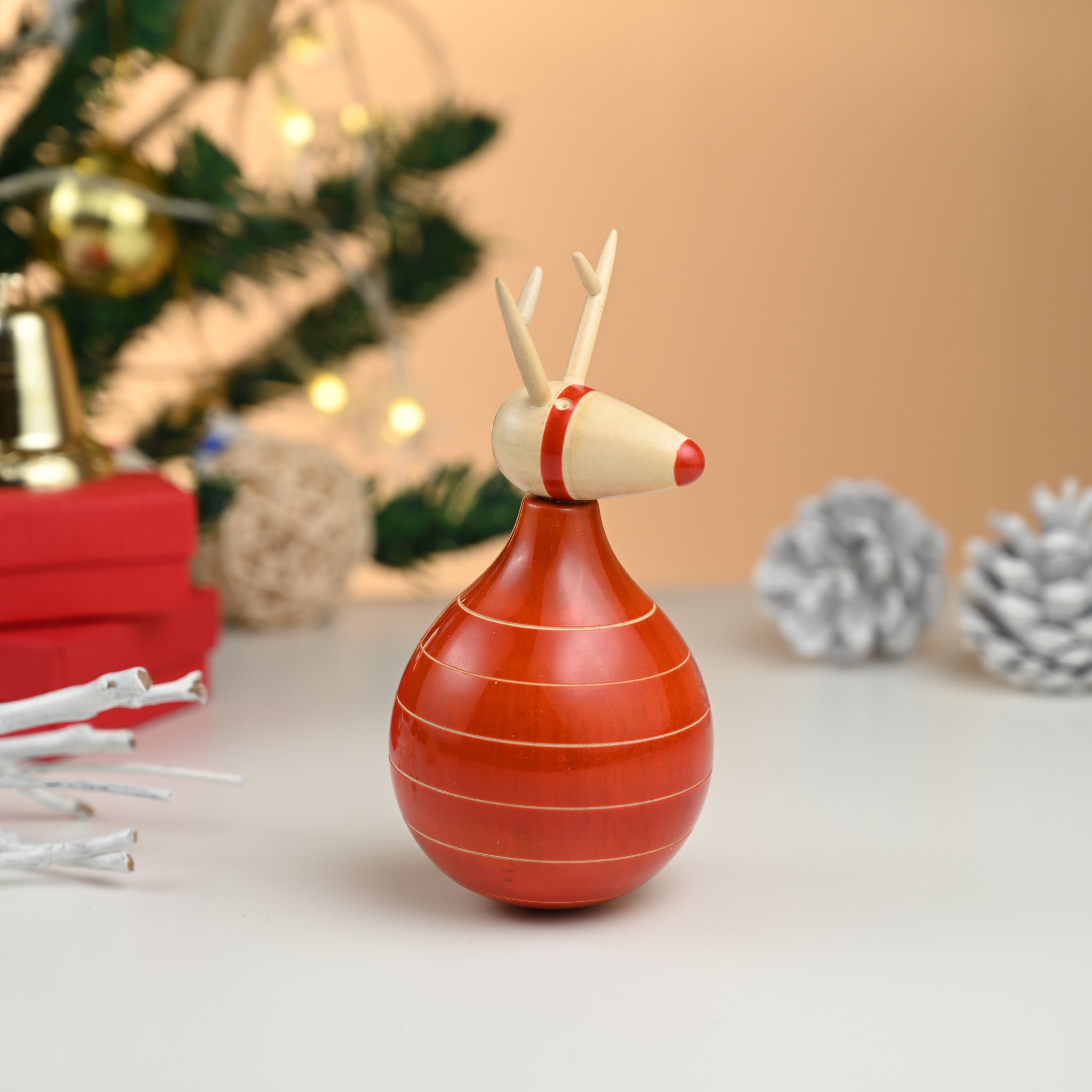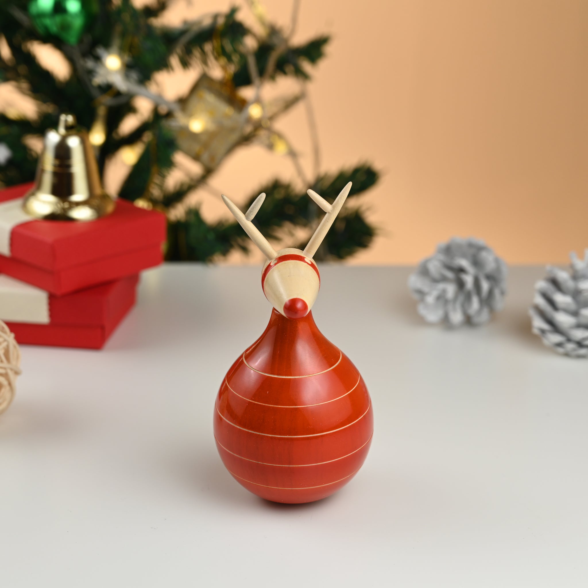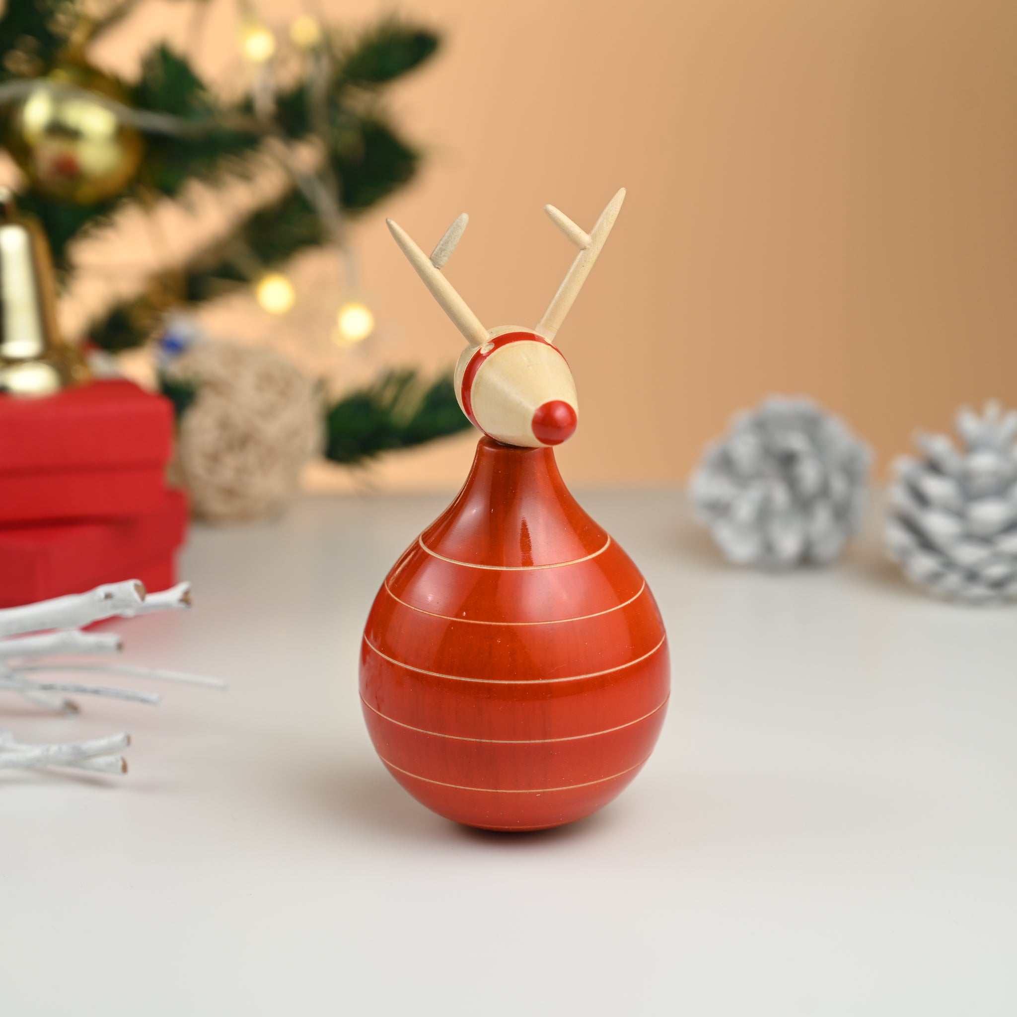 Made of sustainable beechwood in parts and wrightia tinctoria, our red-nosed rudolf has been a best-seller in his seated avtaar. It was only natural that we added a twist to the same design with a rocking version. An absolute stunner and must-have for your table top decorations.