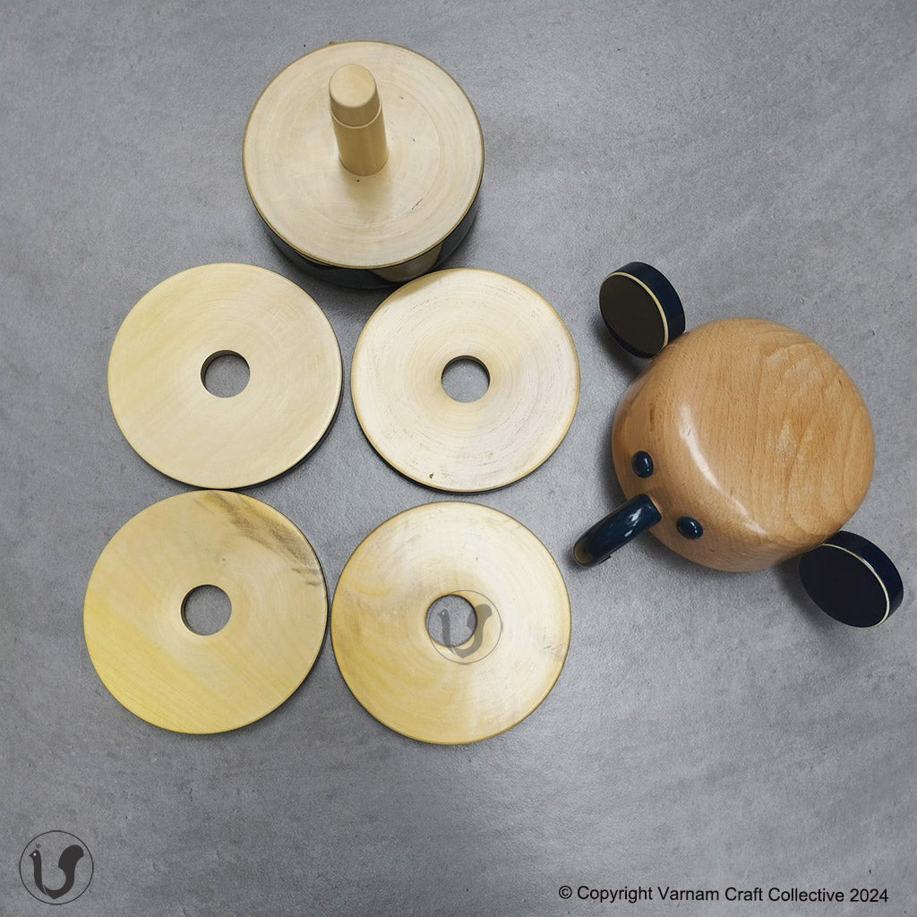Each piece has been pain stakingly hand-crafted by artisans from Channapatna using the traditional lacquer ware turning technique. The colours used are natural and non-toxic. The wood used for all channapatna lac-ware products is completely safe and is 100% eco-friendly. Any irregularities on the wood are part of its natural beauty.