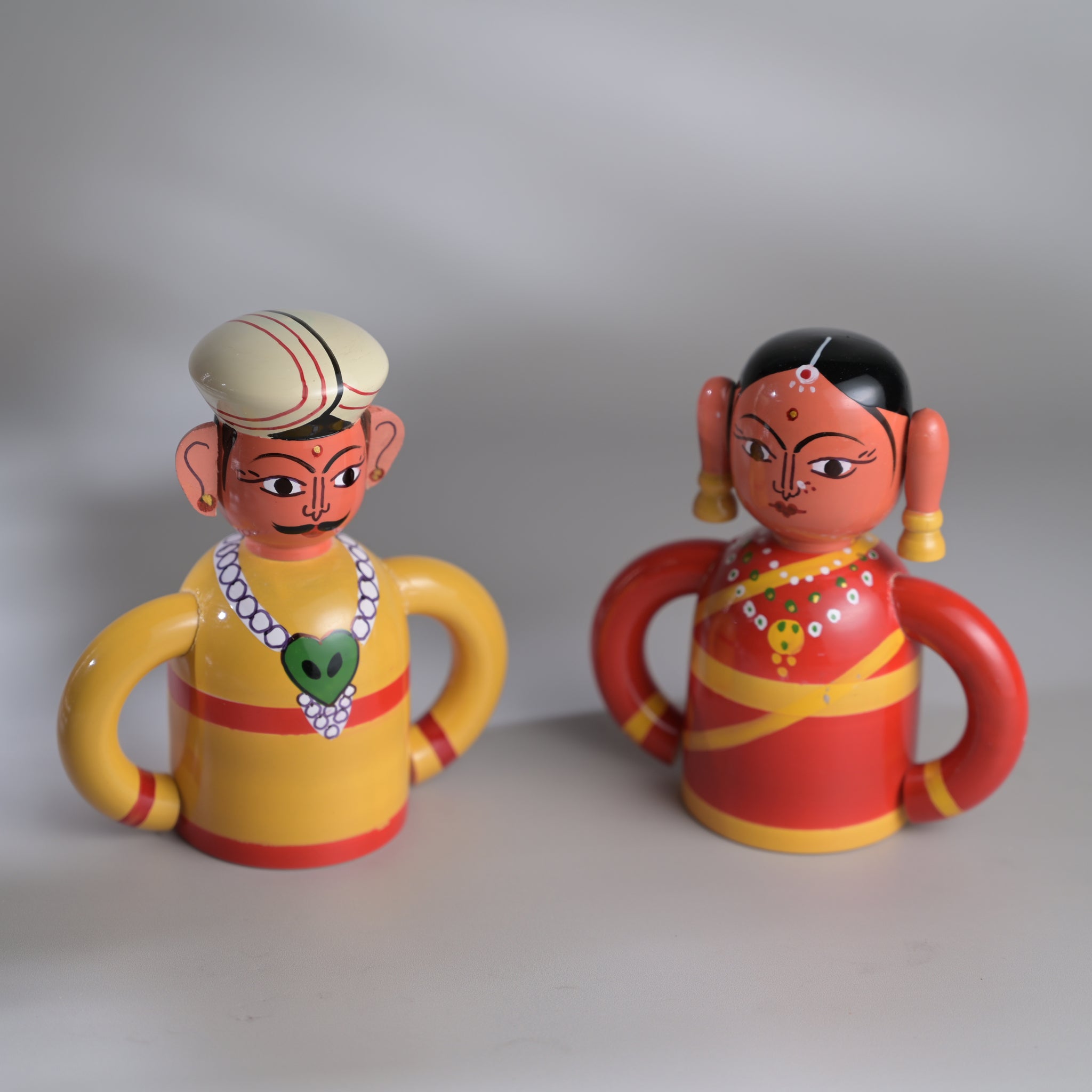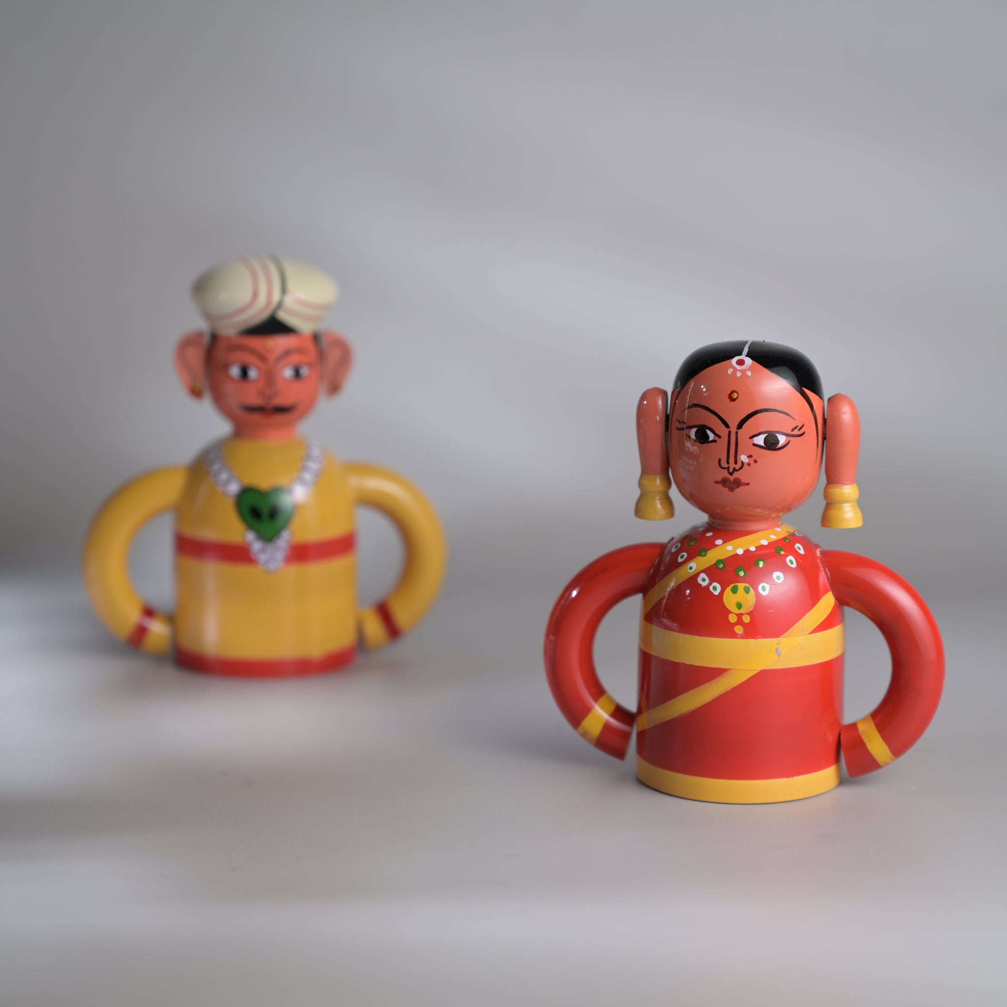 This pair of dolls is part of our initiative to revive the traditional doll stories of Channapatna, Karnataka. This is the channapatna toy interpretation of the popular 'Gaarudi Gombe' dolls .