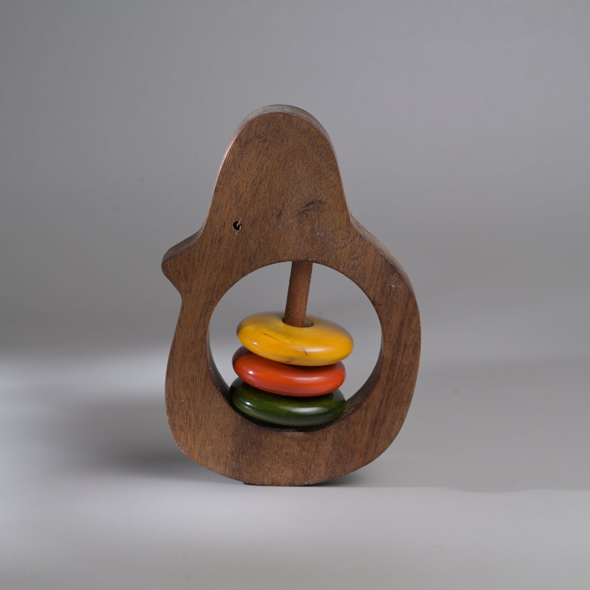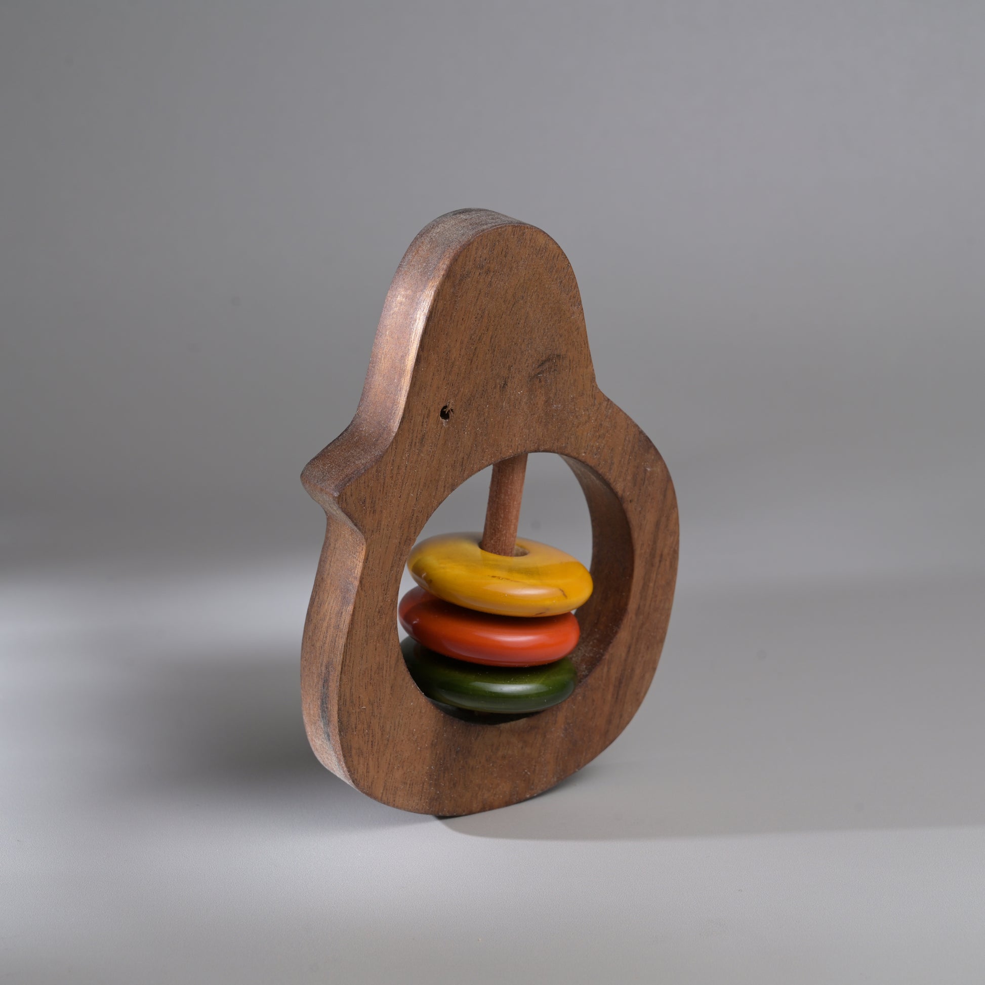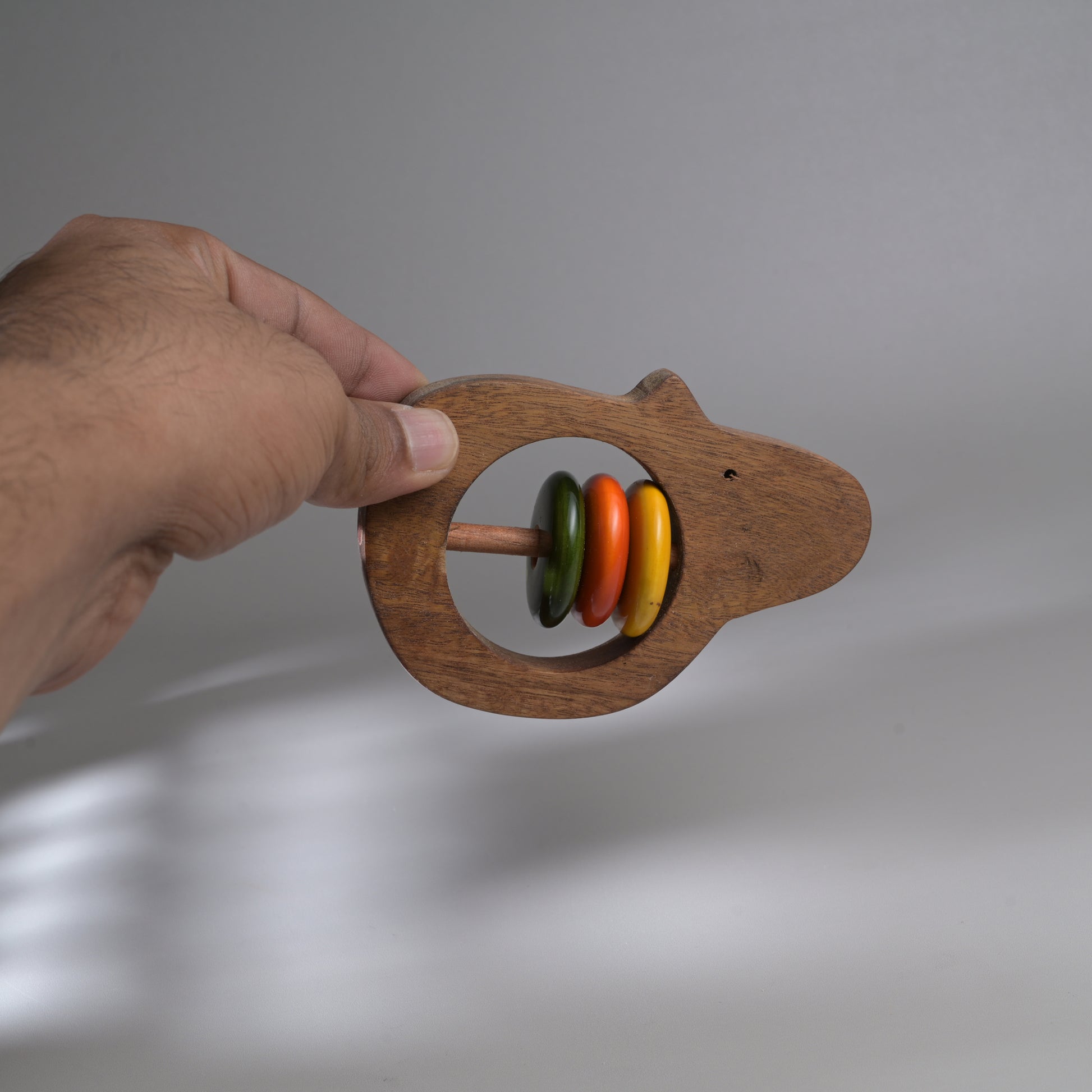 A rattle that's completely safe to play with and keep you little ones besotted with its colours and sounds. The hippo is handcut from safe locally cultivated wood (pinewood or beechwood depending upon the availability) while the colourful rings inside from handcrafted from a medicinal plant, Wrightia tinctoria, a wood known for its various medicinal properties. The colours used are natural and safe.