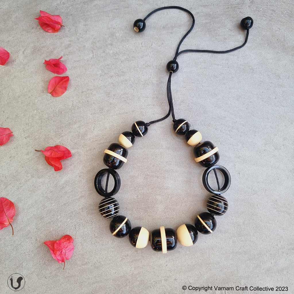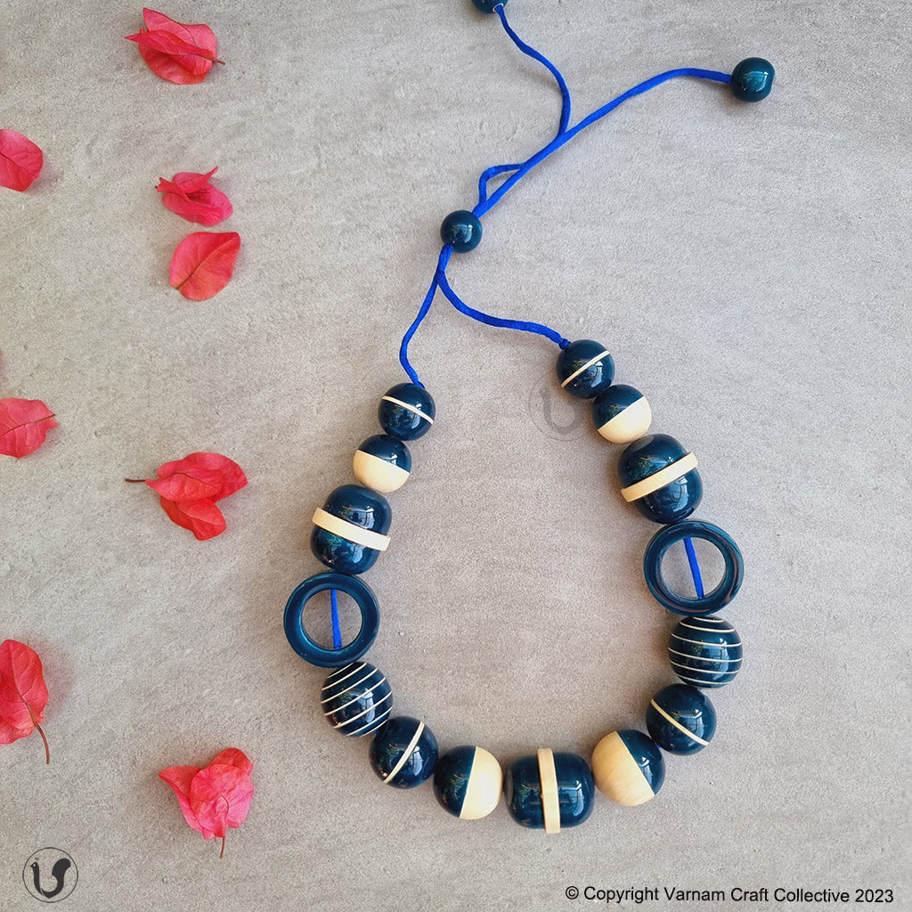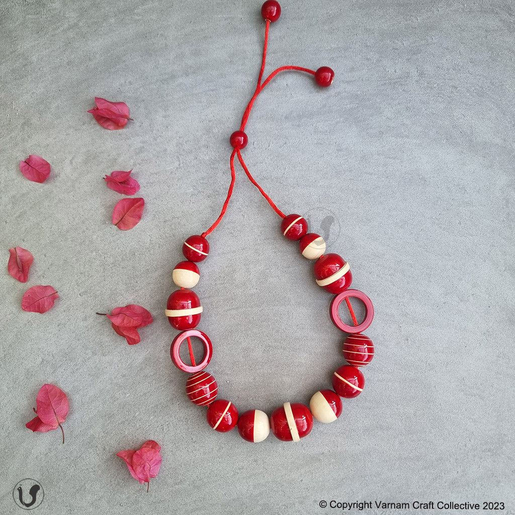 A unique one-of-a-kind style statement from the 'INBAM" series of wooden jewelry by Varnam. This piece has been handcrafted by artisans from Channapatna using the 200 year old toy craft of lac turnery. This is an eco-friendly craft. The colours used are natural dyes and non-toxic. The wood used , 'wrightia tinctoira' or ‘aale-maraa’ is extremely safe. Known for its medicinal properties, the wood is extremely lightweight. It comes in an attractive packaging which makes it a perfect gifting option too !