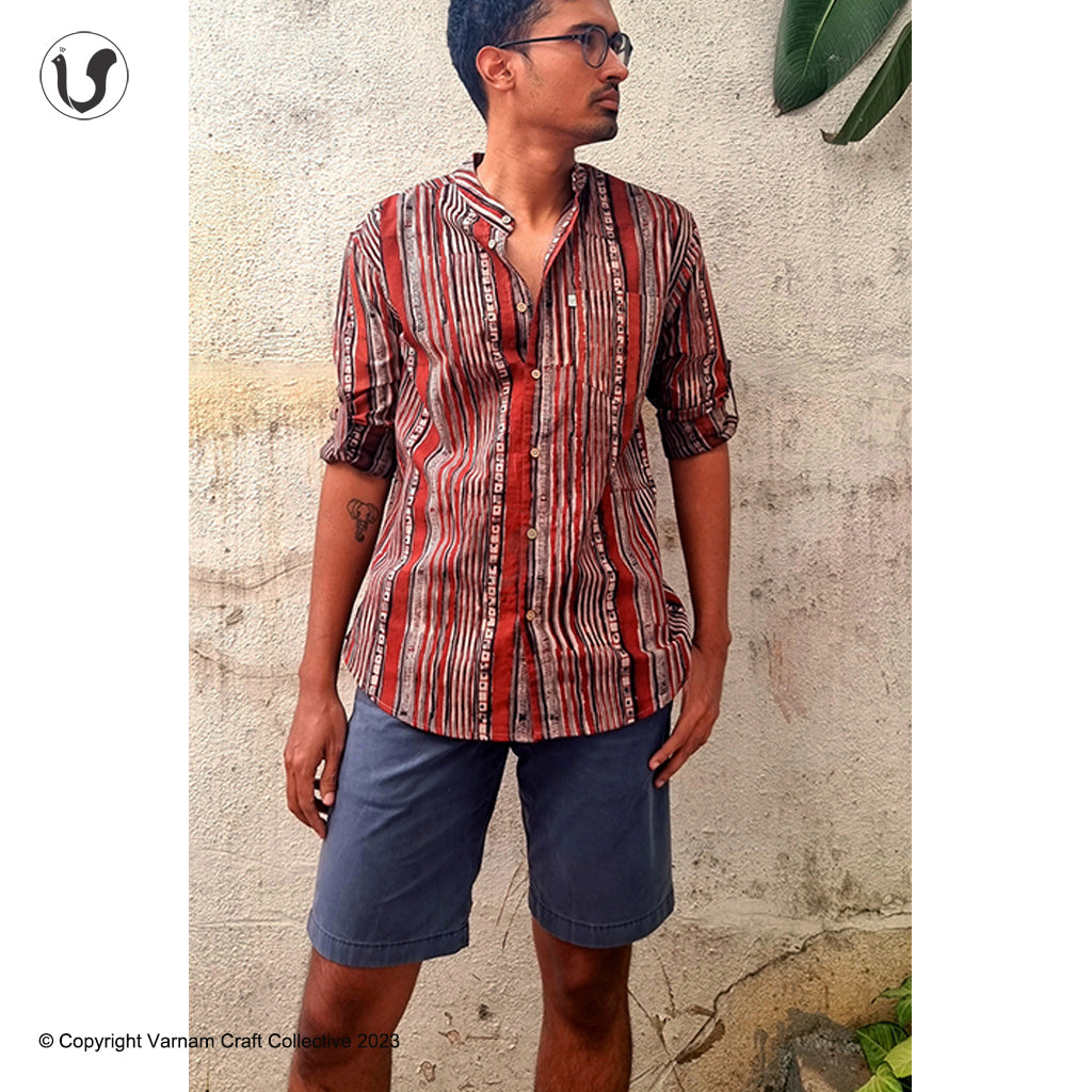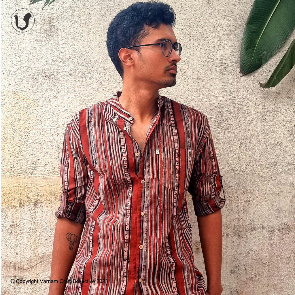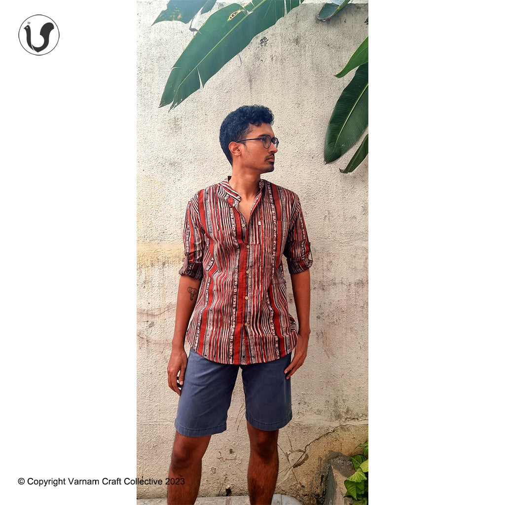 This cotton shirt is created using the traditional hand block printing craft of Ajrakh, in Rajasthan. The dyes are natural. This unisex shirt is gender neutral and can be worn by anyone.