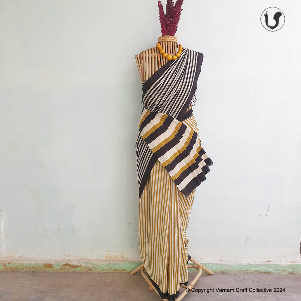 This uber soft cotton mulmul saree is a contemporary take on the traditional hand block printing craft of Bagru, Jaipur. These handblock prints have been custom made using natural dyes.