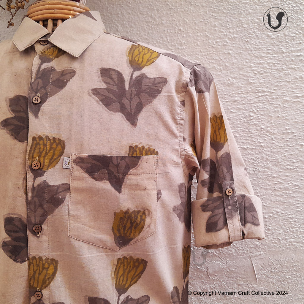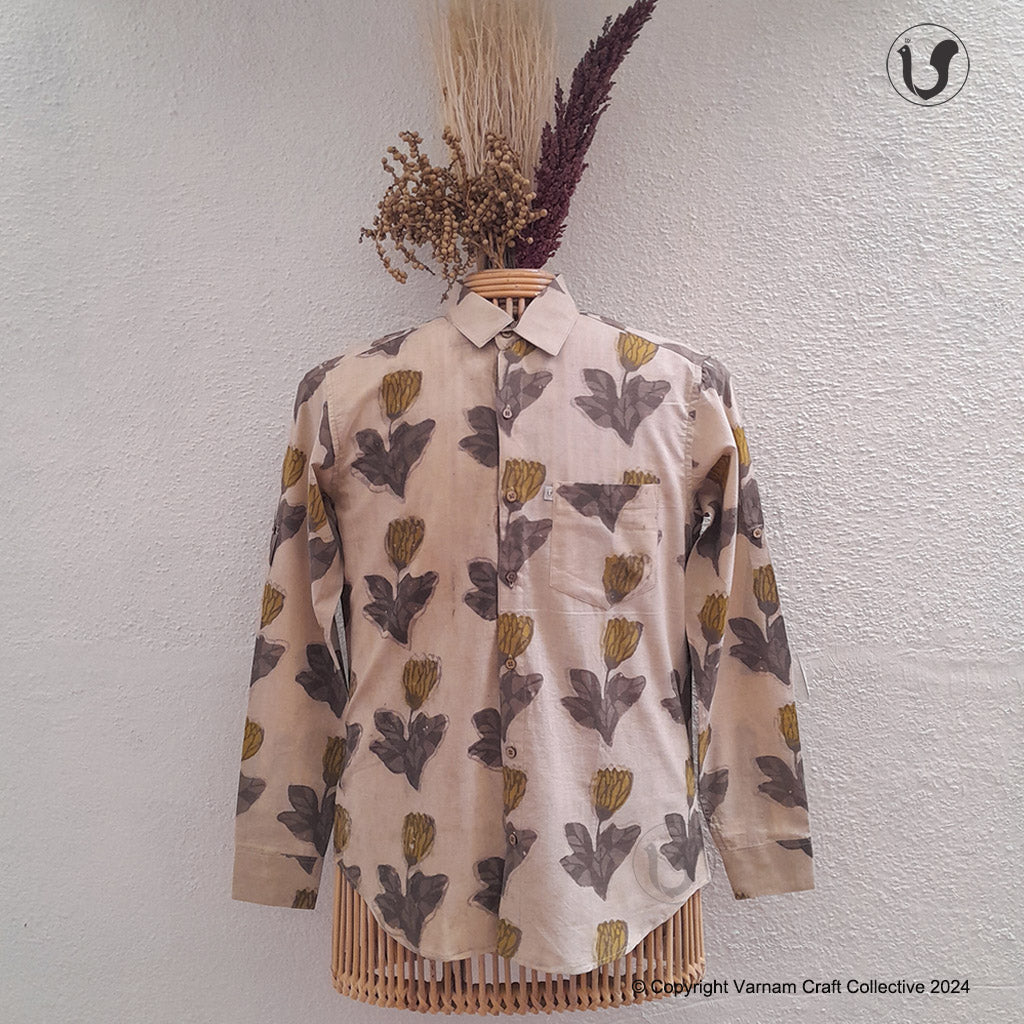 This uber soft cotton shirt is a contemporary take on the traditional hand block printing craft of Vanaspati block printing using natural dyes From Rajasthan .