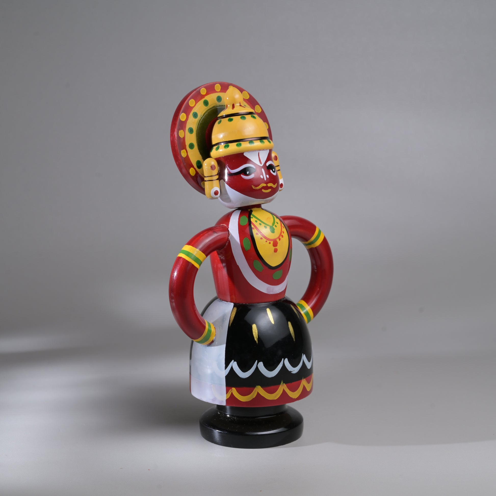 Kathakali, is one of the major dance forms of India from Kerala. Katha ~ story. Kali ~ kala or art. It is a form of dance drama. Of all classical Indian dances, Kathakali has the most elaborate costumes consisting of head dresses, face masks and vividly painted faces. It typically takes several hours to prepare a Kathakali troupe to get ready for a play. These dolls are no different. The wood is first turned on a lathe and then applied the base glossy colour using the traditional lac-turnery technique. And then the body and face are painted with oil paints. Please note that the price indicated is for a single unit only.