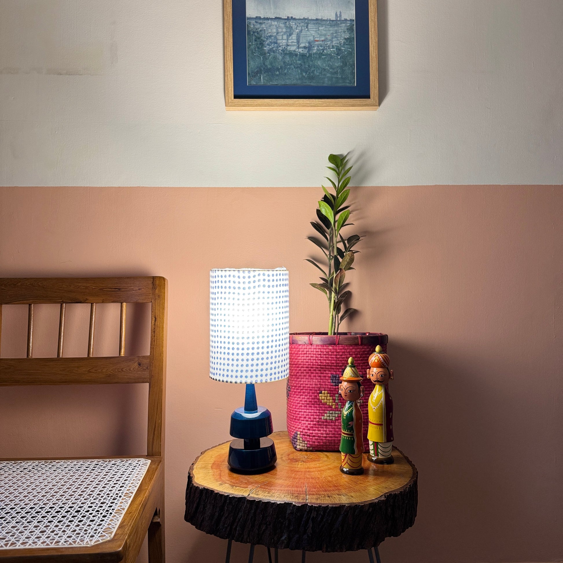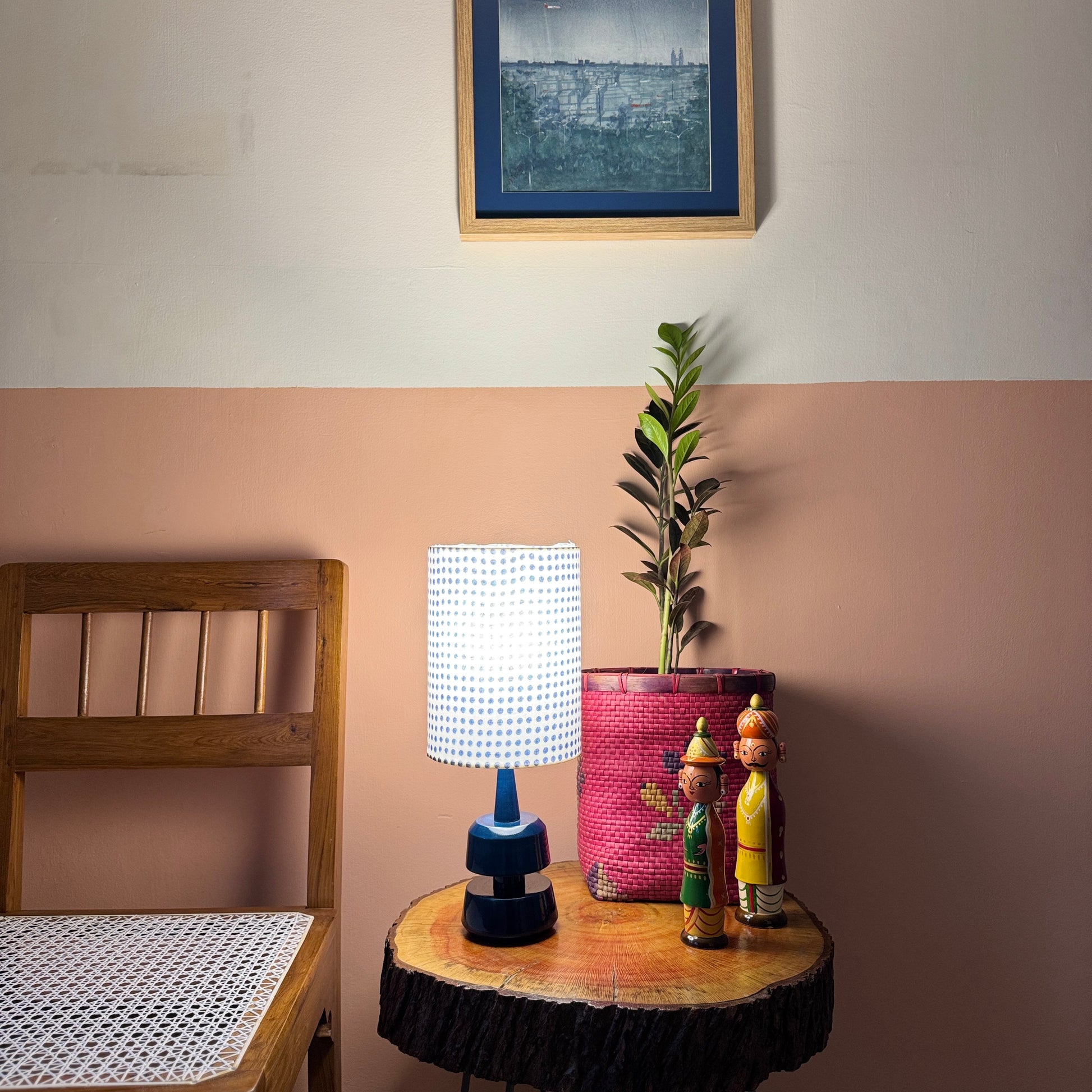 The cylindrical drum shade is made of premium handblock printed fabric from Sanganer, Rajasthan. The wooden base is made of Wrightia tinctoria, a medicinal plant and handturned in Channapatna, Karnataka. This product is thus a fusion of two beautiful crafts from South India.
