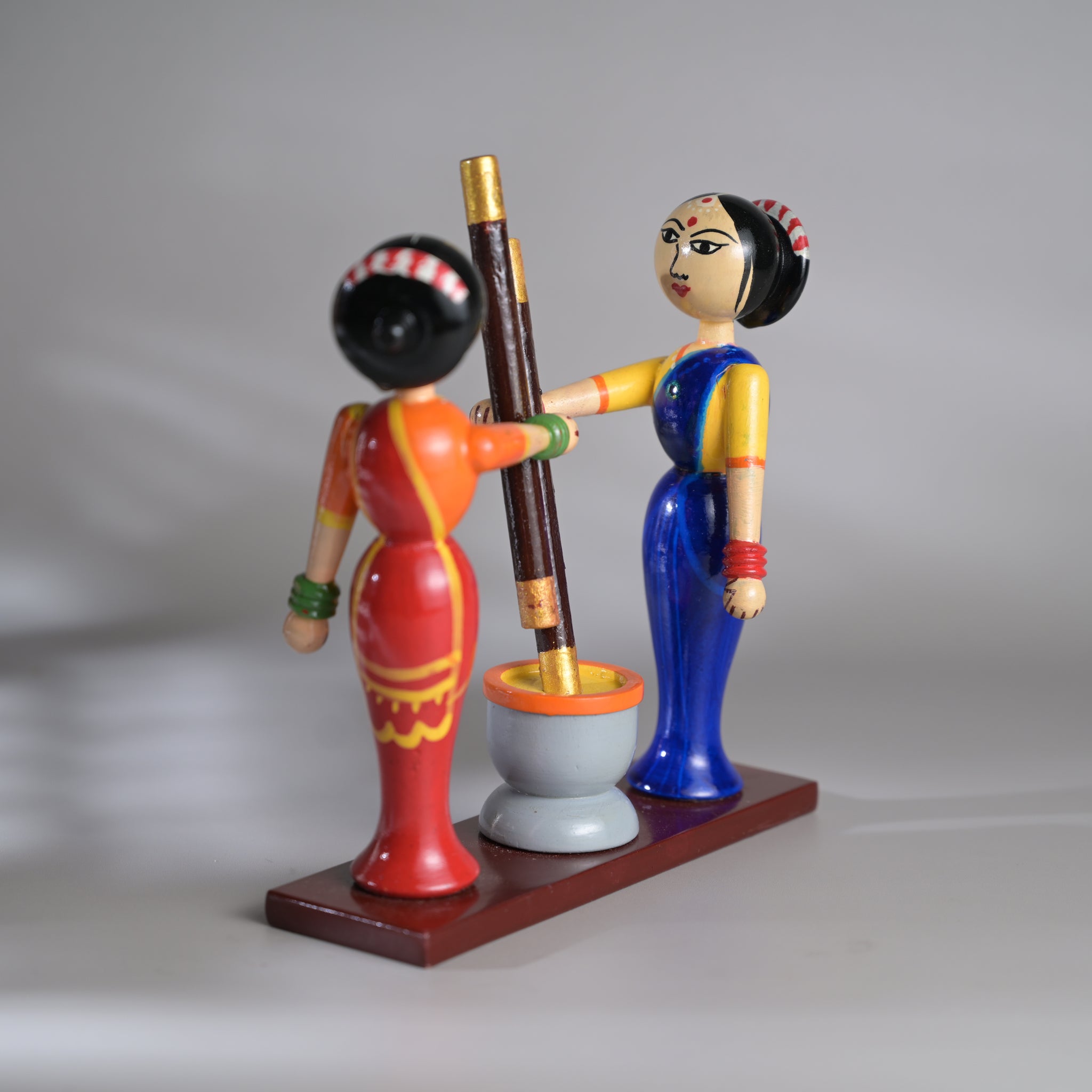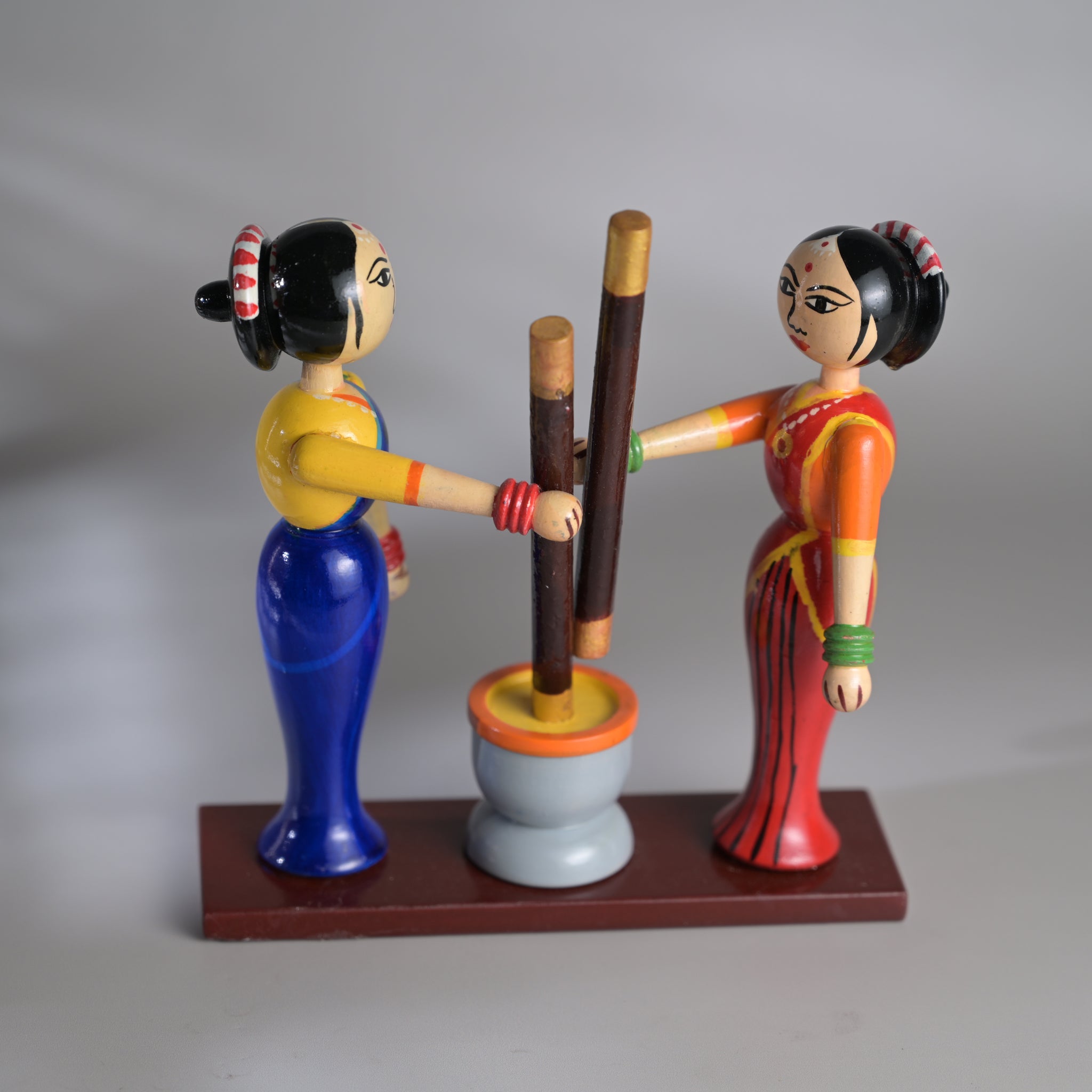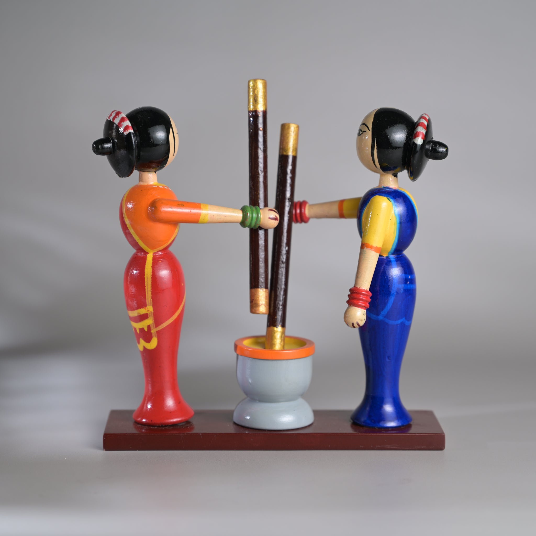 The Channapatna craft is traditionally associated with making dolls for the Dasara festival, many of which imitated the daily village life around them. Over the years, many of these traditional dolls stories were lost in the glitz and glamour of their contemporary machine made counterparts. The scene depicted here is that of two village women pounding spices for their cooking.