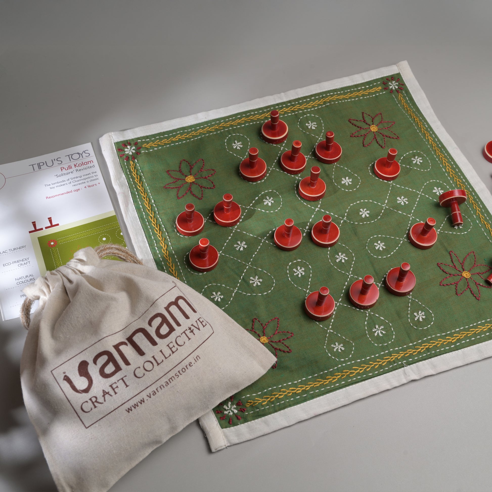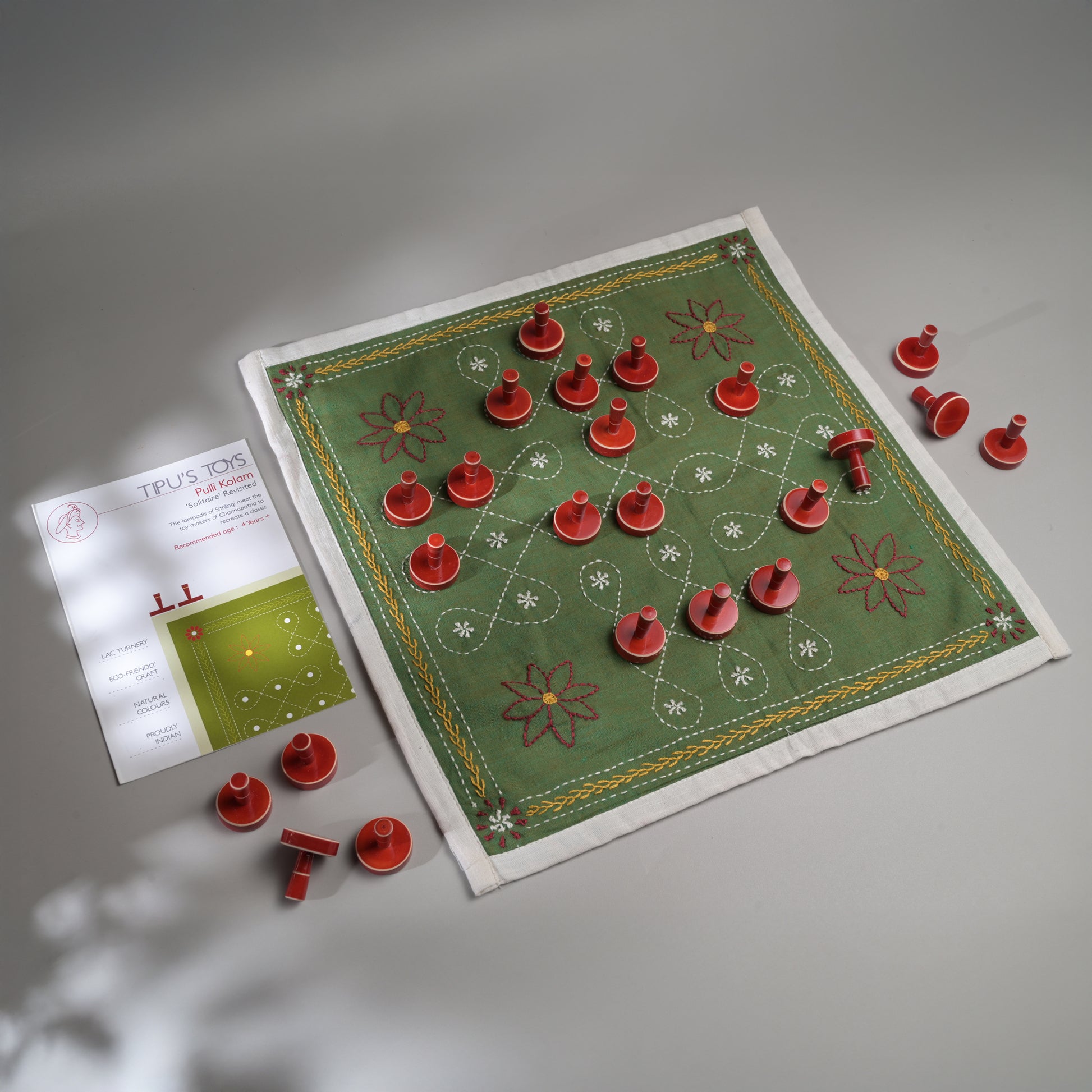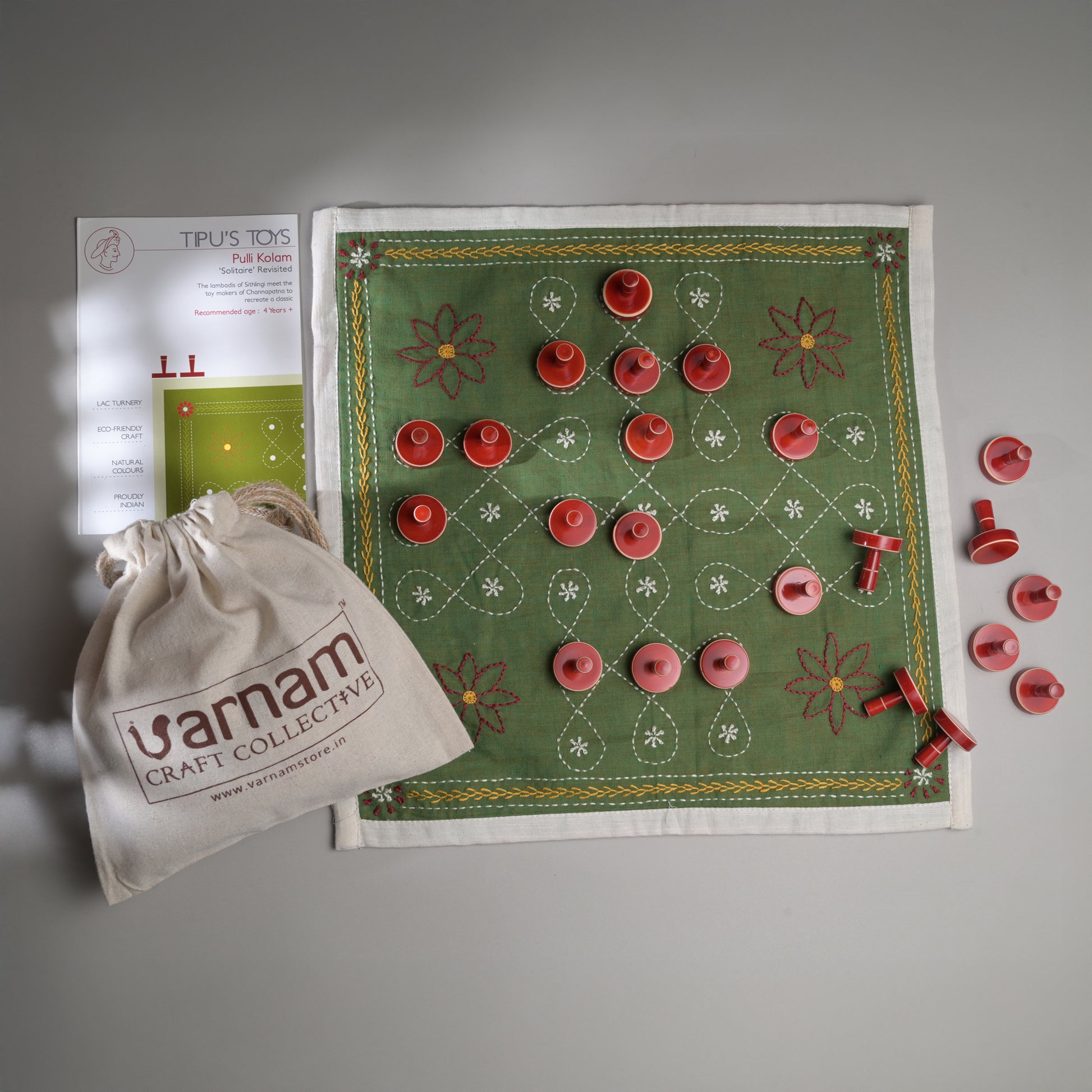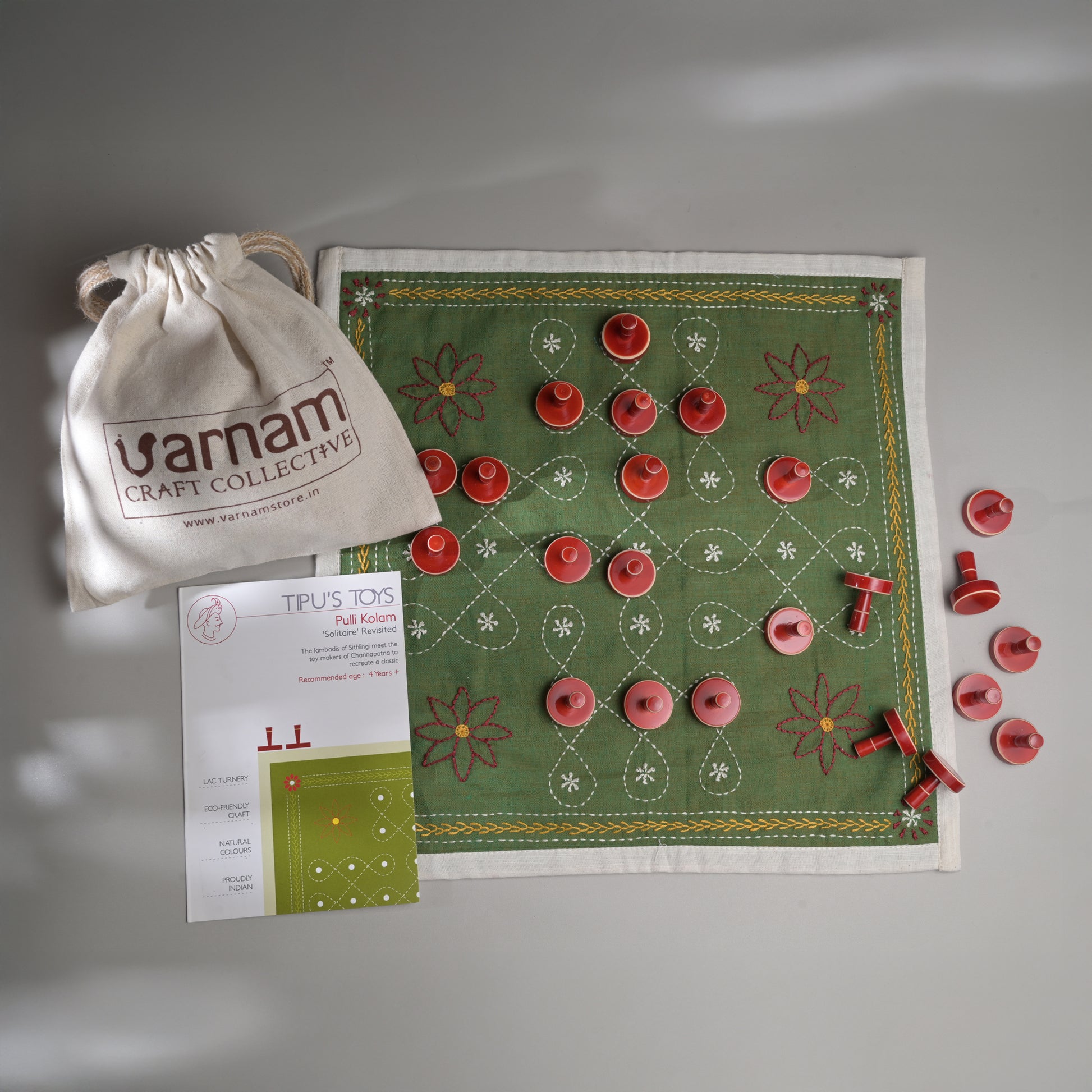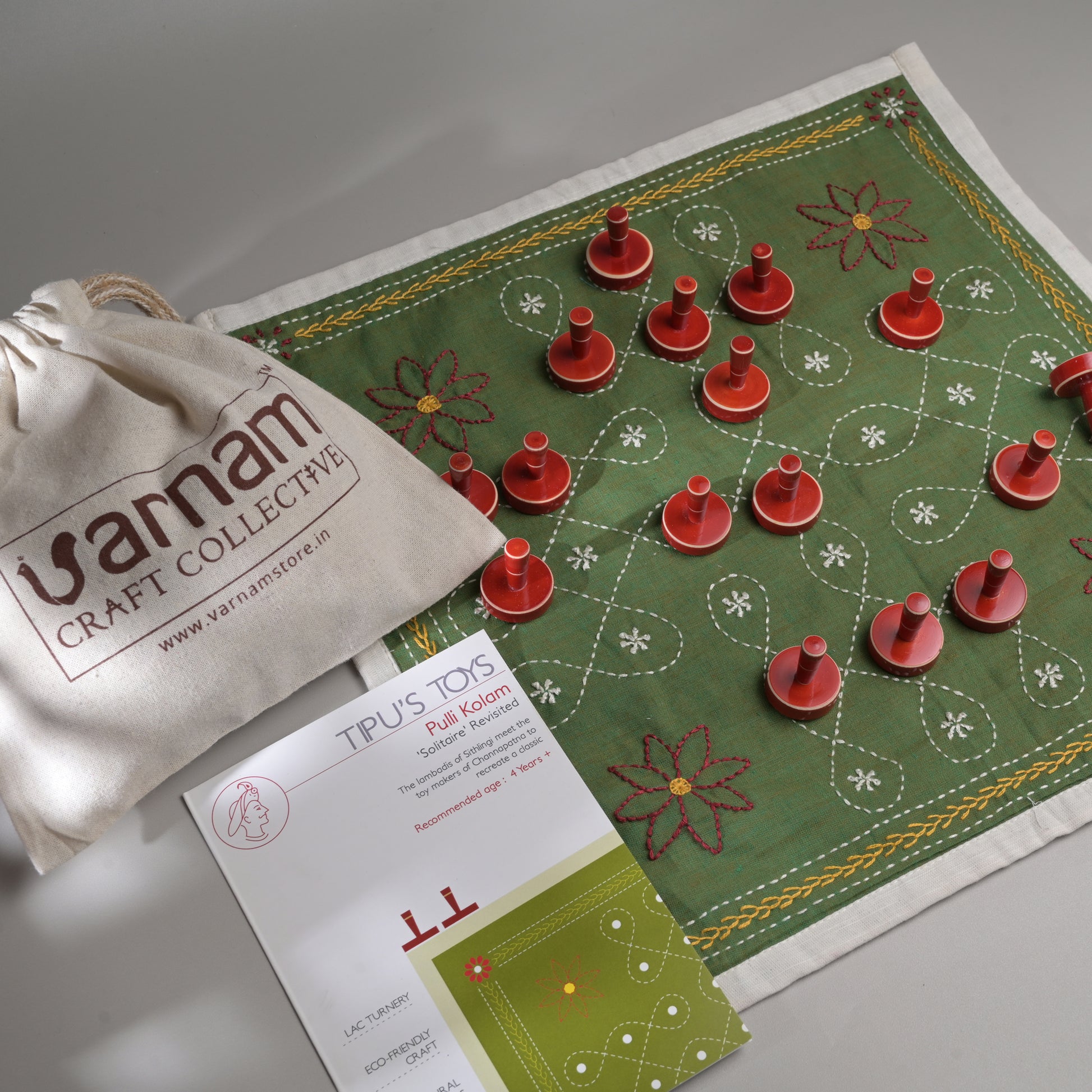To start the game, set up such that the 32 wooden channapatna pawns fill every pulli (or dot) of the kolam except the middle pulli. The objective is, making valid moves, to empty the entire board except for a solitary pawn in the central pulli (dot). Solitaire is played by one person and is therefore technically not a game but a puzzle.