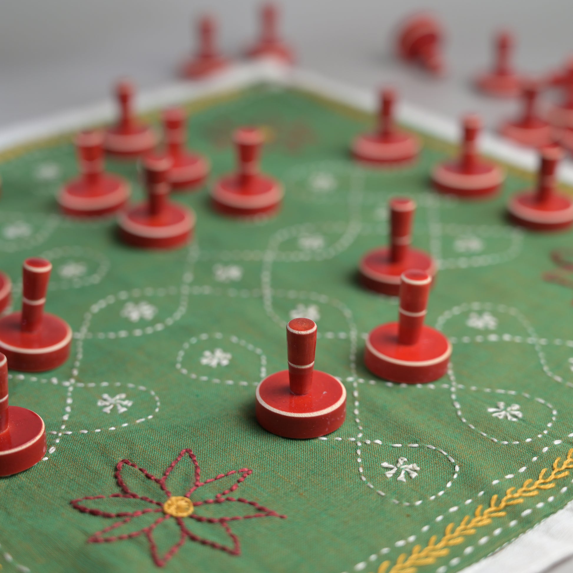 This product is a result of the ME to WE project, an initiative by A Hundred Hands, an NGO that encourages craftspeople across crafts, media and geographies to collaborate on design and innovation. Solitaire is a single-player game of concentration and skill. Traditionally ituses a set layout of tiles, pegs, stones or even cards. Most solitaire games function as a puzzle which, due to a different starting position, may (or may not) be solved in a different fashion each time. The first evidence of the game can be traced back to the court of Louis XIV and the specific date of 1687, with an engraving made that year of Anne De Rohan-Chabot, the Princess of Soubise, with the puzzle by herside. The August 1687 edition of the French literary magazine 'Mercure Galant' contains a description of the board, rules and sample problems. This is the first known reference to the game in print. The game is popularly known as 'Brainvita' in India where it is usually played with marbles on a wooden board. Our interpretation includes a hand embroidered mat with the holes being replaced by the traditionalpulli kolam (rangoli made using dots in South India).