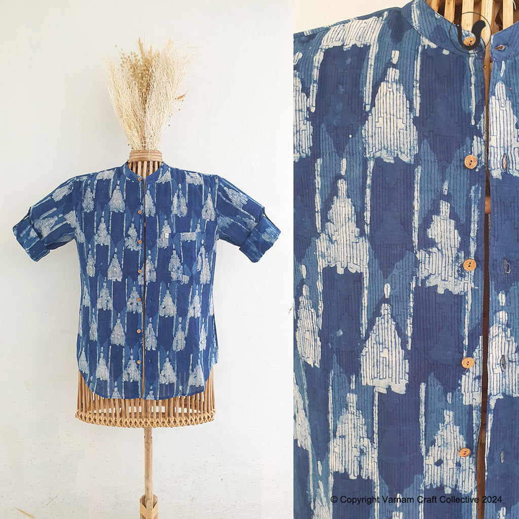 This uber soft, mulmul cotton shirt is a contemporary take on the hand block printing craft of Vanaspati, Jaipur using indigo dye.