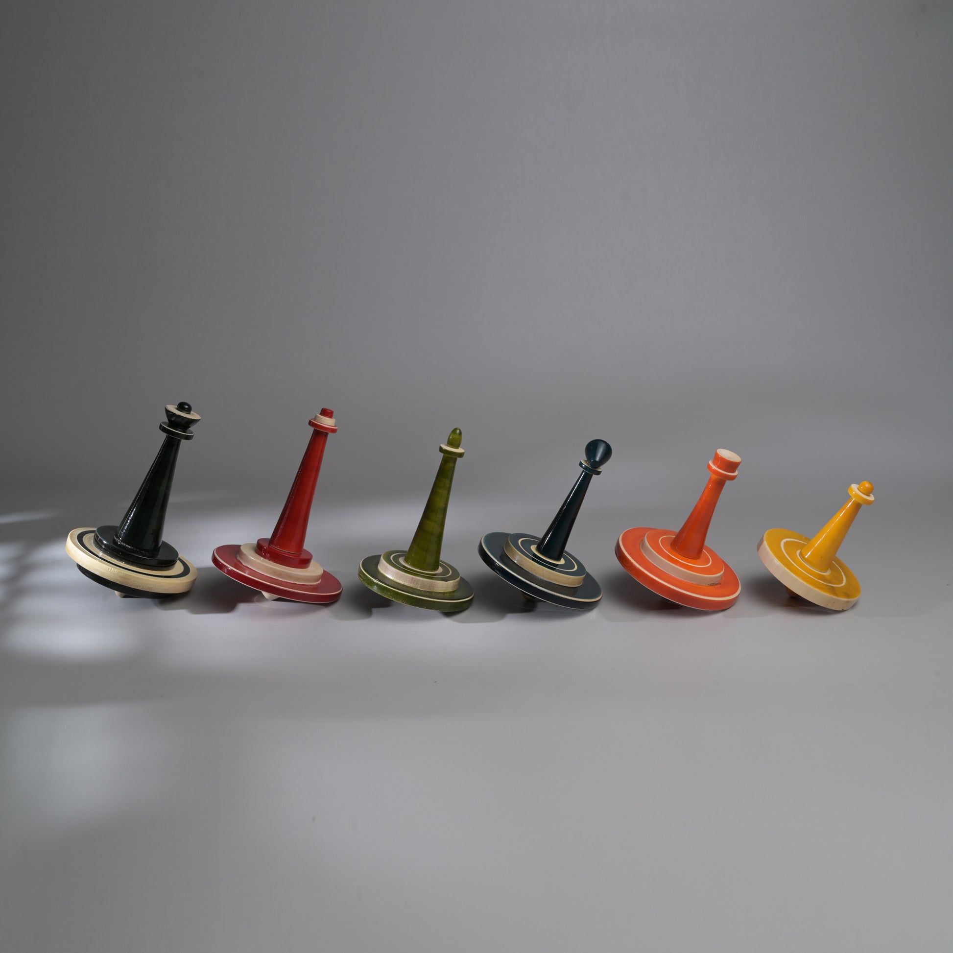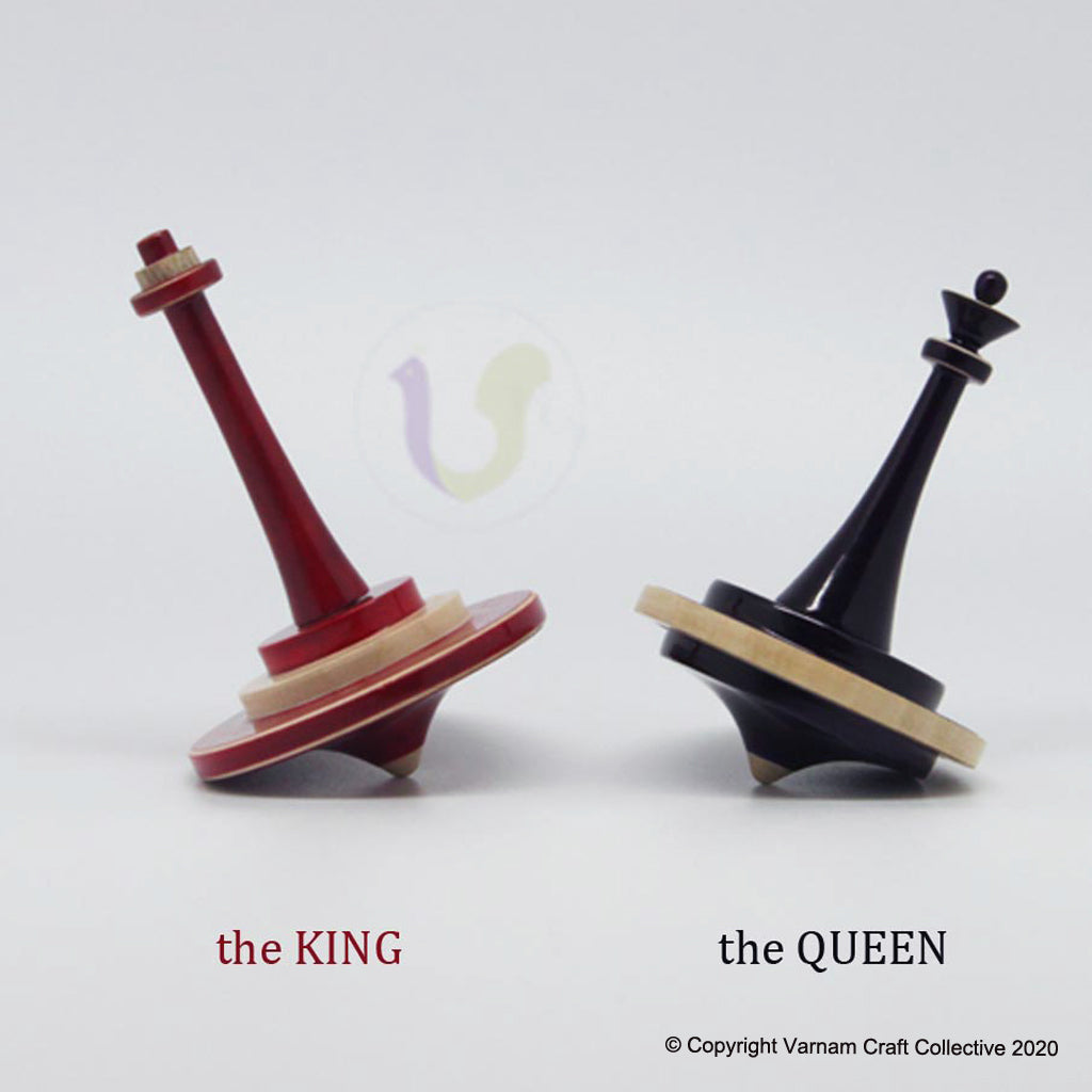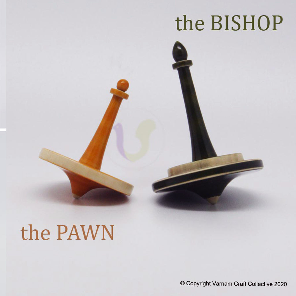 A nerdie twist on the spinning tops that channapatna is usually famous for. A set of 6 spinning tops inspired from the 'shatranj' or chess family. These include - the kind, queen, the rook, bishop, the knight and a pawn. Handcrafted by our artisans from channapatna, these light weight tops can spin for minutes at a stretch beautifully thanks to their aerodynamic design.