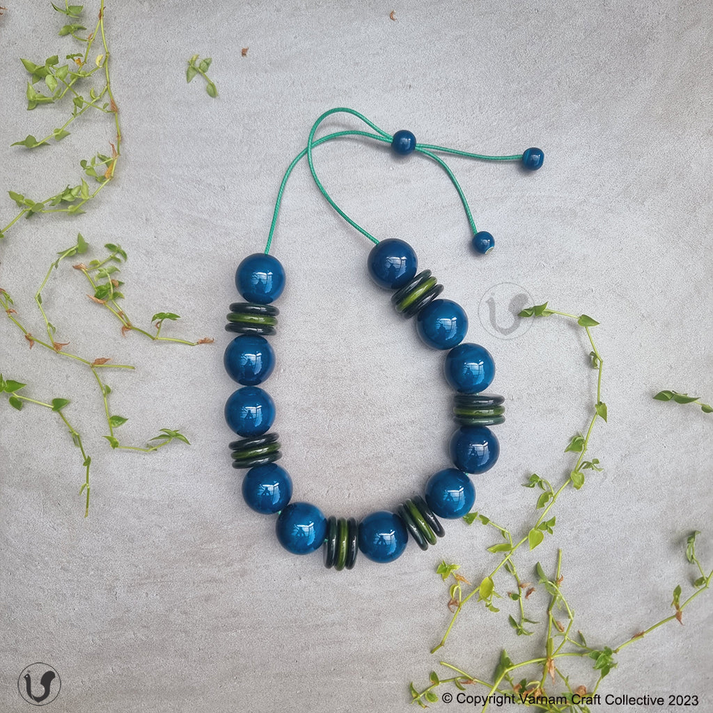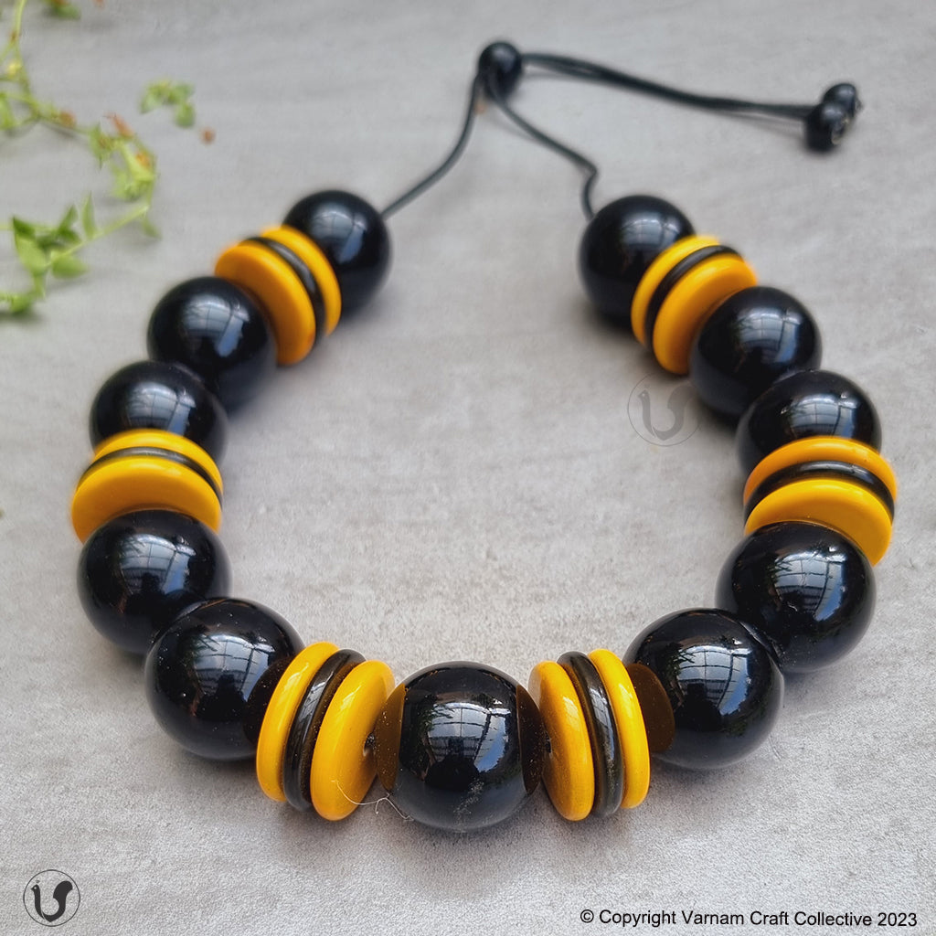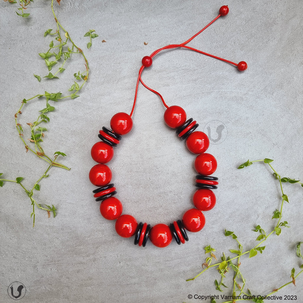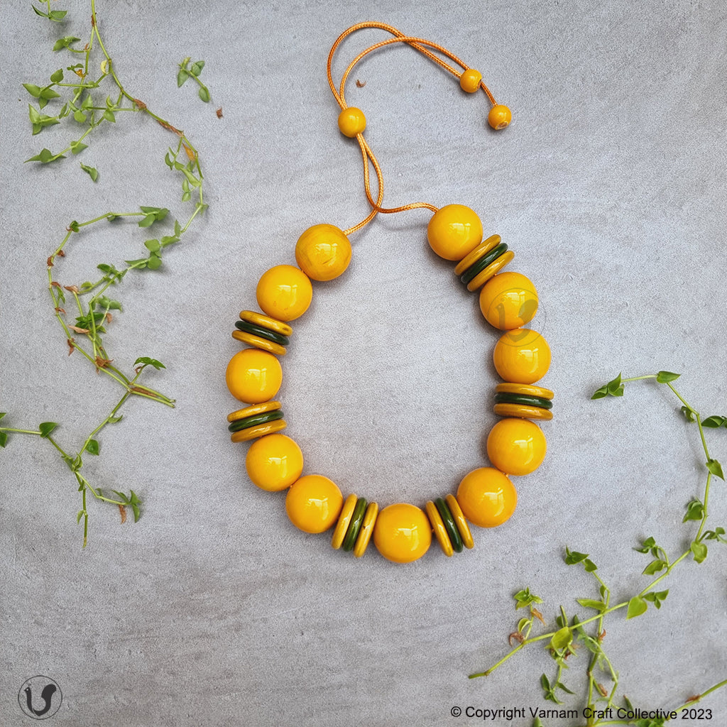 A unique one-of-a-kind style statement from the 'INBAM" series of wooden jewelry by Varnam. This piece has been handcrafted by artisans from Channapatna using the 200 year old toy craft of lac turnery. This is an eco-friendly craft. The colours used are natural dyes and non-toxic. The wood used , 'wrightia tinctoira' or ‘aale-maraa’ is extremely safe. Known for its medicinal properties, the wood is extremely lightweight. It comes in an attractive packaging which makes it a perfect gifting option too !