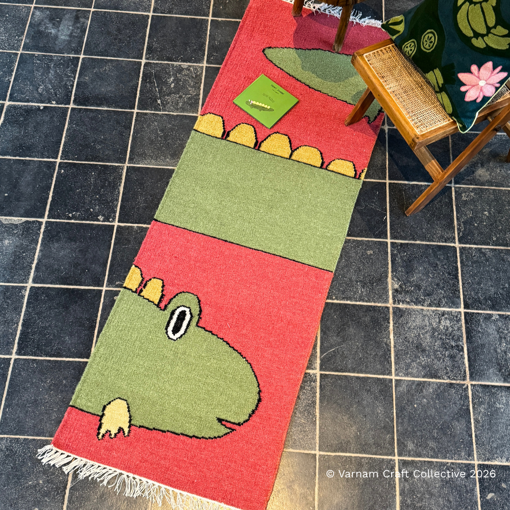 The Punja dhurries of Mirzapur are woven on traditional horizontal looms using the distinctive 'Punja' tool that gives the craft its name. These dhurries are traditionally known for their flat weave, durability and bold geometric patterns. Hence the snugglewalas with their more fluid designs provide a distinct innovation in the interpretations of these traditional dhurries.