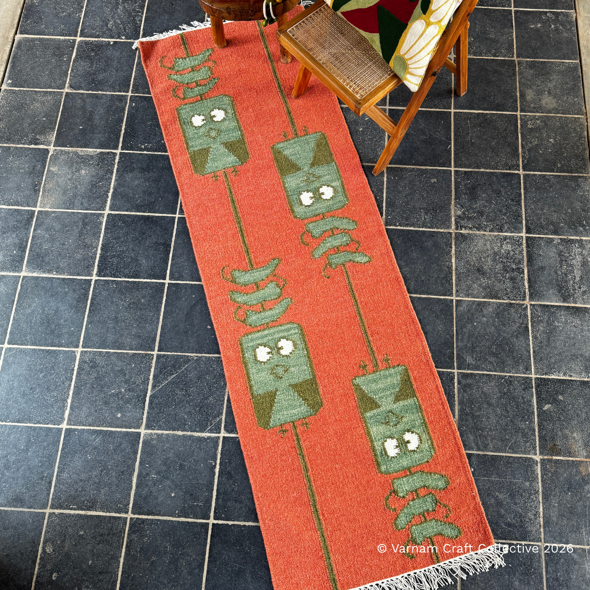 The Punja dhurries of Mirzapur are woven on traditional horizontal looms using the distinctive 'Punja' tool that gives the craft its name. These dhurries are traditionally known for their flat weave, durability and bold geometric patterns. Hence the snugglewalas with their more fluid designs provide a distinct innovation in the interpretations of these traditional dhurries.