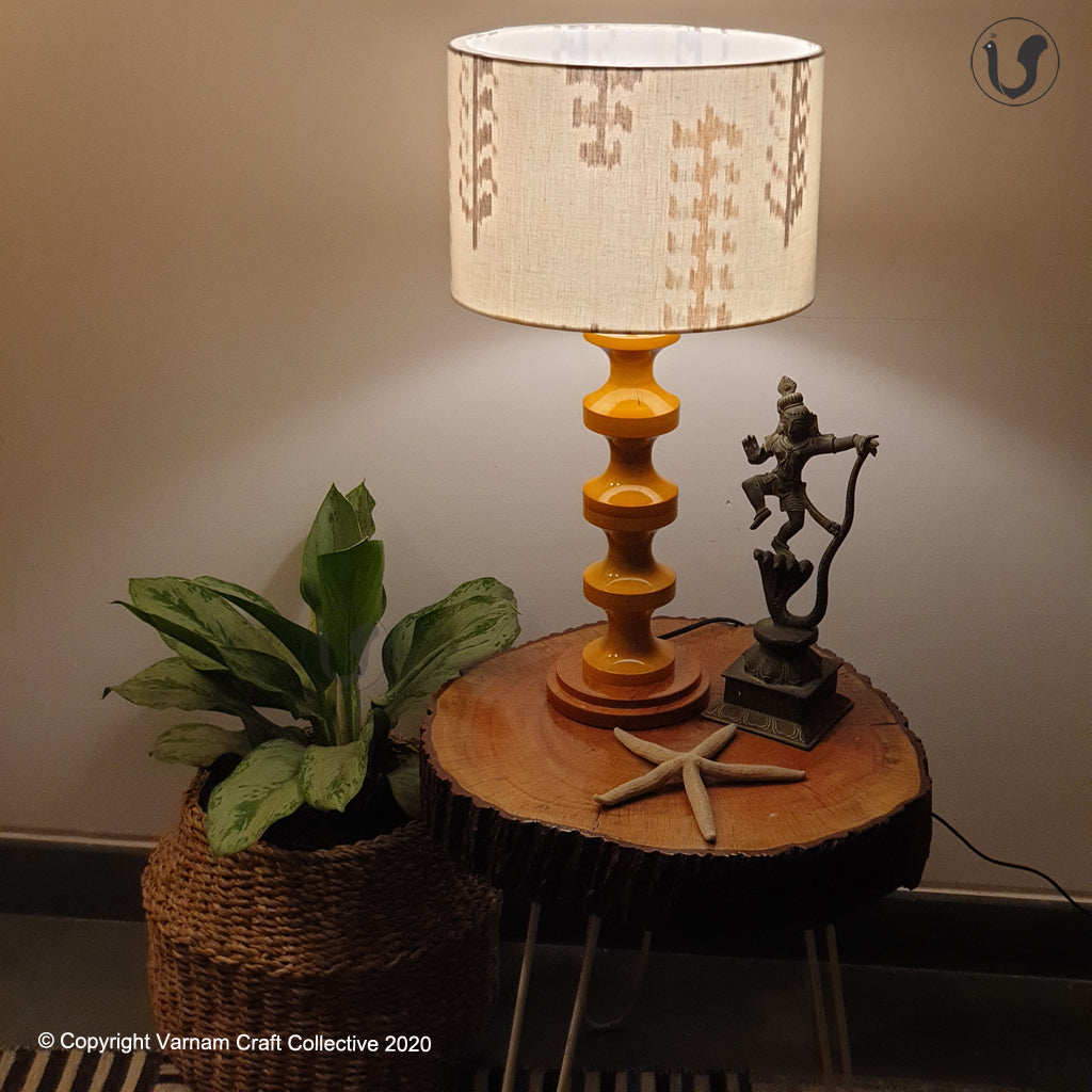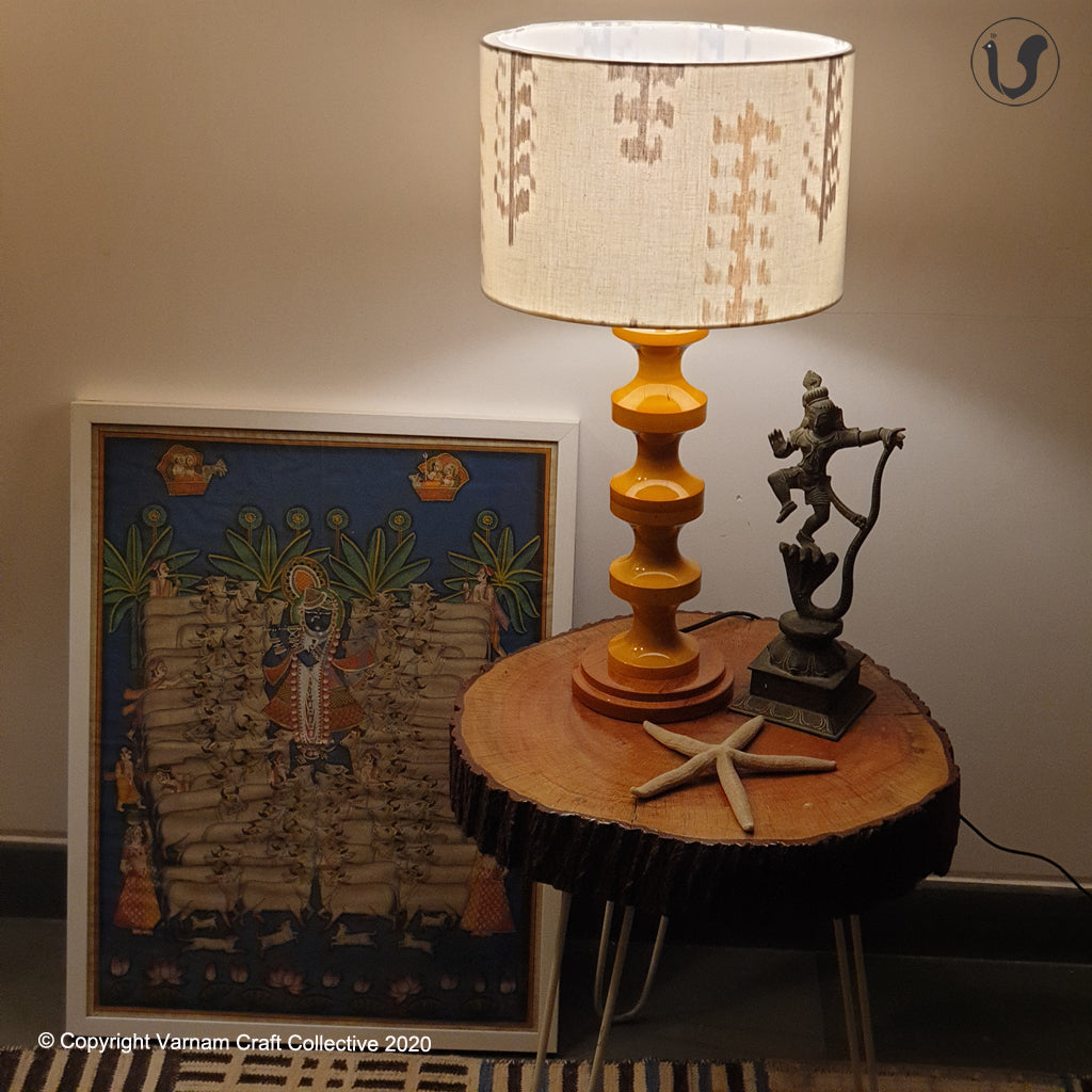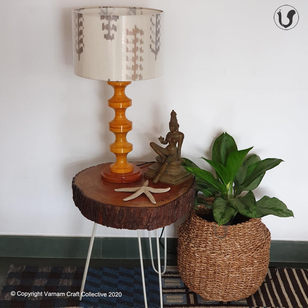 Our attempt to reinterpret the traditional toy craft of Channapatna translates to these one-of-a-kind statement lighting. These majestic swirl lamp bases would fit into any contemporary setting. One of our personal favourites, they make great bedside table lamps especially in pairs and even living room corner lights. The fittings are of export quality. The cylindrical shade is made of the handwoven ikat fabric of Telangana. The shade emits light beautifully creating a serene environment.