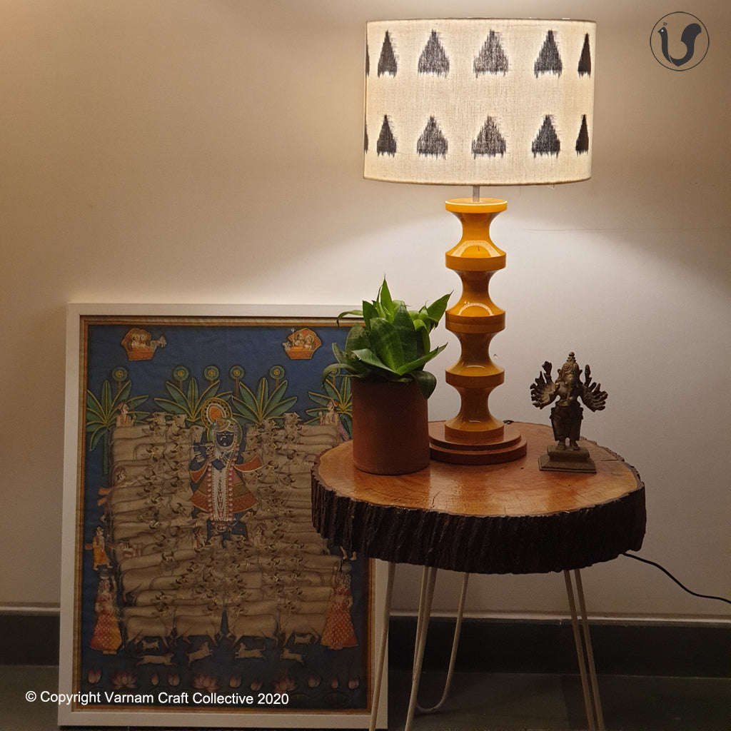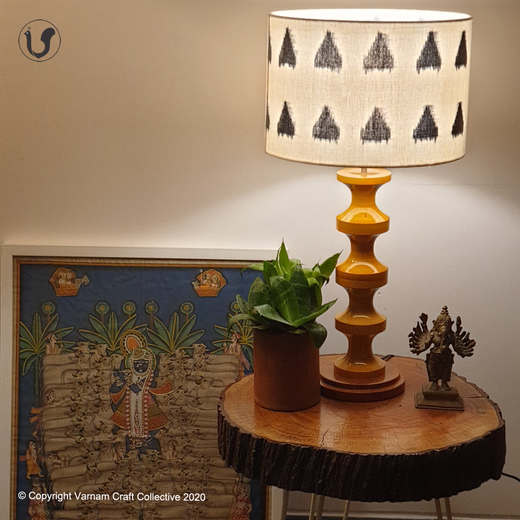Our attempt to reinterpret the traditional toy craft of Channapatna translates to these one-of-a-kind statement lighting. These majestic swirl lamp bases would fit into any contemporary setting. One of our personal favourites, they make great bedside table lamps especially in pairs and even living room corner lights. The fittings are of export quality. The cylindrical shade is made of the handwoven ikat fabric of Telangana. The shade emits light beautifully creating a serene environment.