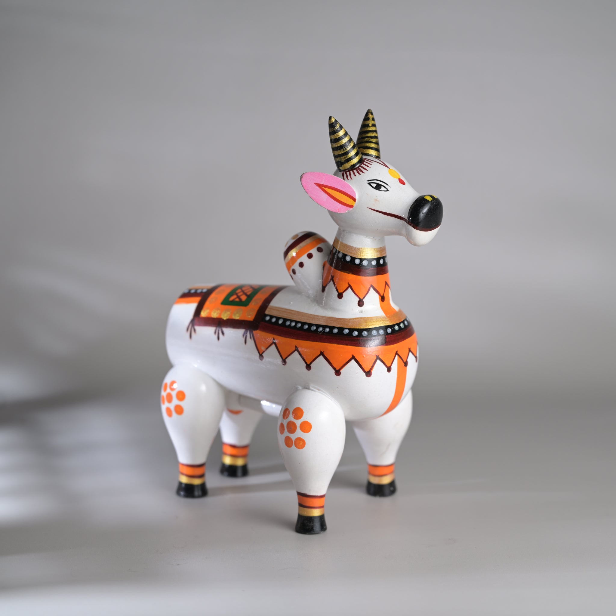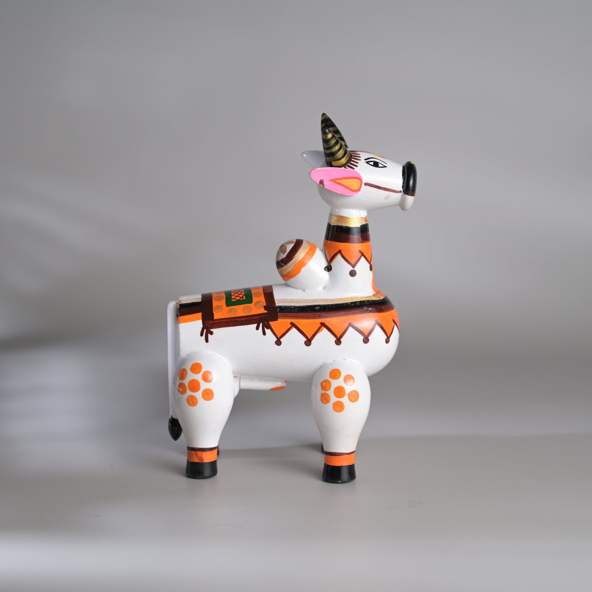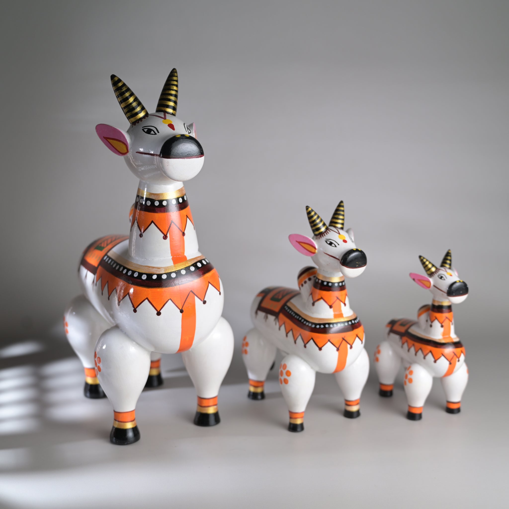 The Basavas or the bulls are the iconic and popular designs amongst the Dasara dolls. This is a part of our initiative to revive the traditional doll stories of Channapatna, Karnataka. Each piece is made of wrightia tinctoria or hale mara, a safe and naturally seasoned medicinal plant wood. The wood is first turned on a lathe and then applied the base glossy colour using the traditional lac-turnery technique. And then they have been painted over with safe, non-toxic oil-paints. However these are not suitable for children. Please note that the colours may vary a little bit from the one in the pics.