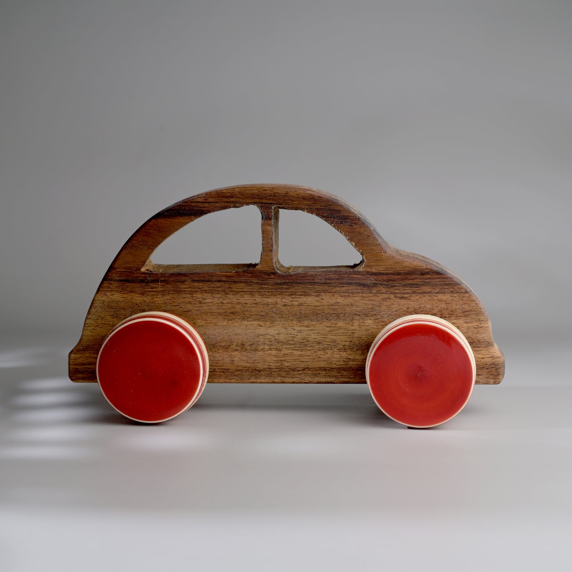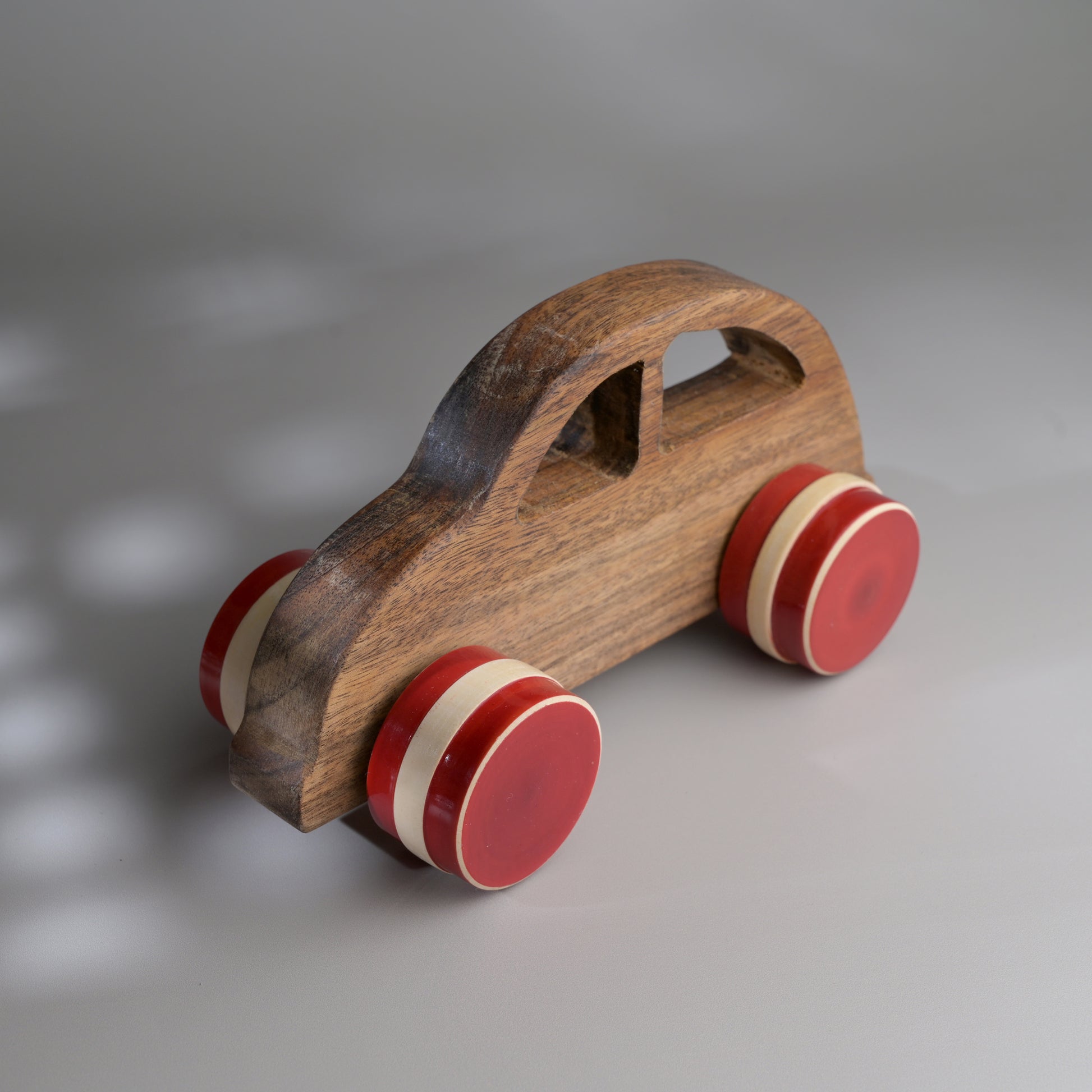The wooden toys are handcrafted from natural Acacia wood and treated with non-toxic natural Tung oil. The toys are child safe. The colorful wheels are handmade by our Artisans in Channapatna, Karnataka using the traditional lacquer ware turning technique. The wood used for all channapatna lac-ware products is completely safe and is 100% eco-friendly. Any irregularities on the wood are part of its natural beauty.