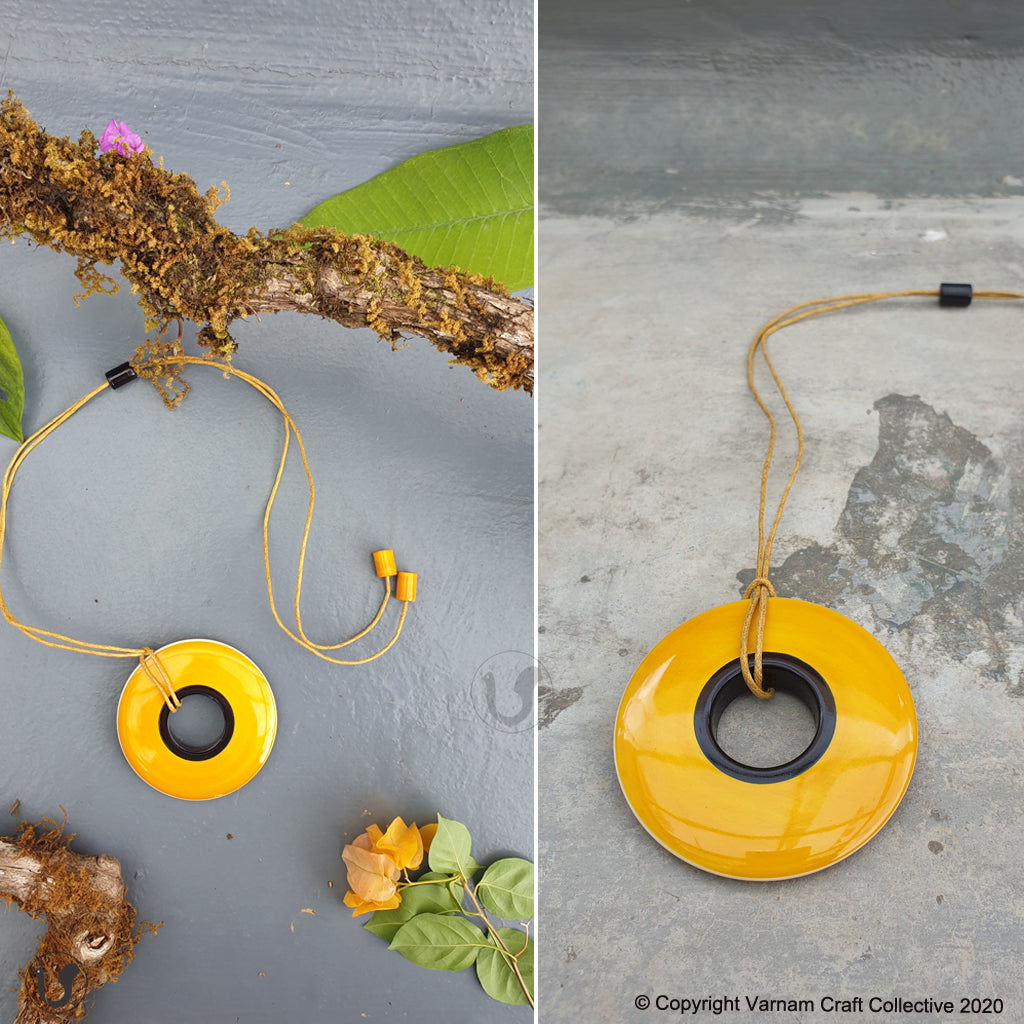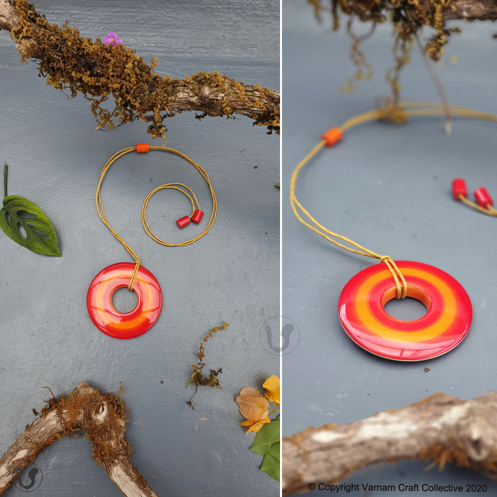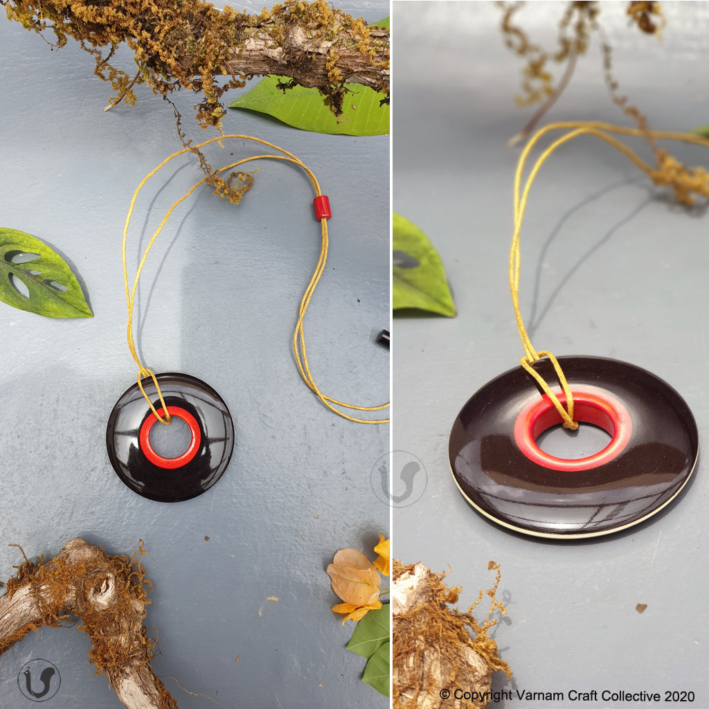 A unique one-of-a-kind style statement from the 'INBAM" series of wooden jewelry by Varnam. This piece has been handcrafted by artisans from Channapatna using the 200 year old toy craft of lac turnery. This is an eco-friendly craft. The colours used are natural dyes and non-toxic. The wood used , 'wrightia tinctoira' or ‘aale-maraa’ is extremely safe. Known for its medicinal properties, the wood is extremely lightweight. It comes in an attractive packaging which makes it a perfect gifting option too !