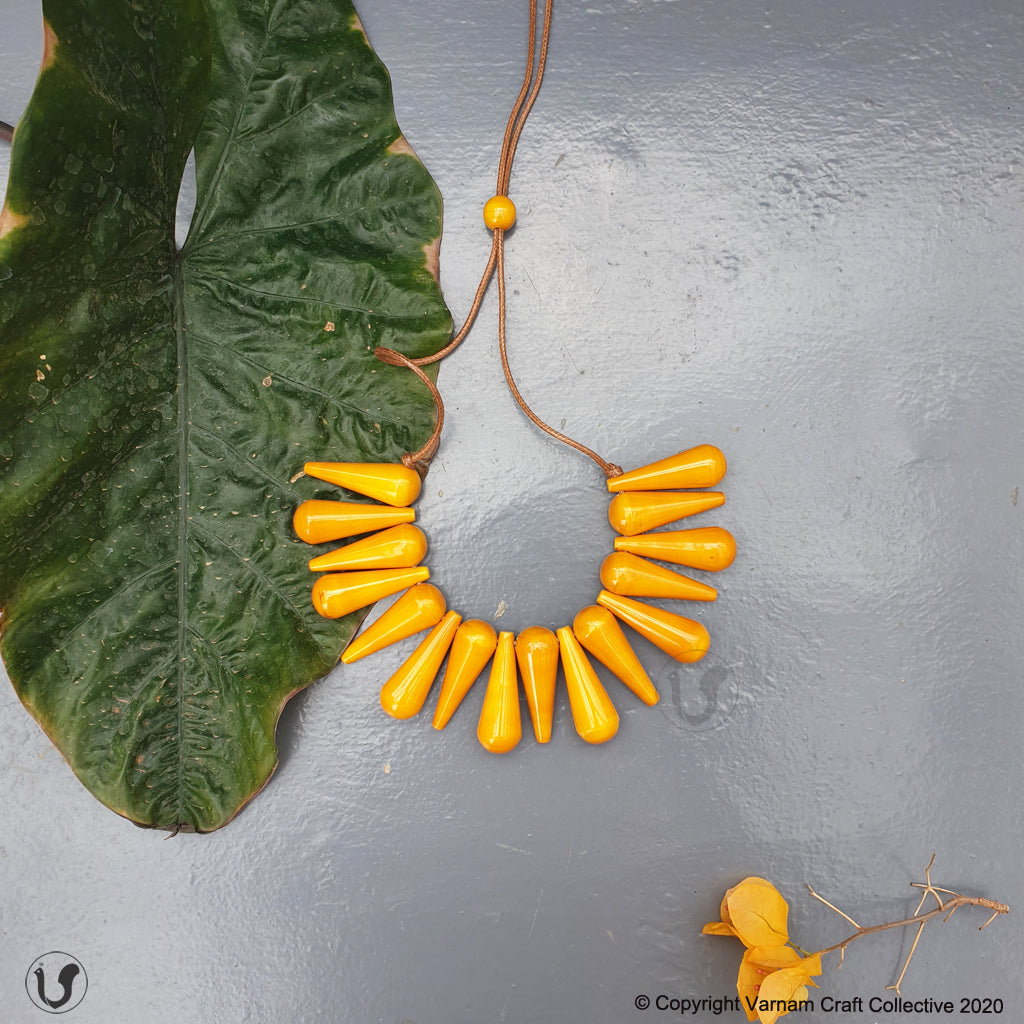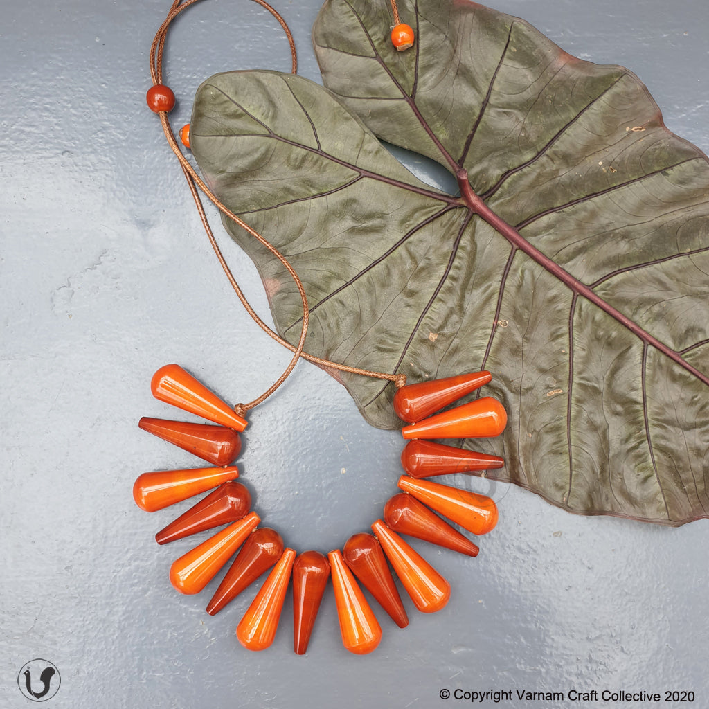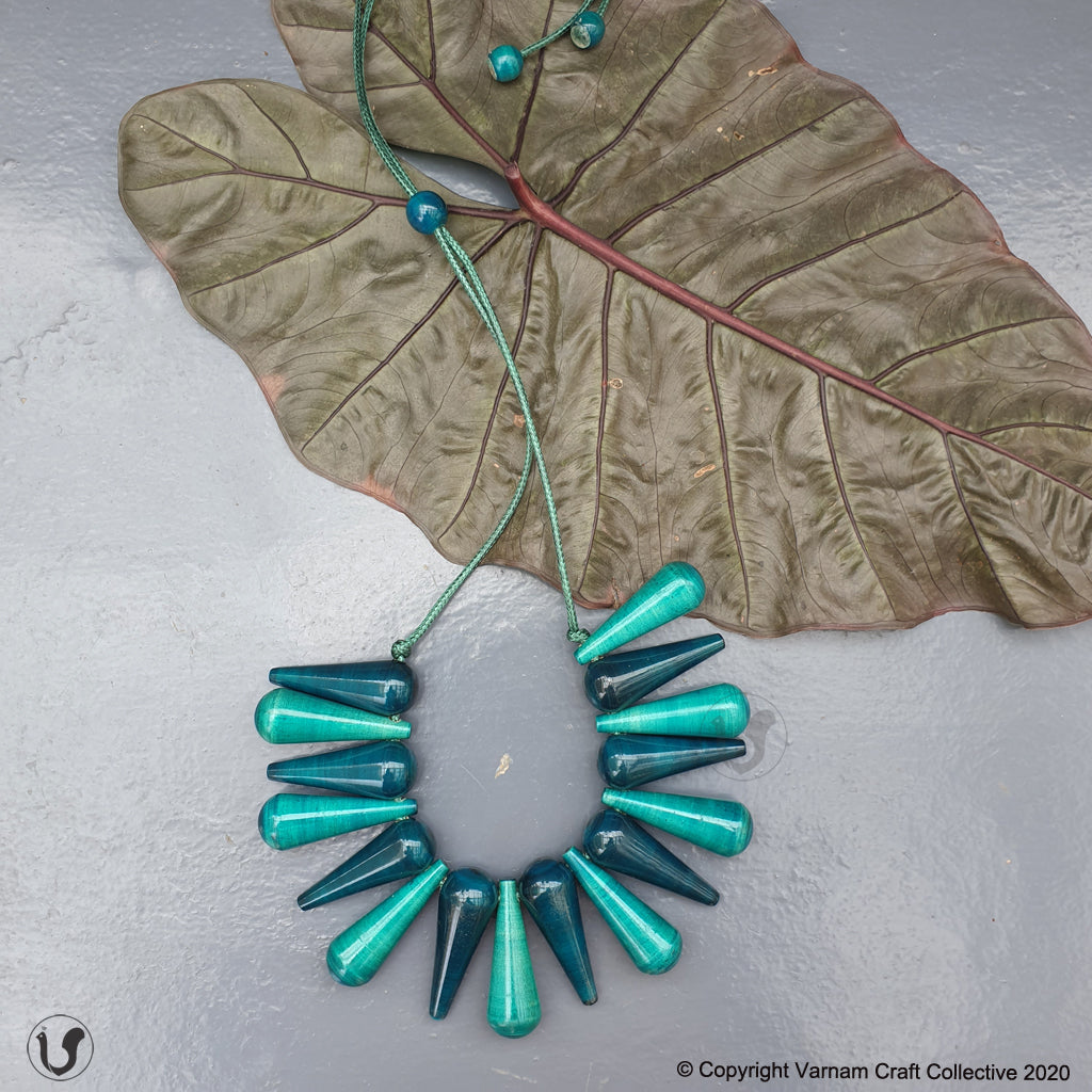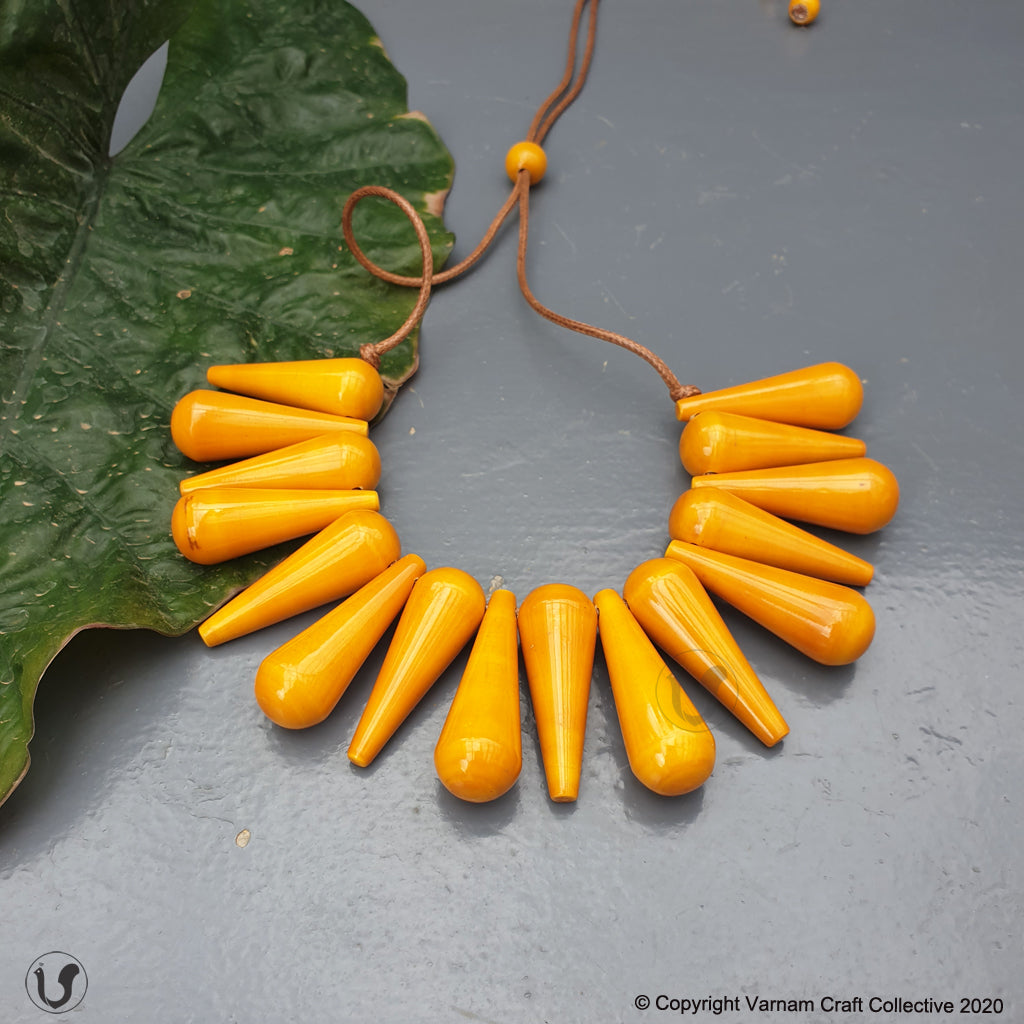 A unique one-of-a-kind style statement from the 'INBAM" series of wooden jewelry by Varnam. This piece has been handcrafted by artisans from Channapatna using the 200 year old toy craft of lac turnery. This is an eco-friendly craft. The colours used are natural dyes and non-toxic. The wood used , 'wrightia tinctoira' or ‘aale-maraa’ is extremely safe. Known for its medicinal properties, the wood is extremely lightweight. It comes in an attractive packaging which makes it a perfect gifting option too !