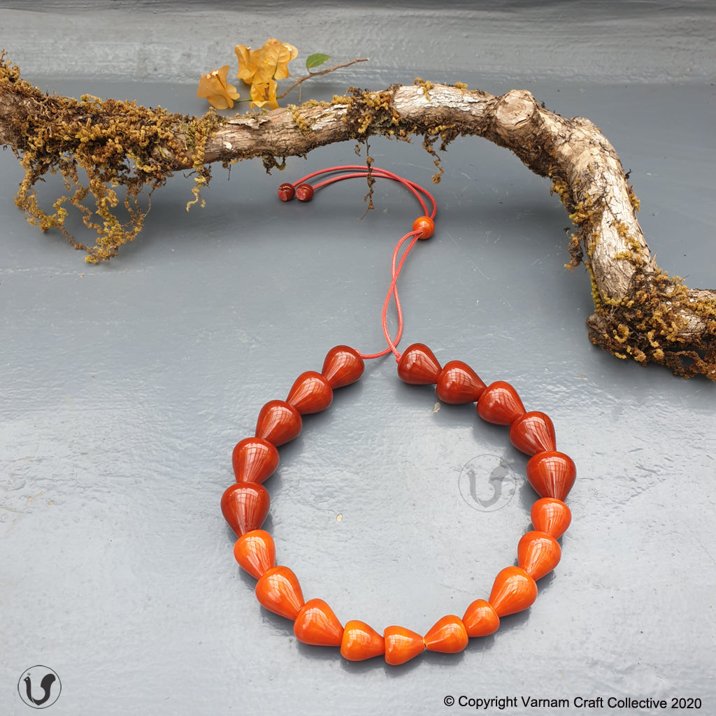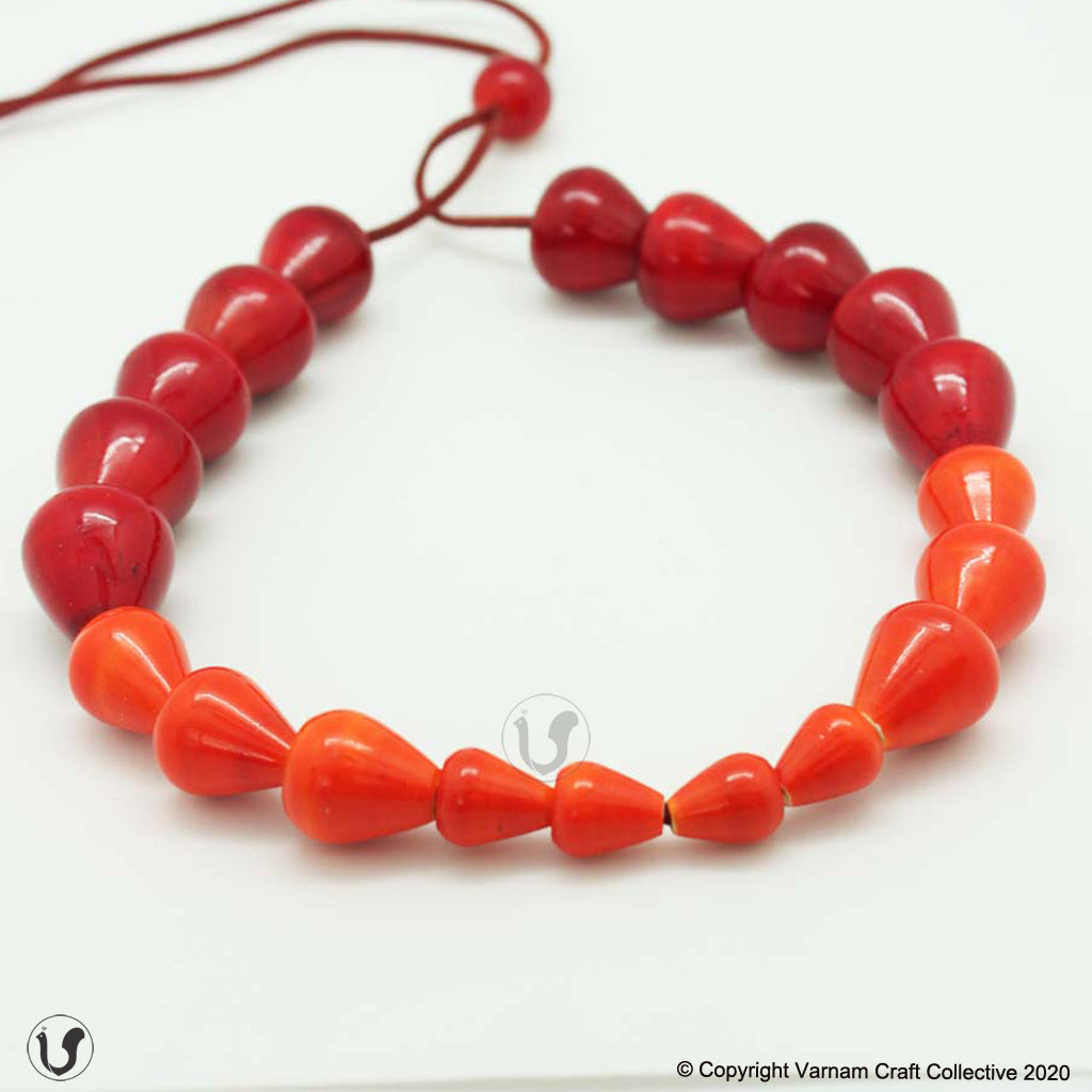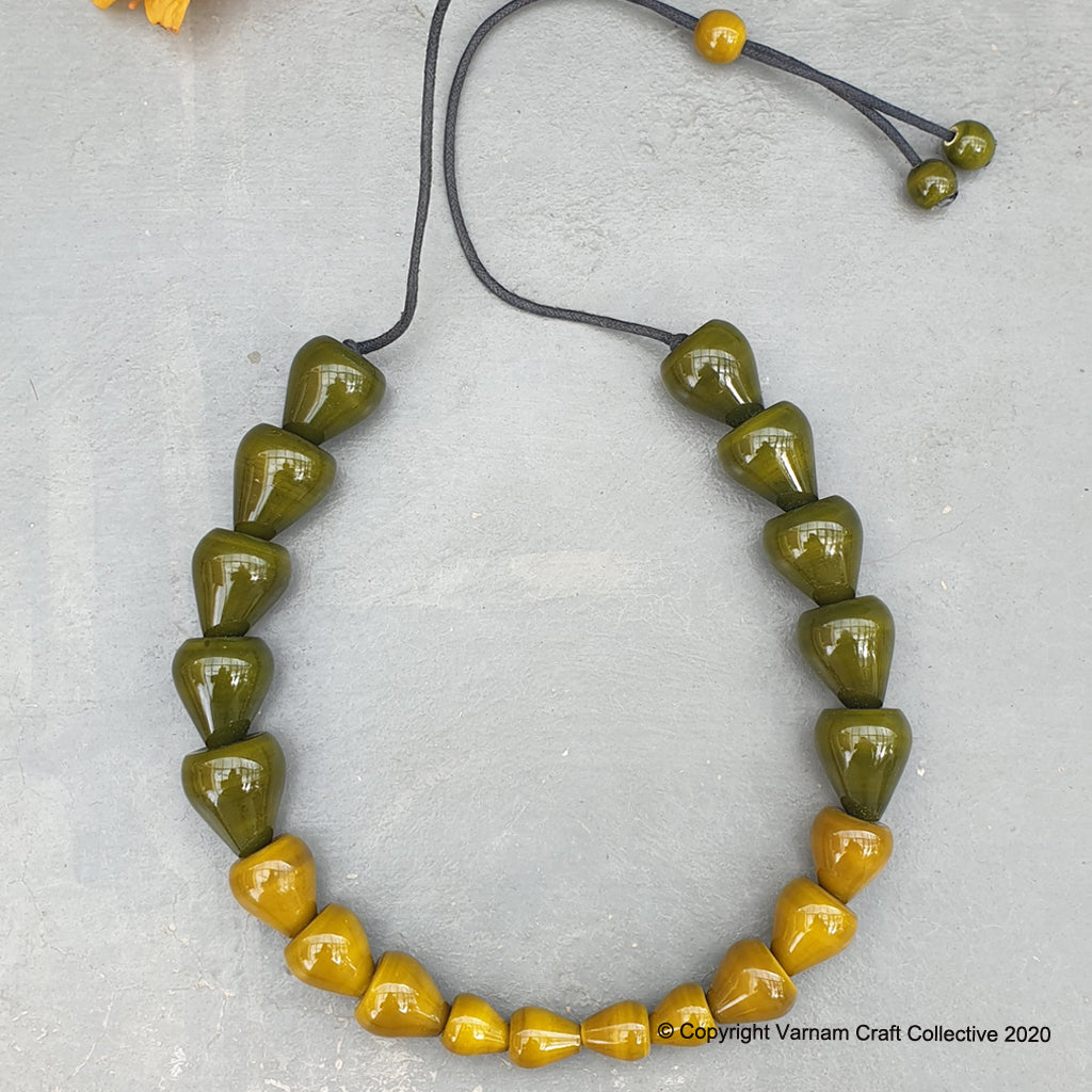 A unique one-of-a-kind style statement from the 'INBAM" series of wooden jewelry by Varnam. This piece has been handcrafted by artisans from Channapatna using the 200 year old toy craft of lac turnery. This is an eco-friendly craft. The colours used are natural dyes and non-toxic. The wood used , 'wrightia tinctoira' or ‘aale-maraa’ is extremely safe. Known for its medicinal properties, the wood is extremely lightweight. It comes in an attractive packaging which makes it a perfect gifting option too !